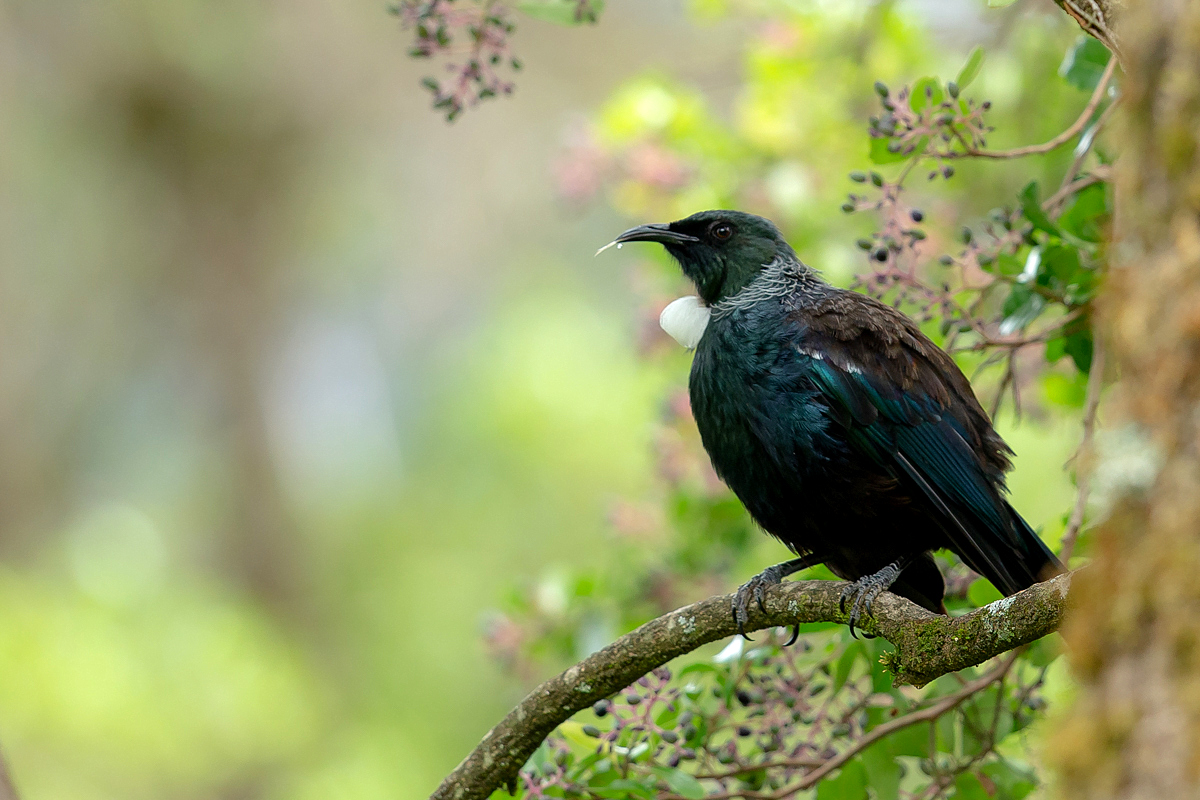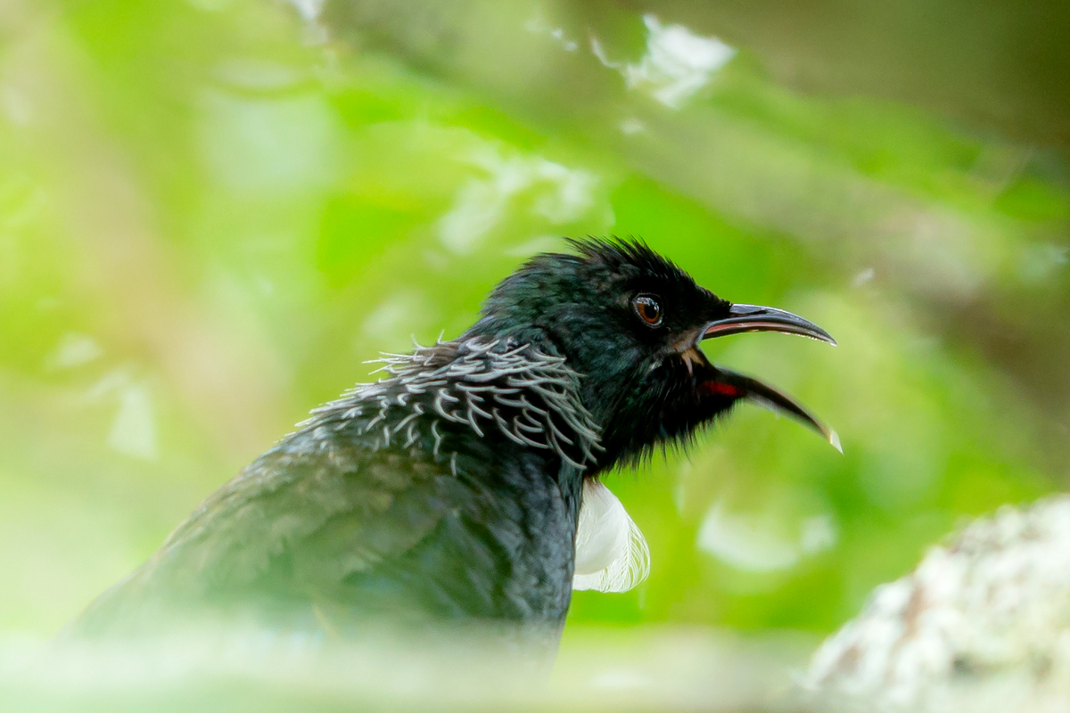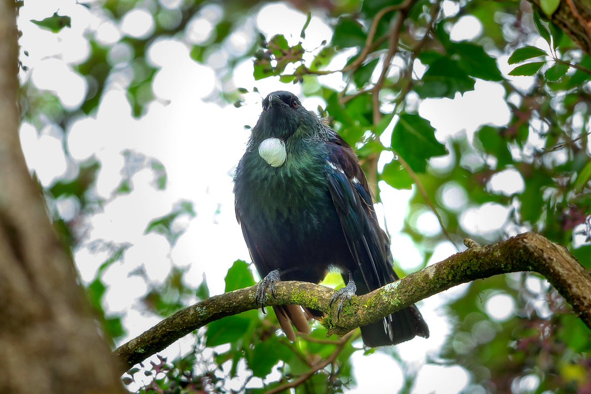 The beautiful voice of tui led me to its habitat. I gravitated to its dwelling, attracted to the melody of its song. The bushes and thickets can be entered without anxiety in New Zealand, as neither venomous serpents nor insects live there. In comparison with Australia, New Zealand, like Poland, appears to pose no dangers to the visitor. Amidst the trees, one can observe a few tuis and New Zealand pigeons  The tuis belong to the endemic group of honeyeaters that inhabit the northern island of New Zealand only. The ornamental white feathers that cover its underbelly make it look amazing. They only perform a decorative function. When you look at the picture, please turn on the audio recording. The recording does not do justice to the actual beauty of the sound that the bird produces, as I was recording the bird in a place close to the busy road. Still, I recommend to listen its song here via my own website. An interesting fact concerning the tui is its ability to imitate all kinds of sounds it hears. The New Zealanders are fond of this bird and of its singing and are proud of it. I came across this species only once and I was happy to take a lot of photos of this unique bird.