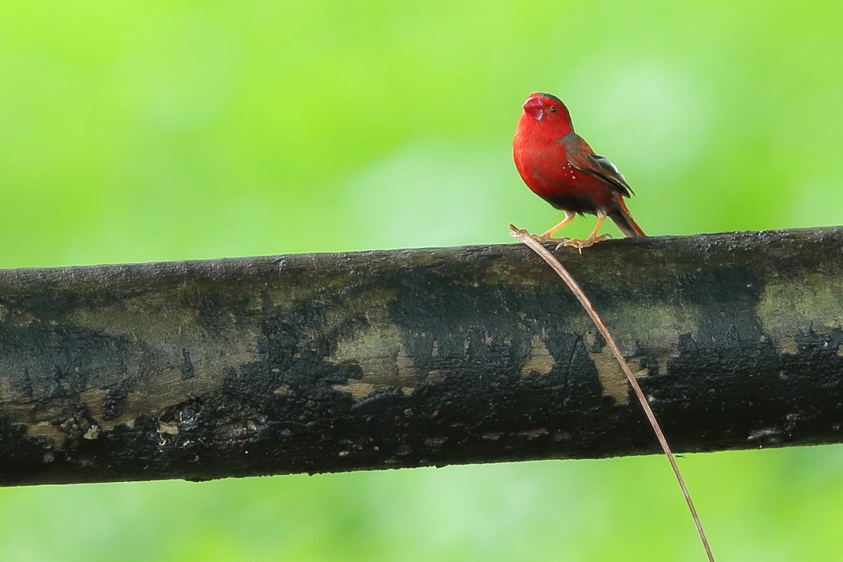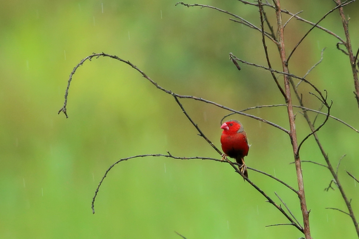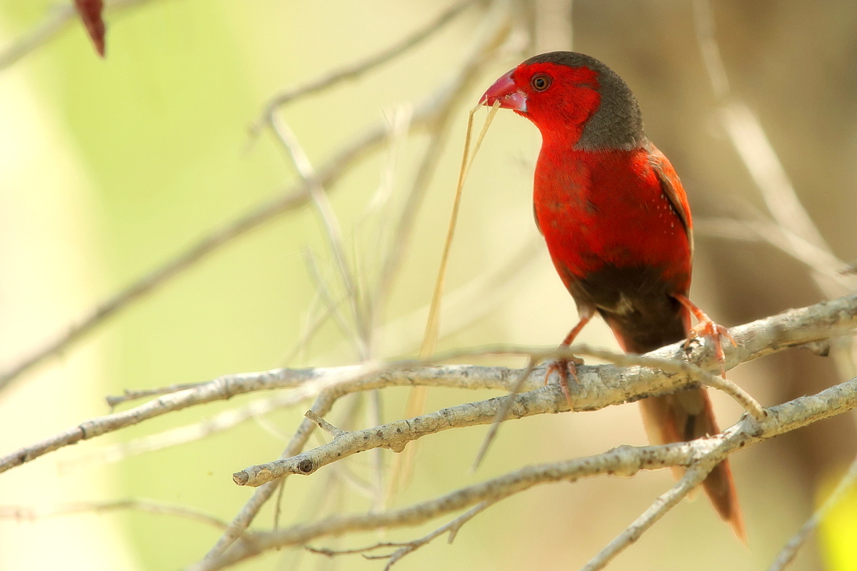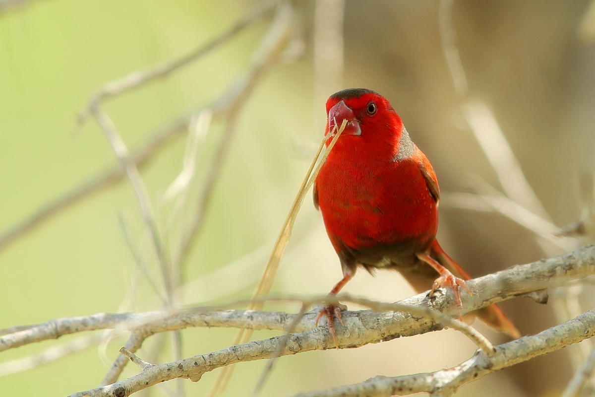 A few pictures of the Crimson Finch I took in the situation when a male was building their nest. It was the male for sure as sexual dimorphism in this species is well-marked in this species, and presented images of the bird almost entire red in color, show a male. It flew from the seat to a few tens of meters distant clump of dried grass. Because of its charm, plumage and size, it is bred in captivity in cages and aviaries. In natural conditions found in the northern and eastern Australia.