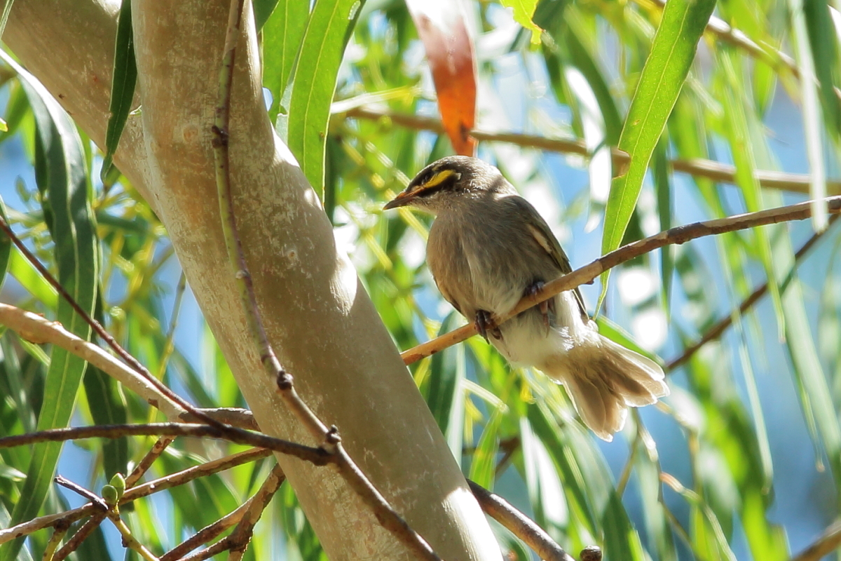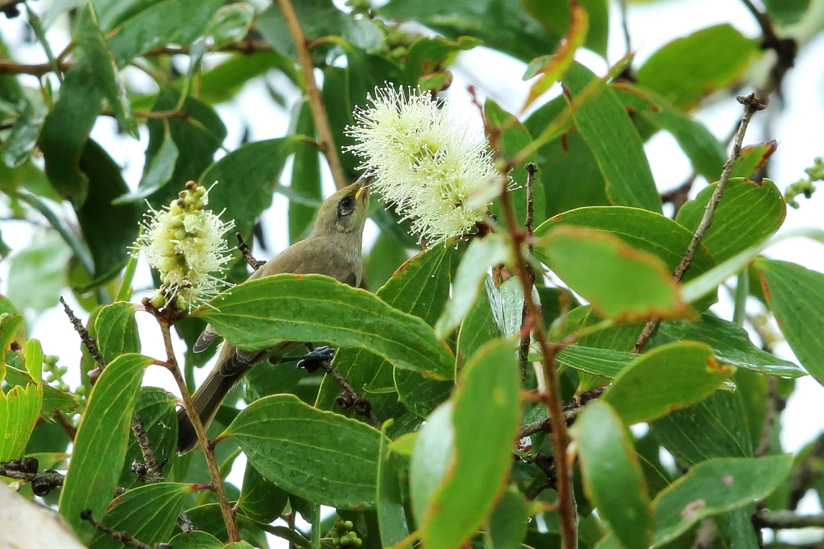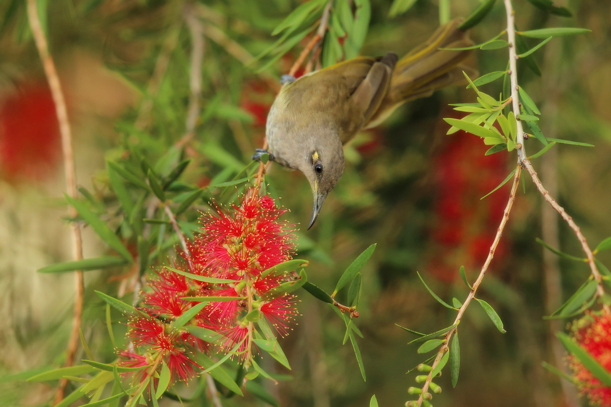 I came across The Yellow-faced Honeyeater a few times. It had a meal on inflorescence keeping a safe distance. As it befits  the Honeyeater, not only nectar is its food. It feeds among the leaves and inflorescences on trees and shrubs. The vast majority of the menu are insects and nectar just complements its diet. Yellow-faced honeyeaters build nests in the bushes, quite low, close to the ground.