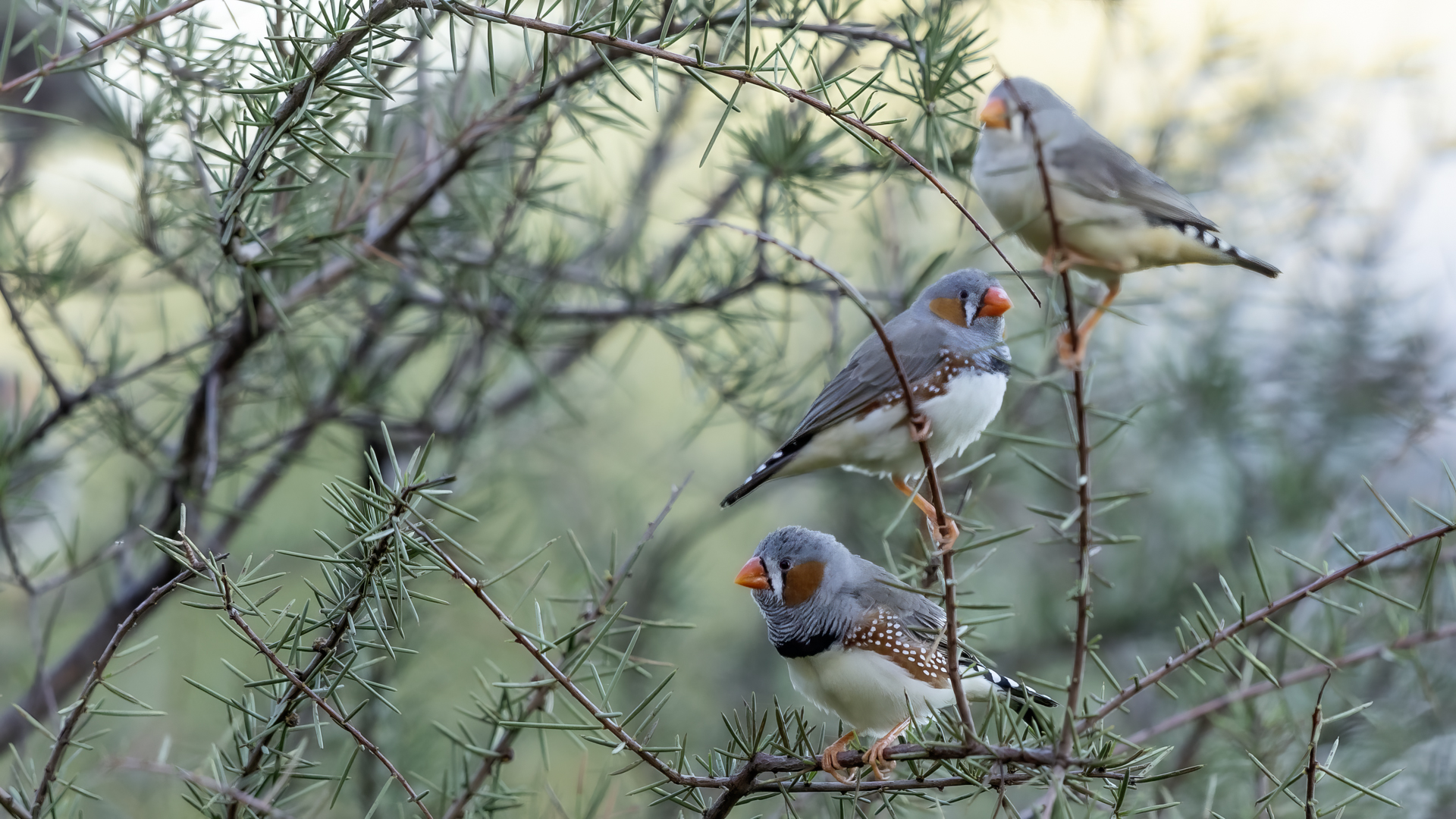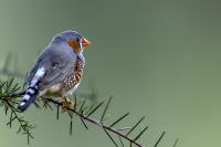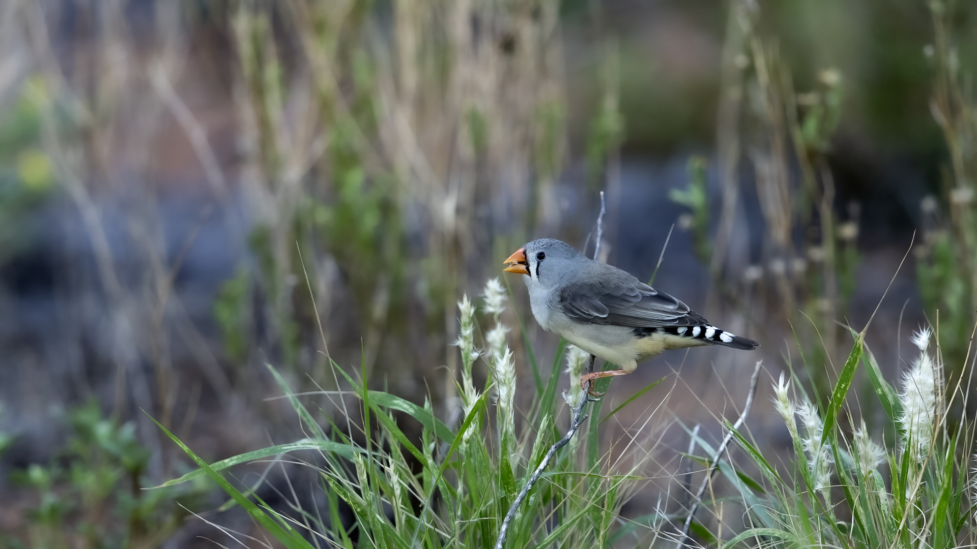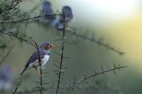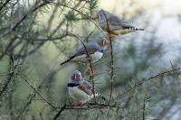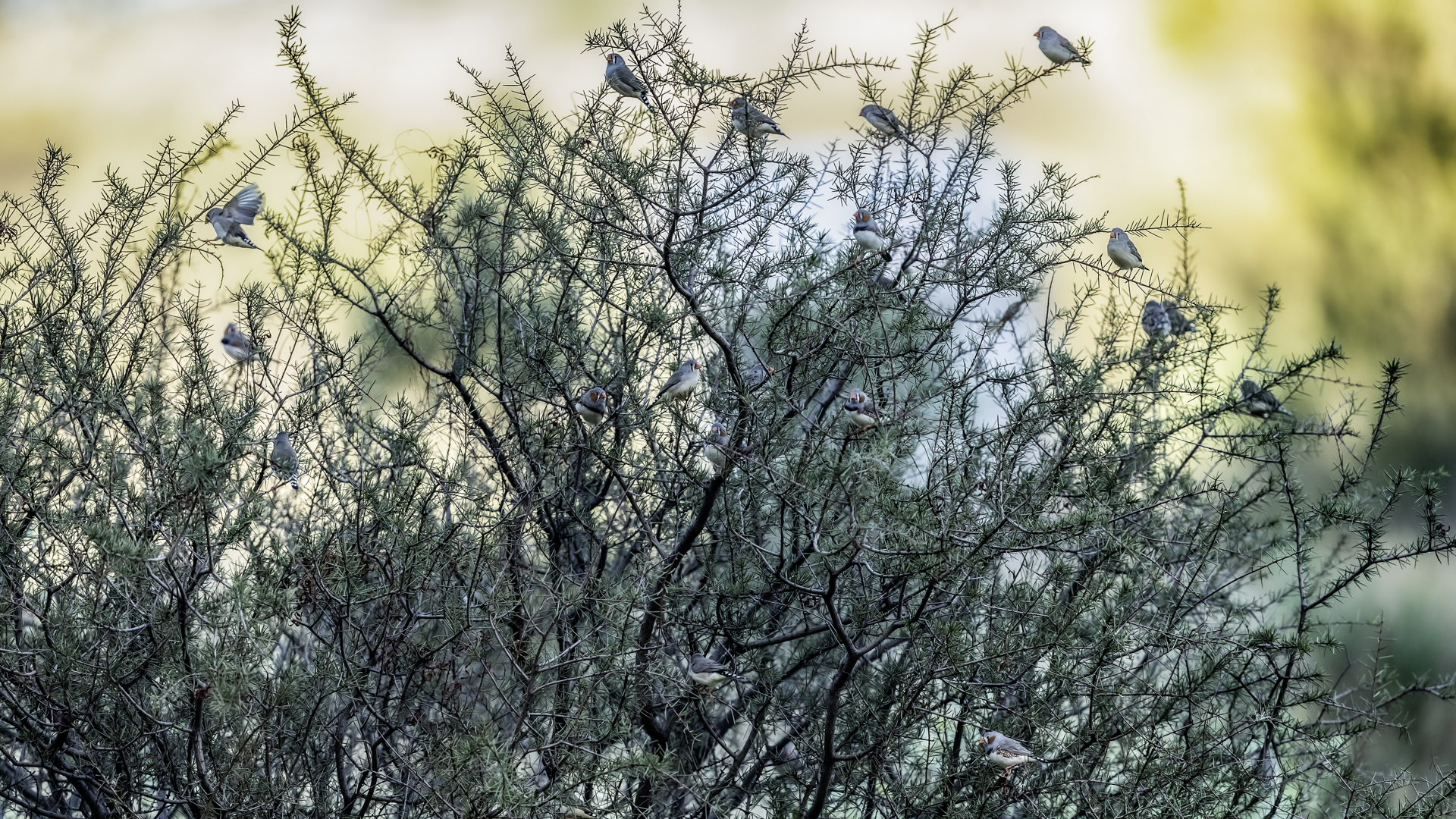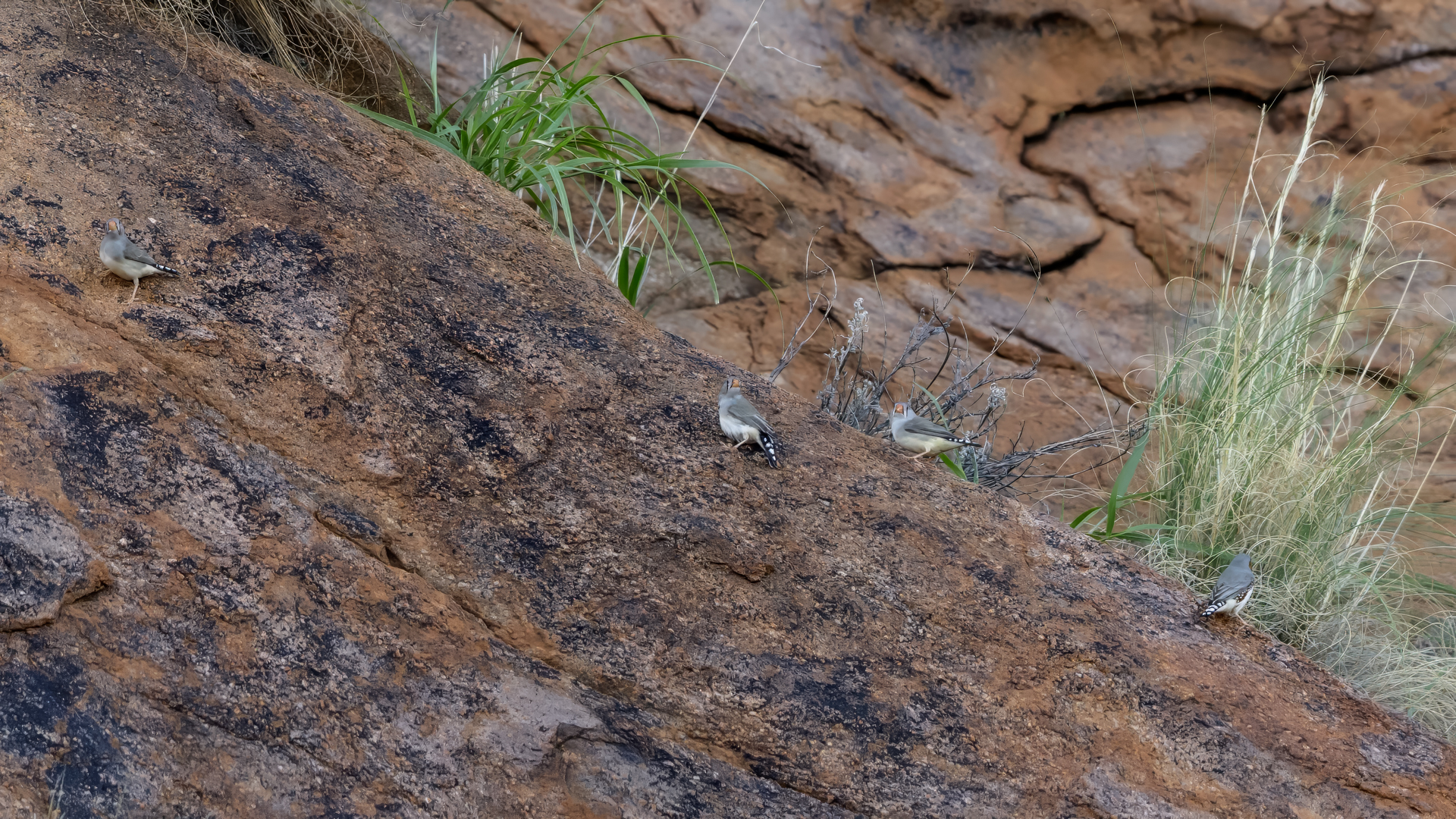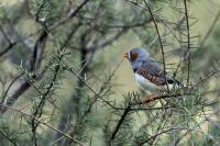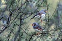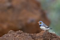 Presentation of this species brought back some associations and memories of budgerigars. Zebra finches, that I photographed in the heart of Australia in Uluru, are gregarious birds. Hundreds of kilometers of "rust" ground, scantily covered with grass and even more rarely with small trees is a natural environment not only of Zebra finch, but also of budgies. This bird is probably most commonly found among parrots bred in Poland. Once years ago, admiring the birds I built quite a large aviary near my house. I dug in the ground halved trunks of birch, hollowed out the trunks making holes on the top and hung nest boxes at the rear part of the holes. Aviary was a year-round and the birds accepted it so that during a few years there took place about 200 births. Those were mainly budgies but also cockatiels. Crimson Rosellas attempted to breed three times unsuccessfully. Of course leaving for Australia I wanted to watch them in their natural environment, but I had to be content with the environment itself. Much more time and a guide would be needed to find them in that immeasurable space in the heart of Australia. Budgerigars are found, except the coast, virtually throughout the whole of ​​Australia. Local people in Uluru asked about this species claimed that yes, they were there - everywhere, on endless territory. Well budgerigars were not those that was to be admired by me in their natural environment. But even though it was not planned I several times had the chance to take photos of flock of zebra finches, which landed on the characteristic red rocks of Uluru. Zebra finches were flying in a flock of 20-30 birds and presented images are the results of those moments when nobody disturbed us for a few minutes (no other tourists within 15-20 meters, what did not happen very often). Zebra finches at first sat on a bush or rock watching the area for a while, then flew down to low-lying grass or to the ground and started feeding. And again I encountered the specificity of shooting in Australia. Of course without any camouflage, coming up calmly I could take their pictures from a distance of 7-9. But there were two difficulties we had to take into account. One thing was that this was quite a lively flock of birds. If they sat on the bush, especially when foraging for food in the morning, it did not take much time. So coming closer cannot be too rapid, but being too slow would cause they fly away or down to the ground where shooting would be much more difficult. The second nuisance in the area were medium-size flies. They were actually numerous and made me concentrate on shooting hardly possible. They almost covered me and there was no way to get rid of them. To sum up, I managed to take pictures for the gallery of this colorful bird in the heart of Australia, just like several other species but not in such an impressive quantity. Recording the voice would not be a problem but unfortunately I had no more time left. Taking possibly large number of images was more important to me, as Zebra finch’s voice can be heard in many places in Poland.