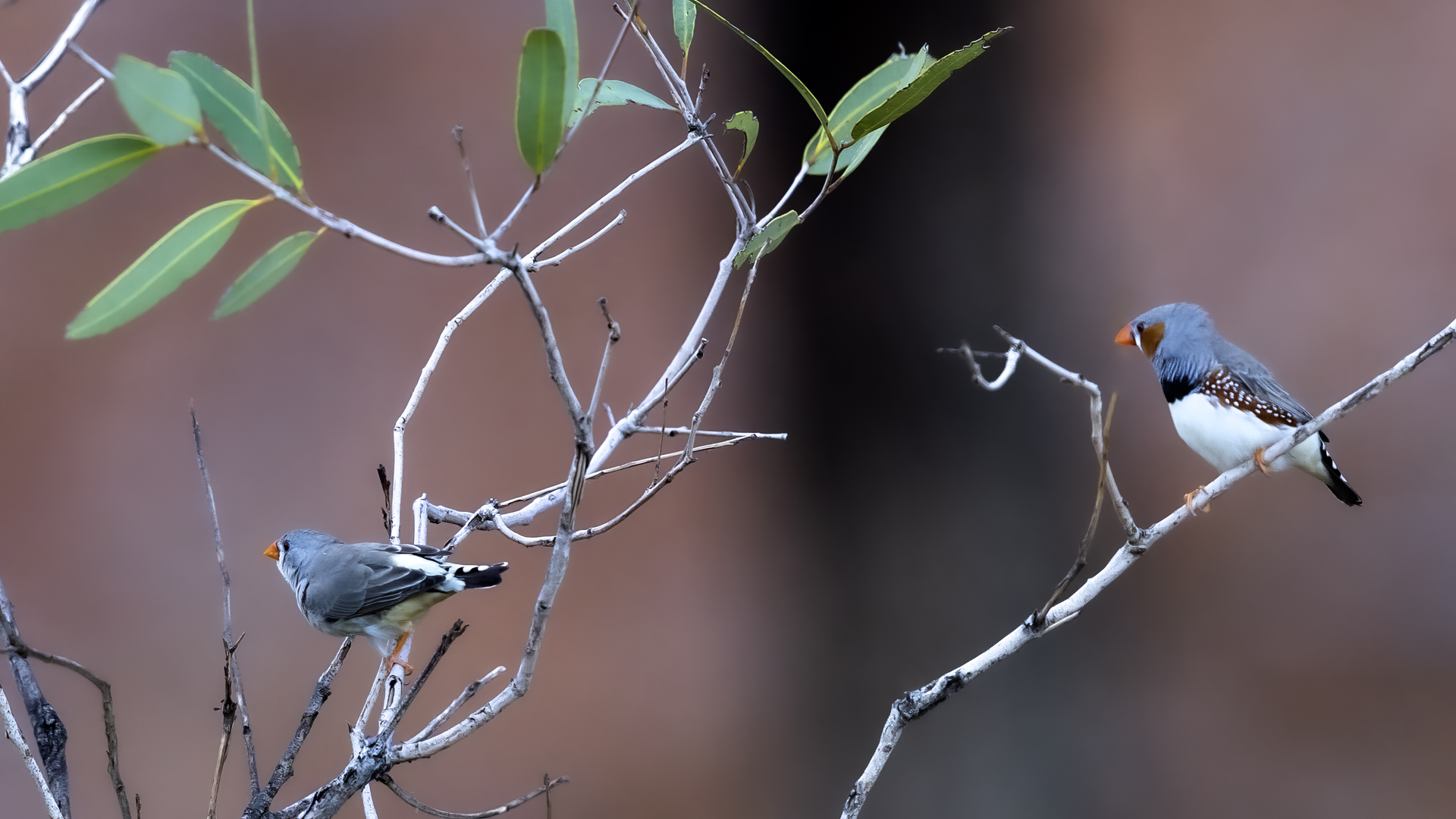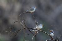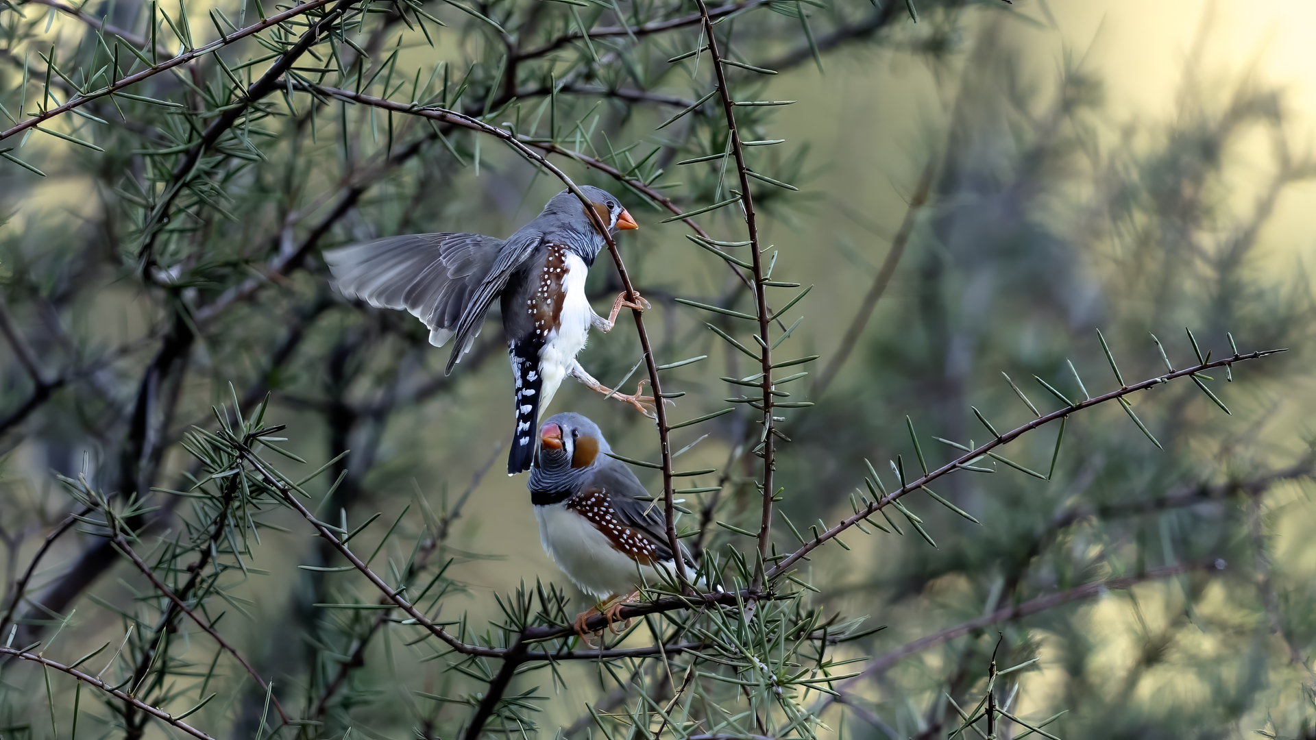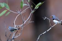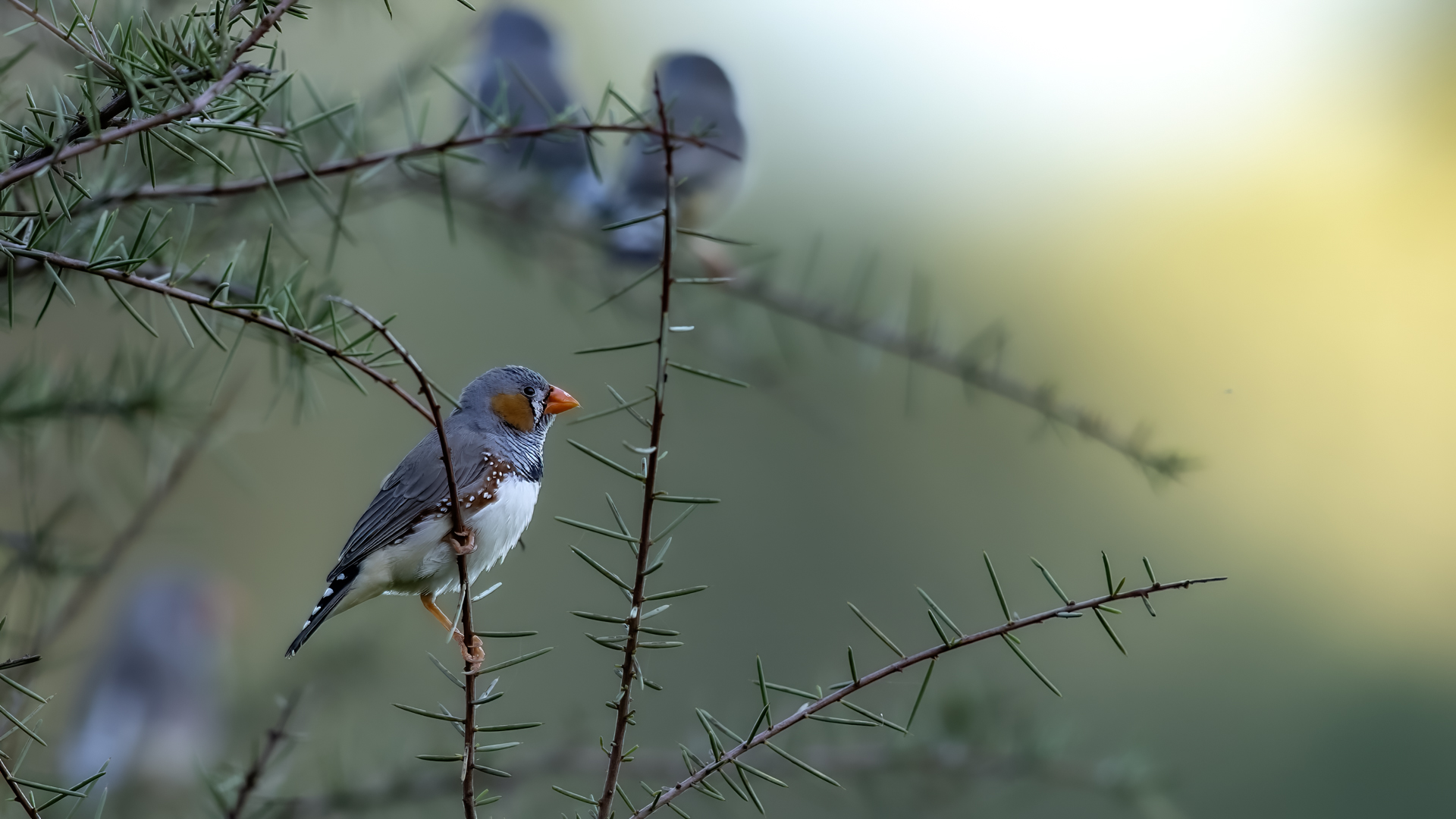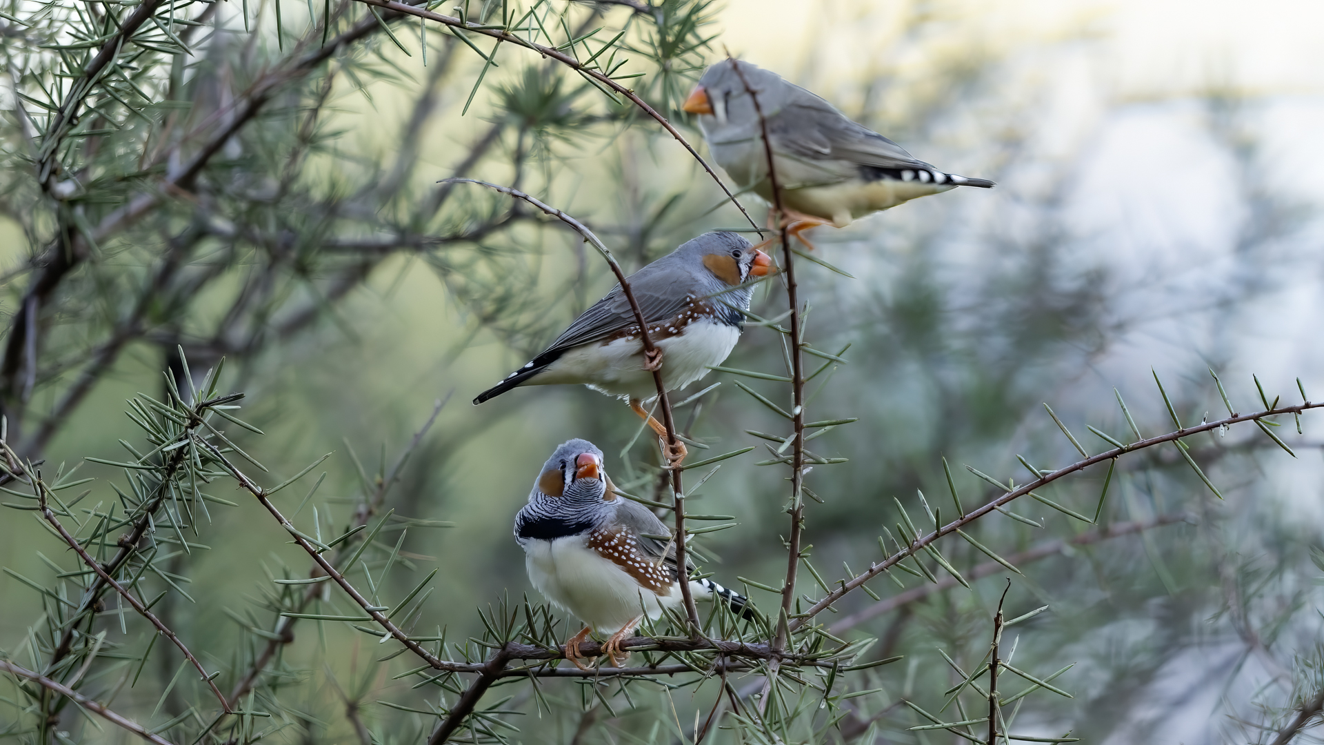 Presentation of this species brought back some associations and memories of budgerigars. Zebra finches, that I photographed in the heart of Australia in Uluru, are gregarious birds. Hundreds of kilometers of "rust" ground, scantily covered with grass and even more rarely with small trees is a natural environment not only of Zebra finch, but also of budgies. This bird is probably most commonly found among parrots bred in Poland. Once years ago, admiring the birds I built quite a large aviary near my house. I dug in the ground halved trunks of birch, hollowed out the trunks making holes on the top and hung nest boxes at the rear part of the holes. Aviary was a year-round and the birds accepted it so that during a few years there took place about 200 births. Those were mainly budgies but also cockatiels. Crimson Rosellas attempted to breed three times unsuccessfully. Of course leaving for Australia I wanted to watch them in their natural environment, but I had to be content with the environment itself. Much more time and a guide would be needed to find them in that immeasurable space in the heart of Australia. Budgerigars are found, except the coast, virtually throughout the whole of ​​Australia. Local people in Uluru asked about this species claimed that yes, they were there - everywhere, on endless territory. Well budgerigars were not those that was to be admired by me in their natural environment. But even though it was not planned I several times had the chance to take photos of flock of zebra finches, which landed on the characteristic red rocks of Uluru. Zebra finches were flying in a flock of 20-30 birds and presented images are the results of those moments when nobody disturbed us for a few minutes (no other tourists within 15-20 meters, what did not happen very often). Zebra finches at first sat on a bush or rock watching the area for a while, then flew down to low-lying grass or to the ground and started feeding. And again I encountered the specificity of shooting in Australia. Of course without any camouflage, coming up calmly I could take their pictures from a distance of 7-9. But there were two difficulties we had to take into account. One thing was that this was quite a lively flock of birds. If they sat on the bush, especially when foraging for food in the morning, it did not take much time. So coming closer cannot be too rapid, but being too slow would cause they fly away or down to the ground where shooting would be much more difficult. The second nuisance in the area were medium-size flies. They were actually numerous and made me concentrate on shooting hardly possible. They almost covered me and there was no way to get rid of them. To sum up, I managed to take pictures for the gallery of this colorful bird in the heart of Australia, just like several other species but not in such an impressive quantity. Recording the voice would not be a problem but unfortunately I had no more time left. Taking possibly large number of images was more important to me, as Zebra finch’s voice can be heard in many places in Poland.