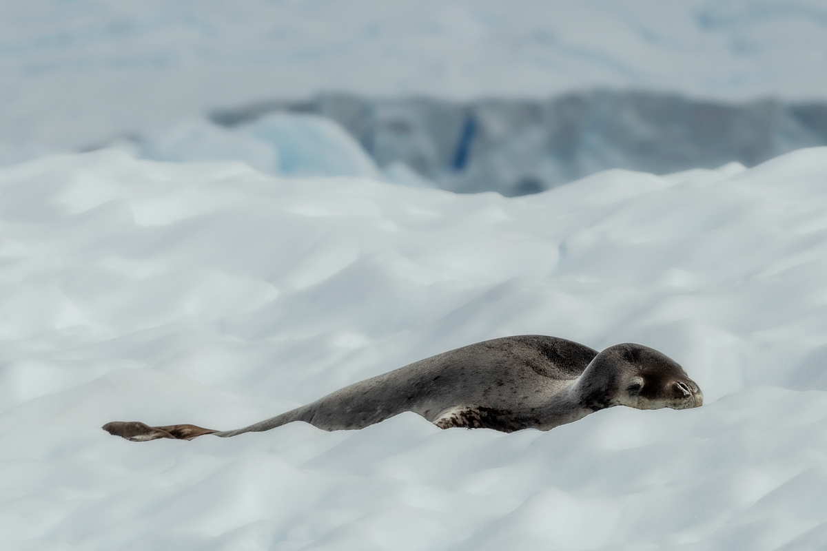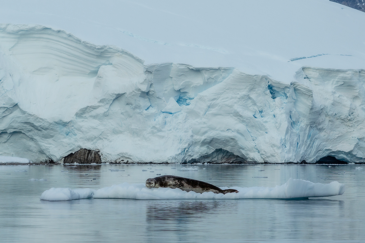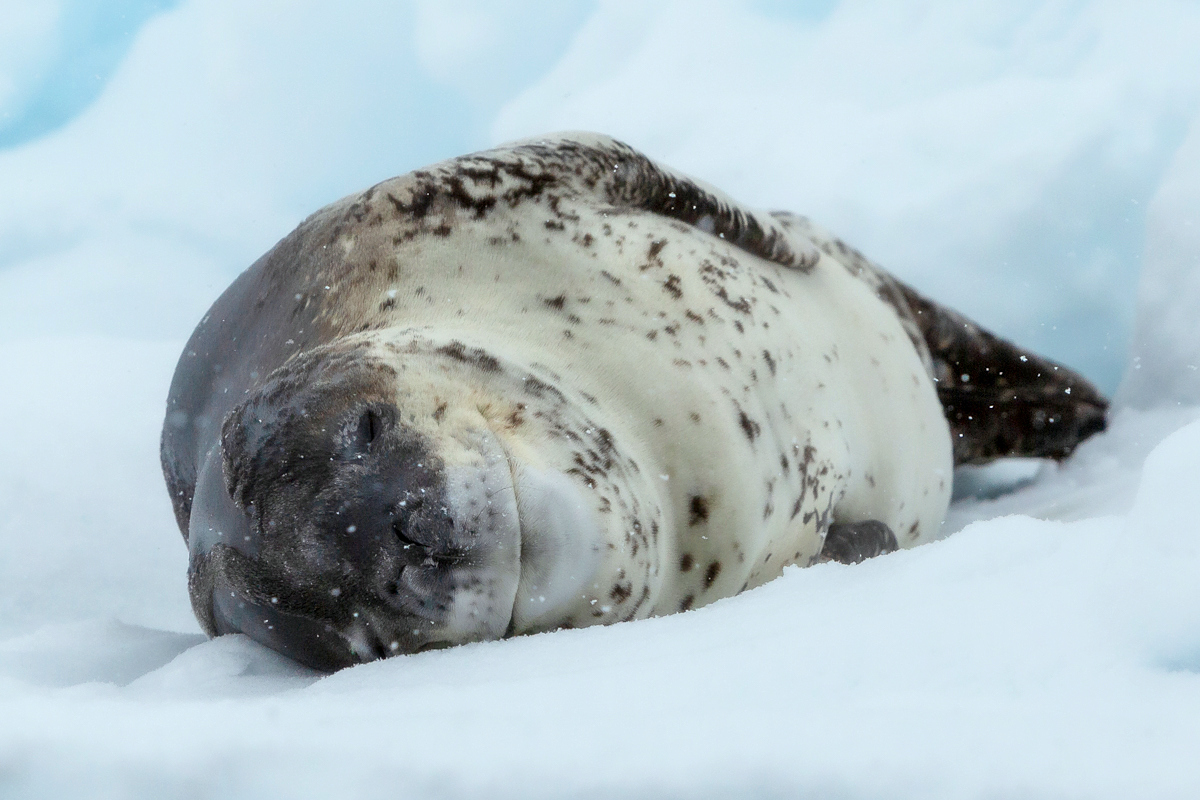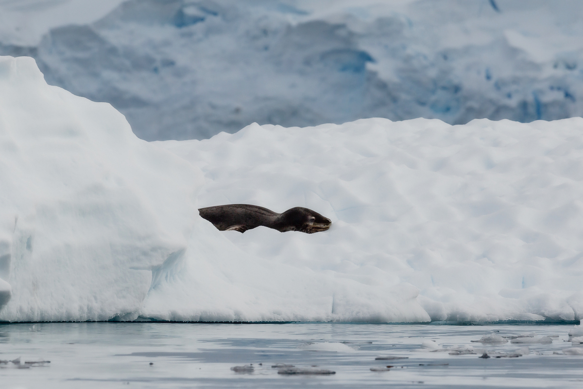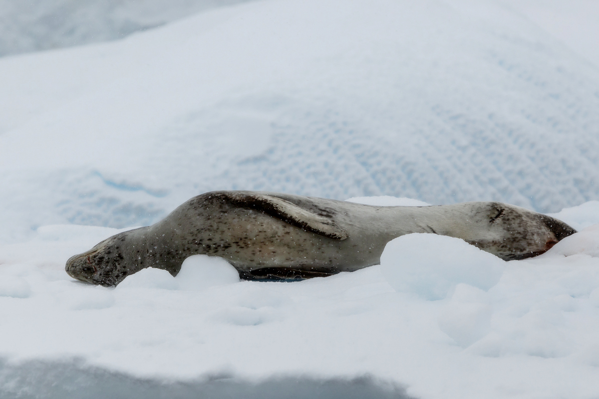 Floating on pontoons in the midst of ice there in Antarctica, we could almost always see a leopard seal resting on an ice floe. It did not care about our presence, so taking picture was not a problem, especially in quiet waters of bays. There were actually quite a few of them, but I think this was because numerous penguin rookeries occurred in the area. It was January – the middle of an Antarctic summer, so not for long there in waters will be thousands of young inexperienced penguins, which are their favorite food. Leopard seal is big enough (weighs up to 500 kg) to hunt other seals. Its body length reaches about 3.5 meters.