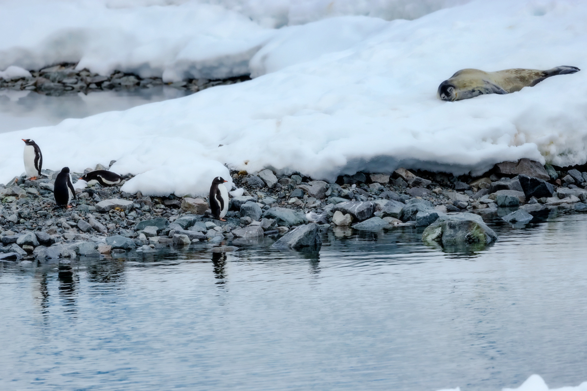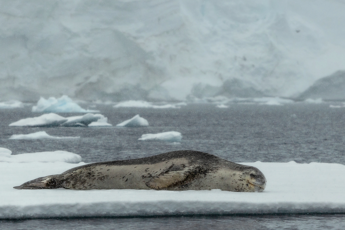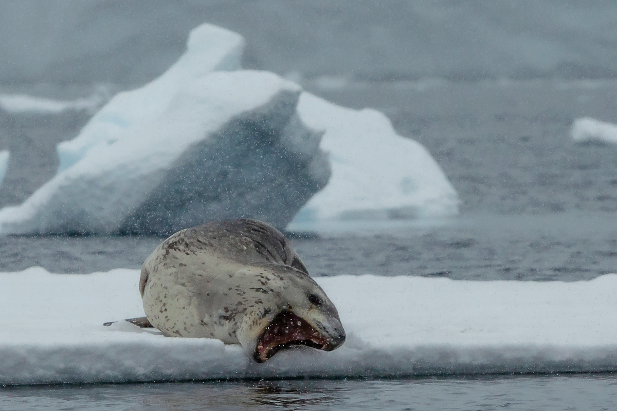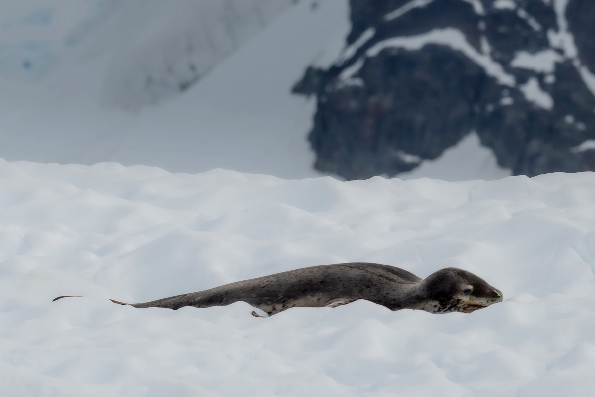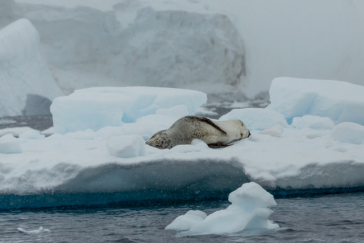 Floating on pontoons in the midst of ice there in Antarctica, we could almost always see a leopard seal resting on an ice floe. It did not care about our presence, so taking picture was not a problem, especially in quiet waters of bays. There were actually quite a few of them, but I think this was because numerous penguin rookeries occurred in the area. It was January – the middle of an Antarctic summer, so not for long there in waters will be thousands of young inexperienced penguins, which are their favorite food. Leopard seal is big enough (weighs up to 500 kg) to hunt other seals. Its body length reaches about 3.5 meters.