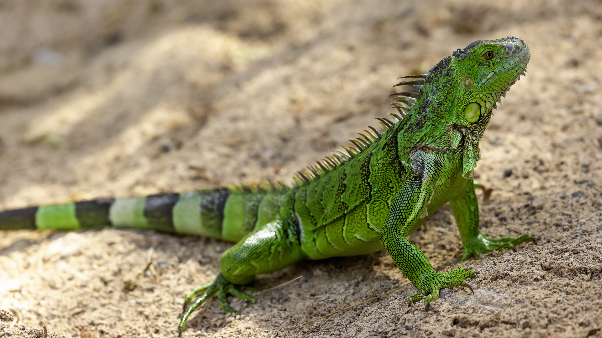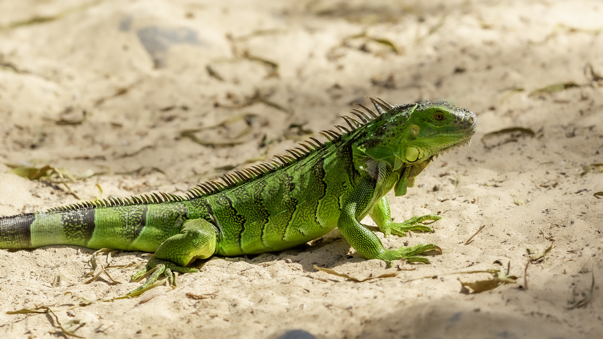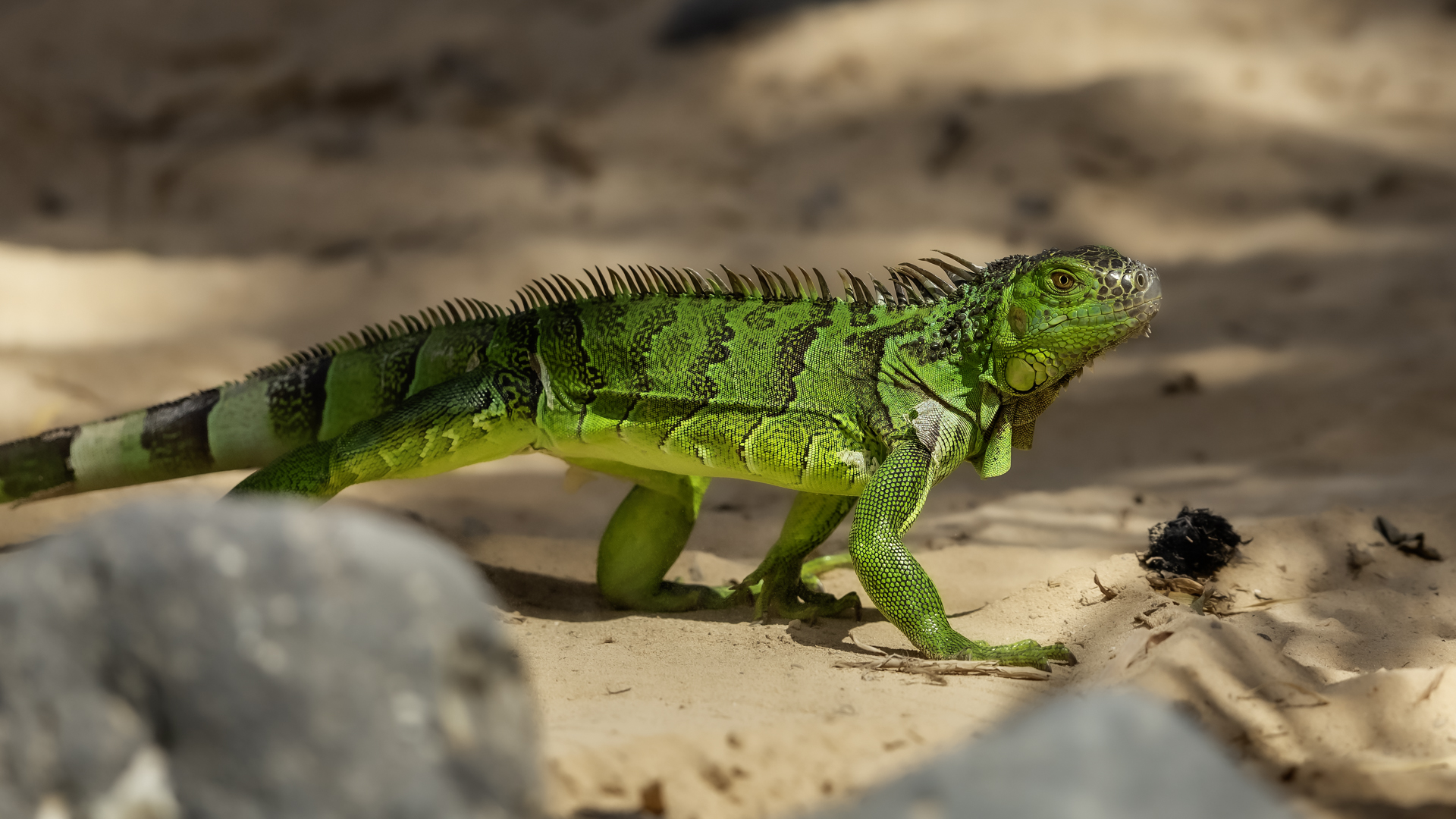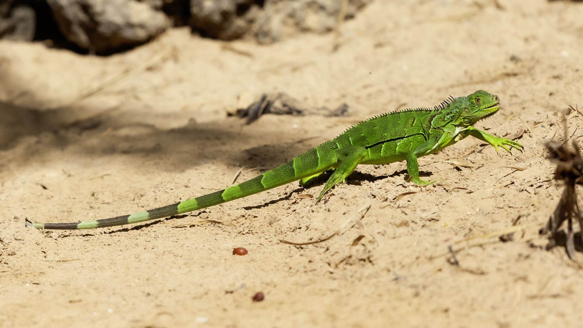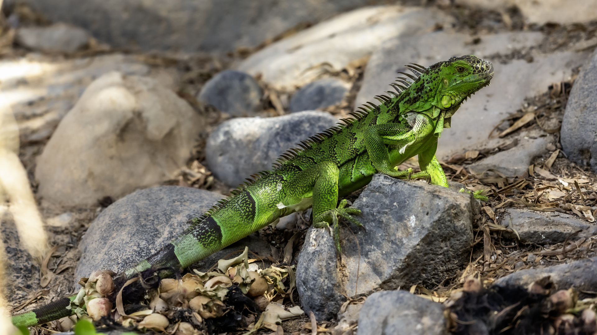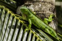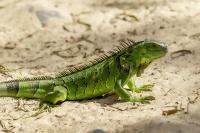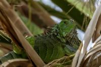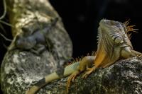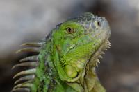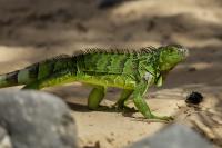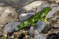 On Fuerteventura I photographed these iguanas in turns with weaver finches. They passed slowly and solemnly and there was no problem with taking pictures. Green iguanas like weavers are the species not naturally occurring on the island. There is a high probability that they escaped from farms or were released into the wild by breeder when slightly exceeded his expectations. Naturally they occur in South and Central America. Green iguanas grow up to 1.5 meters in length.