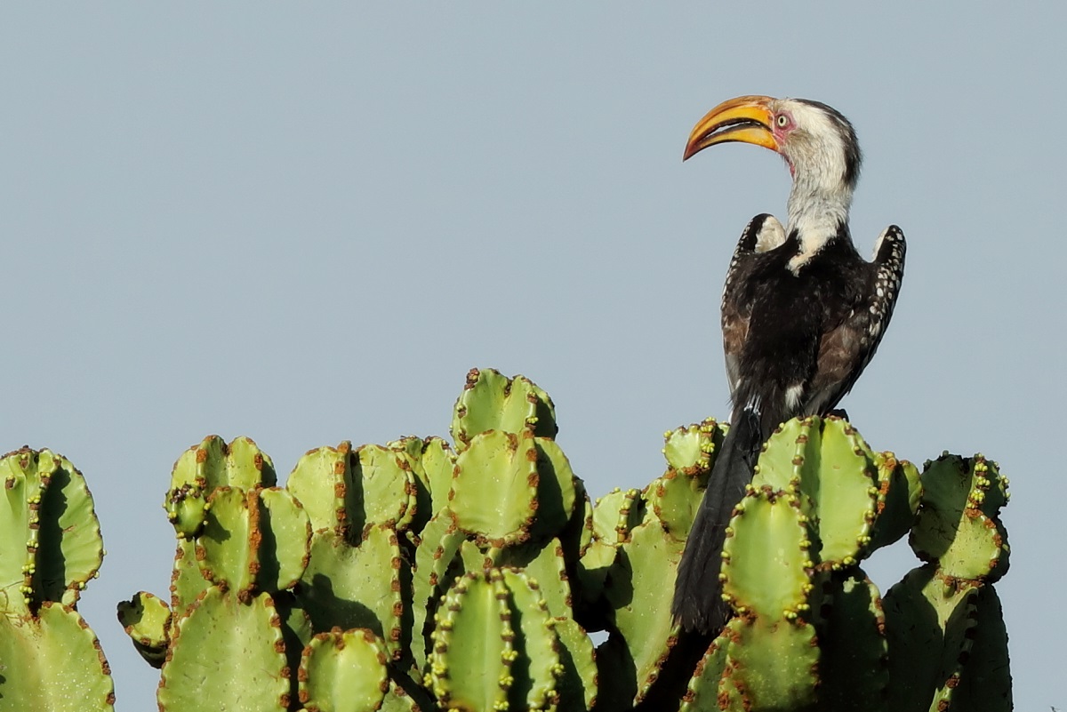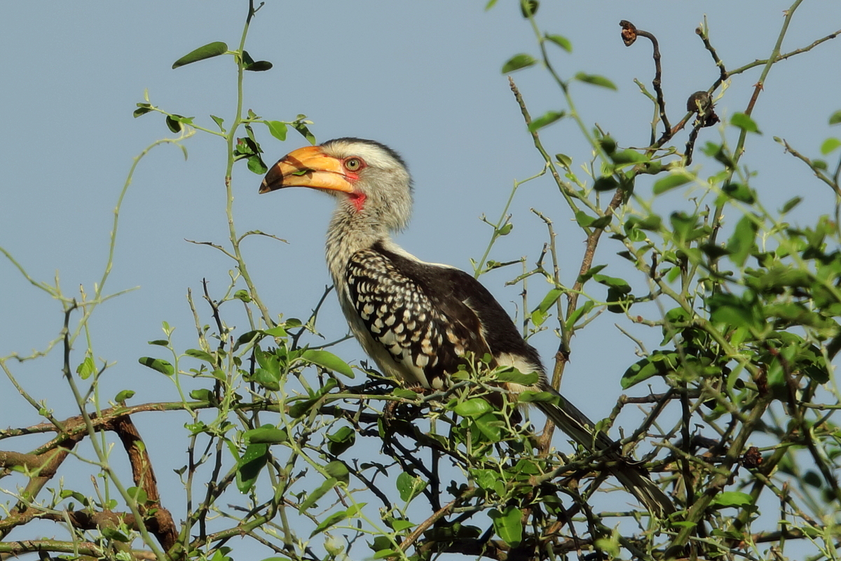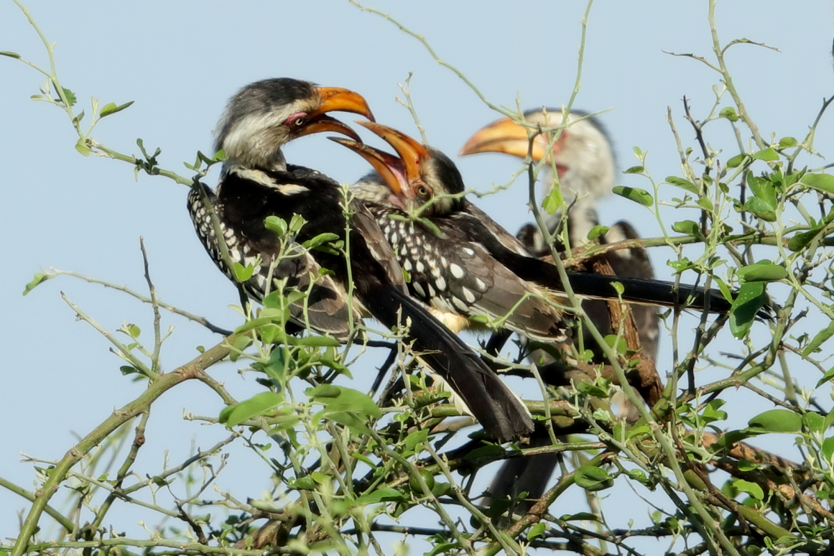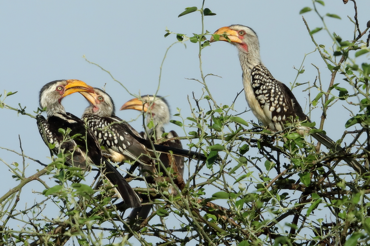 During our stay in South Africa three hornbills were photographed: the crowned hornbill, the southern yellow-billed hornbill and the trumpeter hornbill. This was my first contact with hornbills and I must admit quite successful. Although the birds were always a little too high and too far, but probably that is the case with hornbills which, in principle, prey in crowns of trees eating fruit. The hornbills were always a few and they behaved quite noisily, it lasted long enough and they were loud enough to record the voice of a southern yellow-billed hornbill and a trumpeter hornbill.