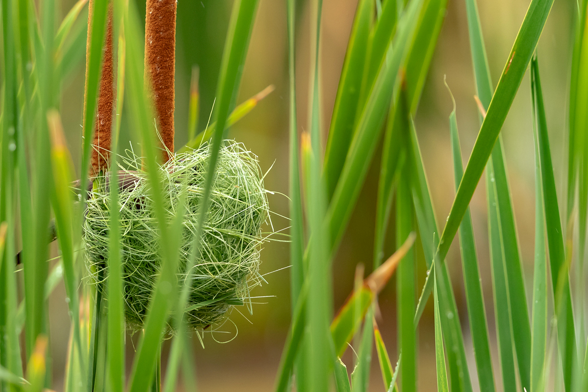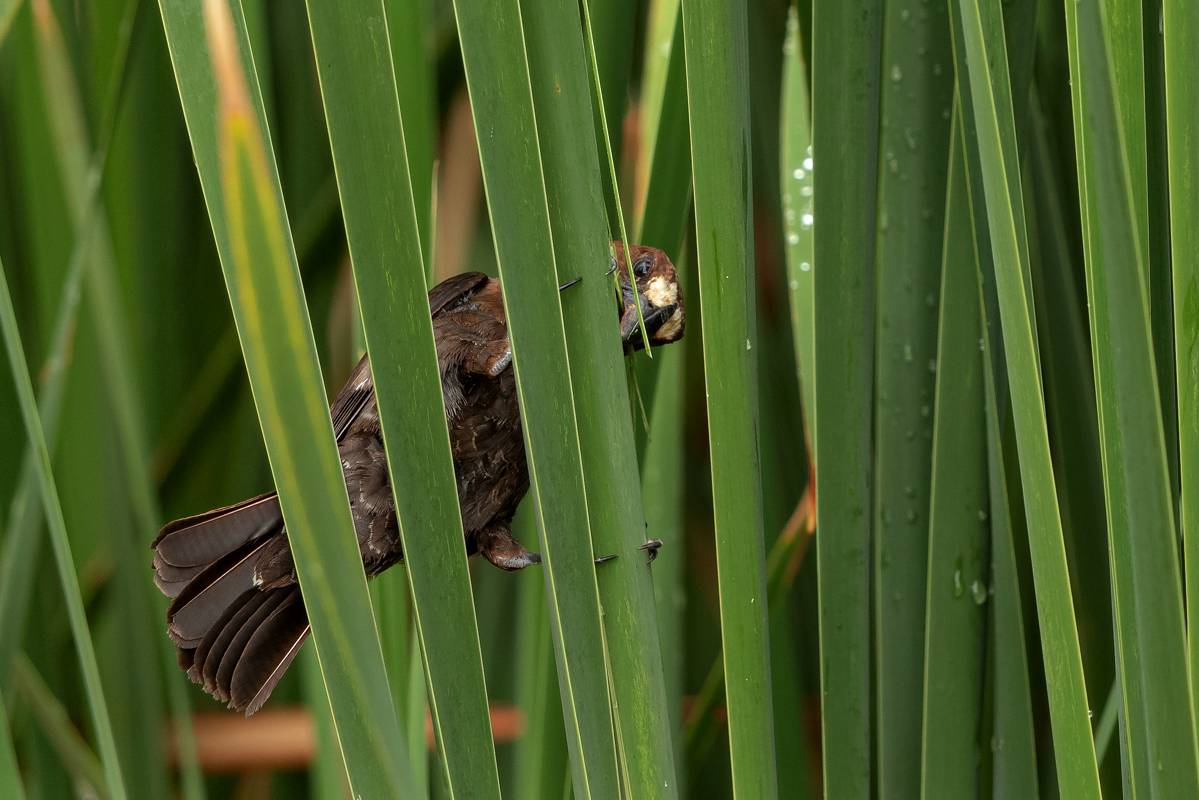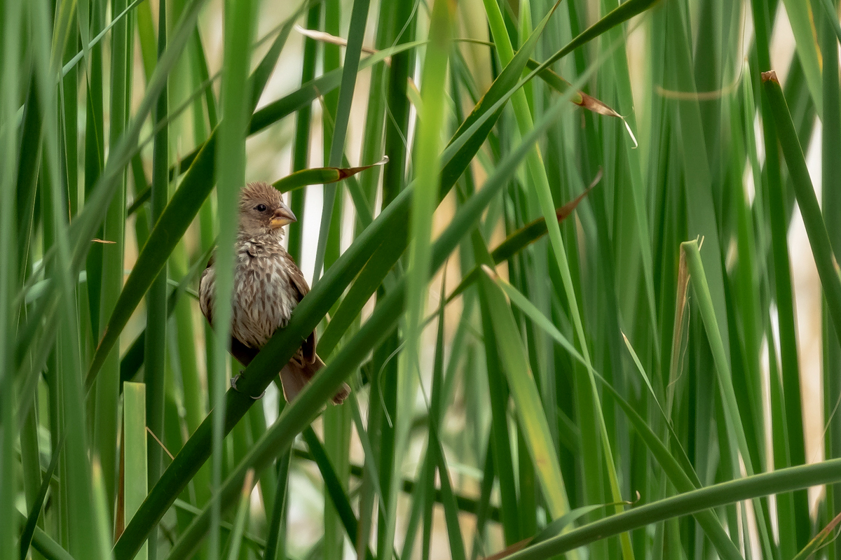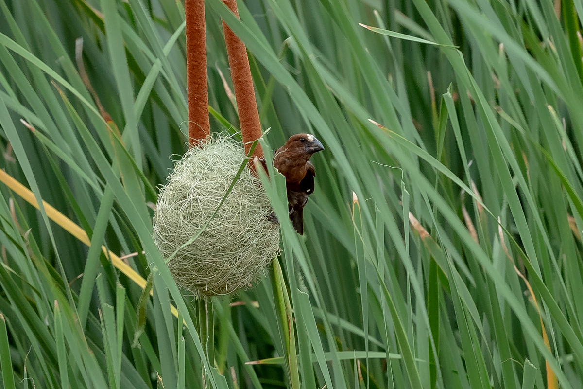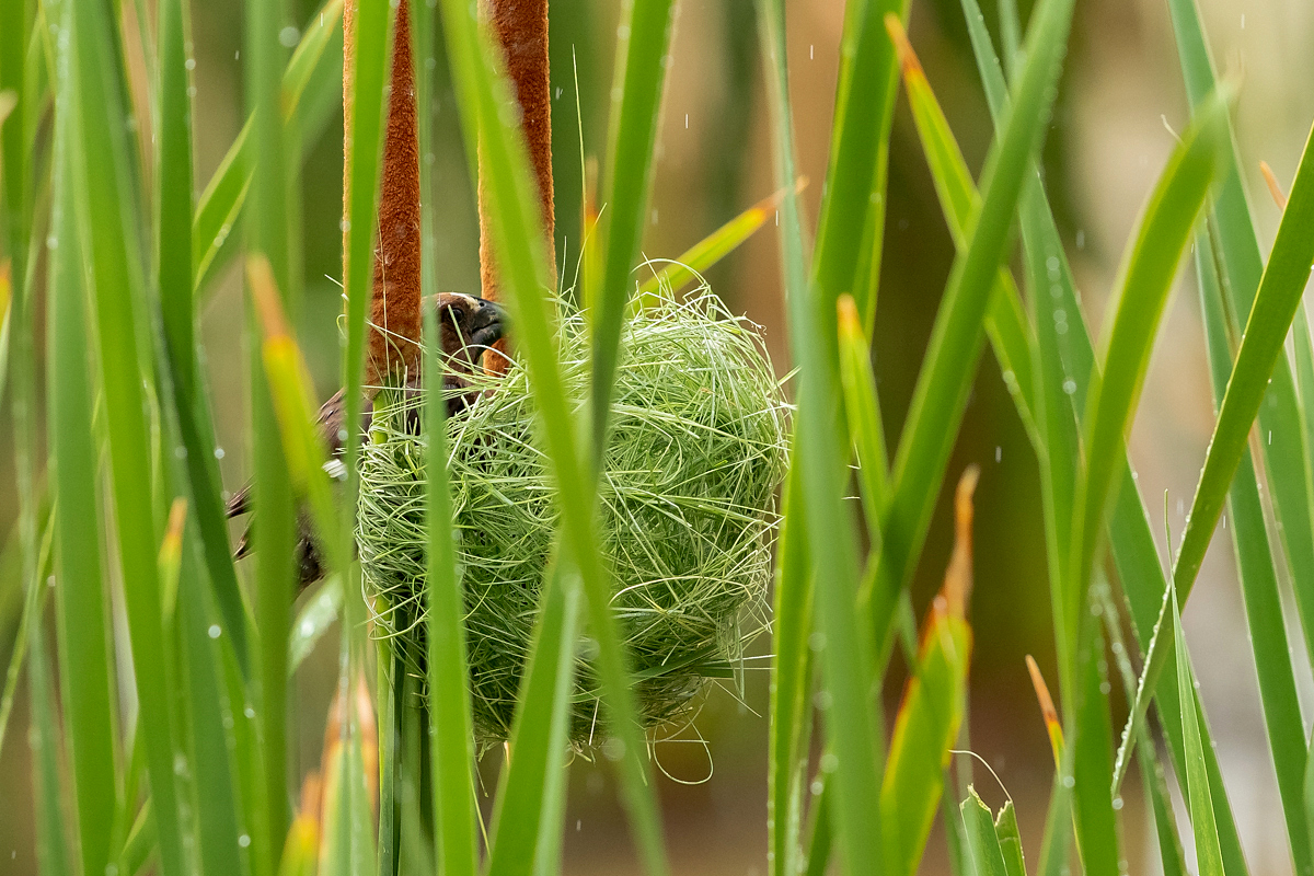 It happened so that in one of several visited hides, or actually from the point to watch birds we could observe how quickly and efficiently grosbeak weaver male built a nest. In this place we spent two days so a few times a day I was coming around to admire a male bustling about to build a nest attached to two sticks of bulrush. Within these two days nearly half of weaver’s “cottage” was ready. The male was jumping on the water plants growing nearby and in a highly efficient way divided the leaves into smaller and thinner pieces similar to elongated grass, which could be used to build a nest. On the second day in the afternoon it decided to invite the female to the nest. It flew up, landed on the water plants with a fairly wide wings and flapped them so distinctively. It is interesting that only in such a situation and also during the flight it made noises that I managed to record (I invite you to listen). The female quickly got into the nest and after a while got its head out and checked the entire structure. It is a pity that we had to leave, because such observation the reproductive cycle of weavers from less than 10 meters would certainly be interesting. I could watch these birds several times and it gave the opportunity to take interesting photos to the gallery.