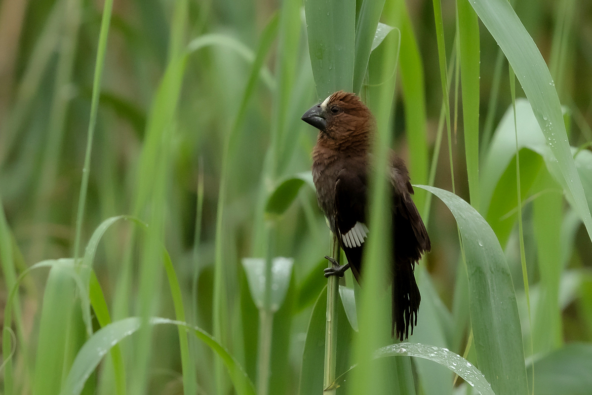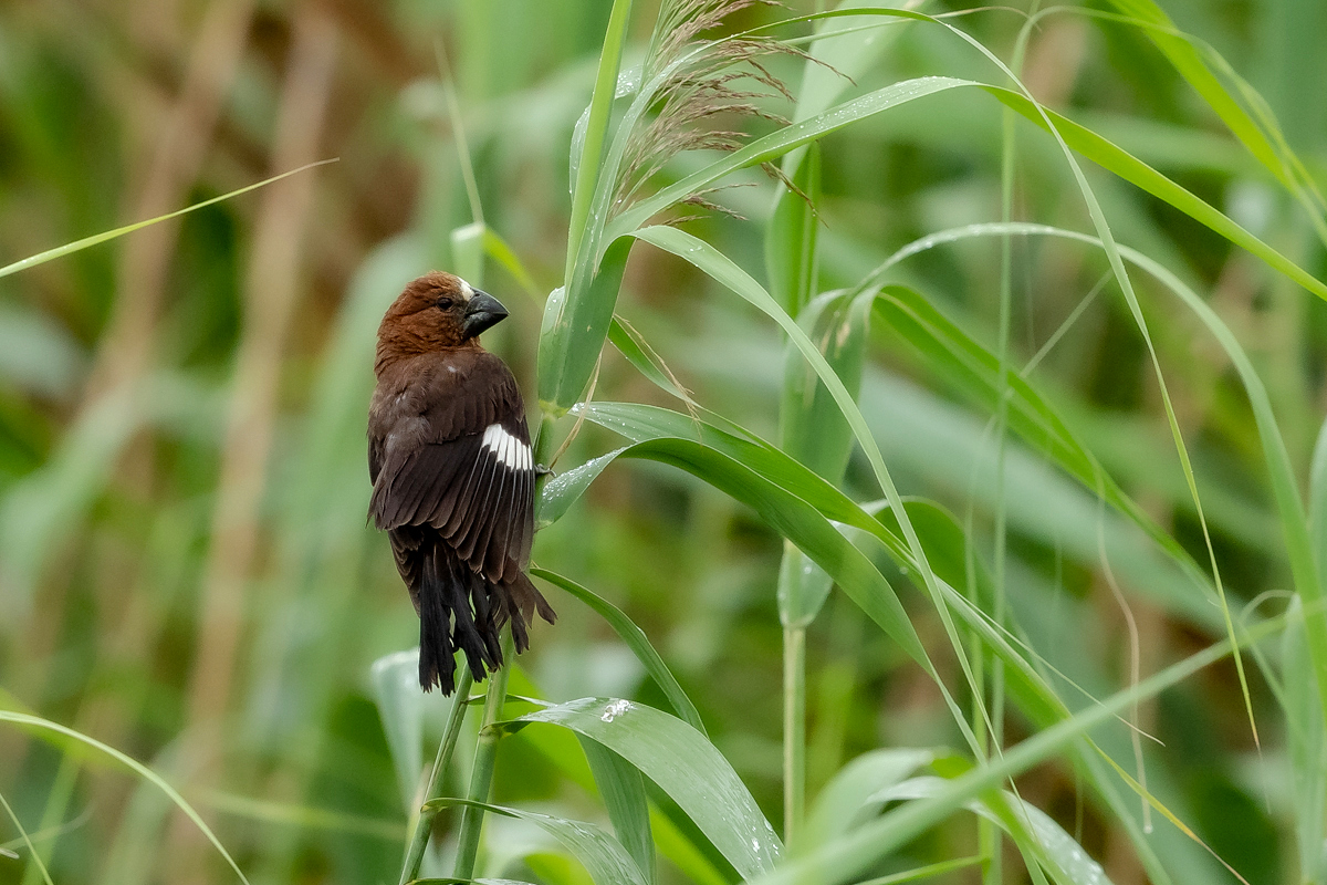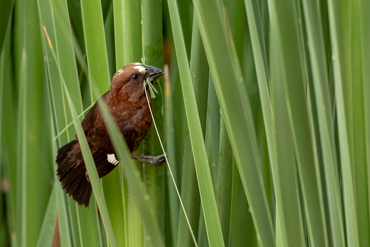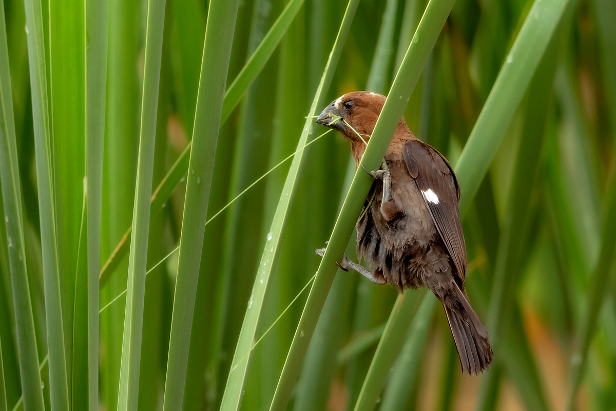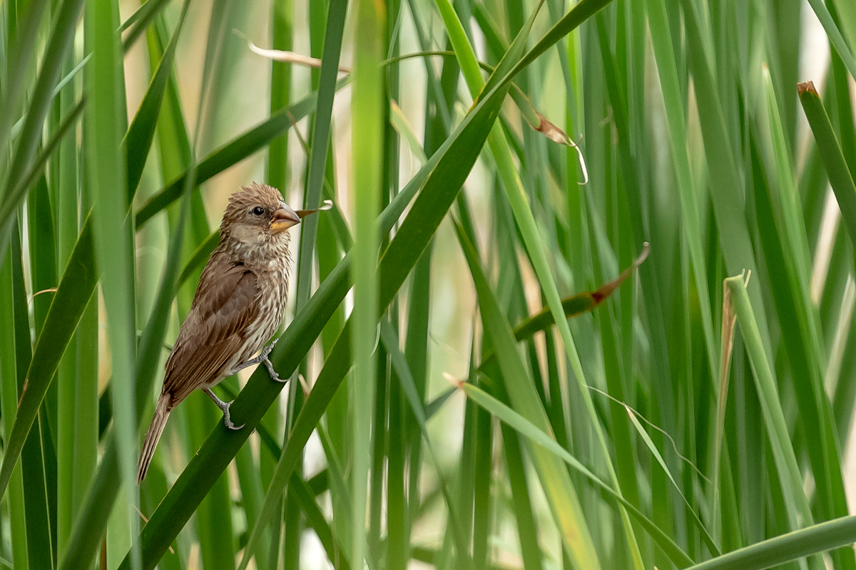 It happened so that in one of several visited hides, or actually from the point to watch birds we could observe how quickly and efficiently grosbeak weaver male built a nest. In this place we spent two days so a few times a day I was coming around to admire a male bustling about to build a nest attached to two sticks of bulrush. Within these two days nearly half of weaver’s “cottage” was ready. The male was jumping on the water plants growing nearby and in a highly efficient way divided the leaves into smaller and thinner pieces similar to elongated grass, which could be used to build a nest. On the second day in the afternoon it decided to invite the female to the nest. It flew up, landed on the water plants with a fairly wide wings and flapped them so distinctively. It is interesting that only in such a situation and also during the flight it made noises that I managed to record (I invite you to listen). The female quickly got into the nest and after a while got its head out and checked the entire structure. It is a pity that we had to leave, because such observation the reproductive cycle of weavers from less than 10 meters would certainly be interesting. I could watch these birds several times and it gave the opportunity to take interesting photos to the gallery.