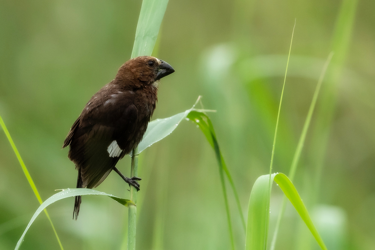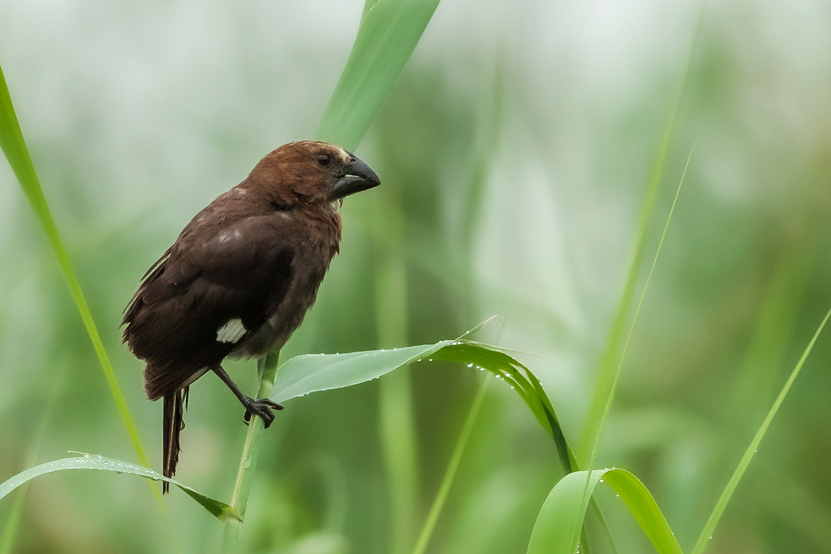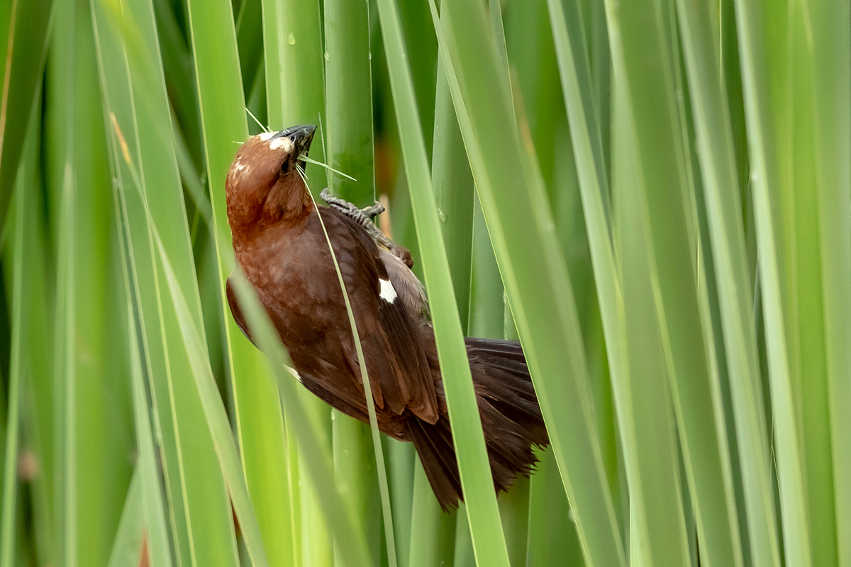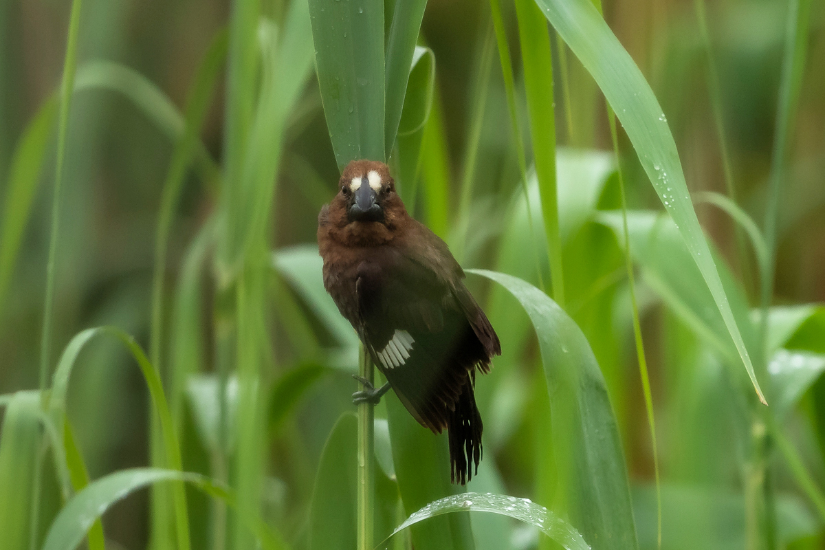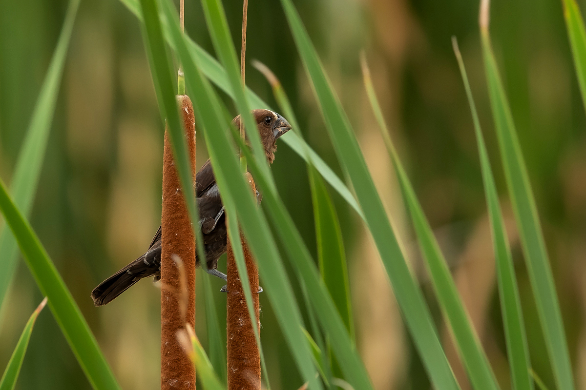It happened so that in one of several visited hides, or actually from the point to watch birds we could observe how quickly and efficiently grosbeak weaver male built a nest. In this place we spent two days so a few times a day I was coming around to admire a male bustling about to build a nest attached to two sticks of bulrush. Within these two days nearly half of weaver’s “cottage” was ready. The male was jumping on the water plants growing nearby and in a highly efficient way divided the leaves into smaller and thinner pieces similar to elongated grass, which could be used to build a nest. On the second day in the afternoon it decided to invite the female to the nest. It flew up, landed on the water plants with a fairly wide wings and flapped them so distinctively. It is interesting that only in such a situation and also during the flight it made noises that I managed to record (I invite you to listen). The female quickly got into the nest and after a while got its head out and checked the entire structure. It is a pity that we had to leave, because such observation the reproductive cycle of weavers from less than 10 meters would certainly be interesting. I could watch these birds several times and it gave the opportunity to take interesting photos to the gallery.
