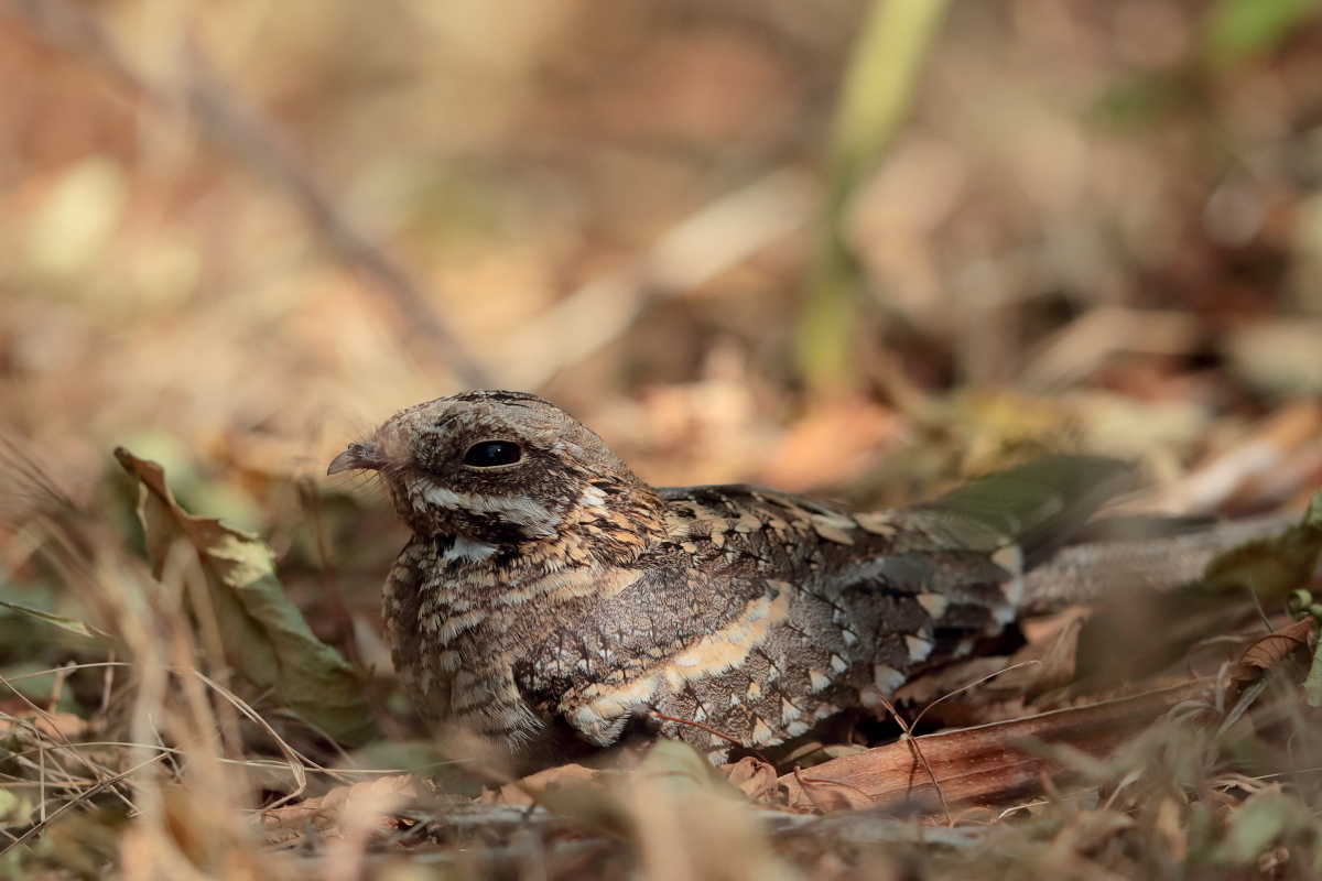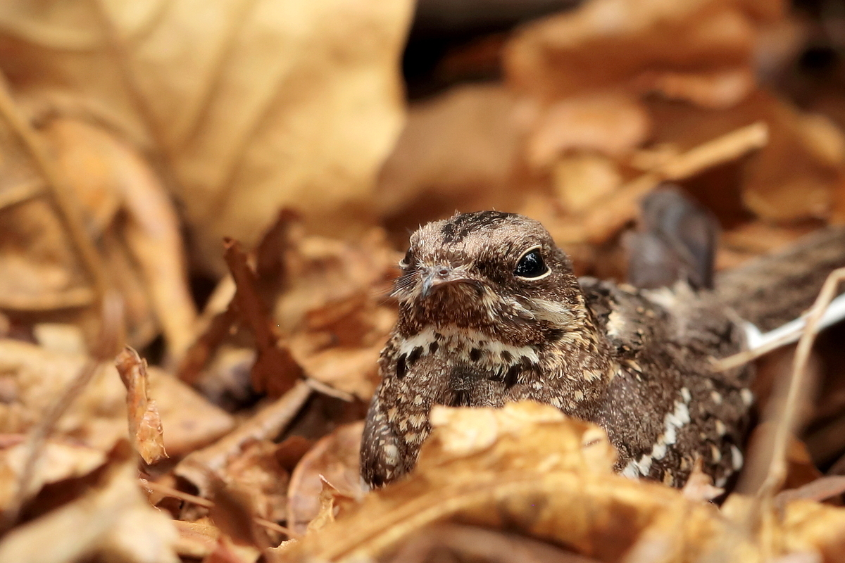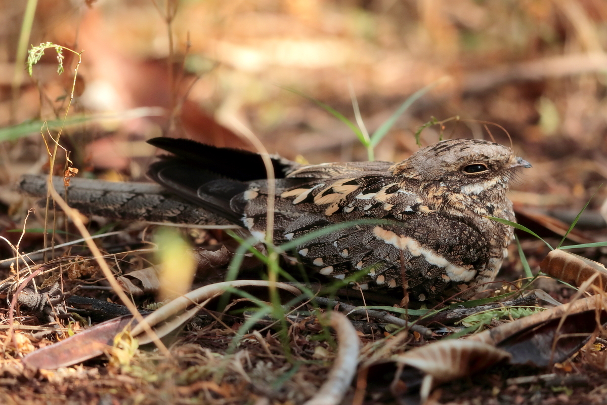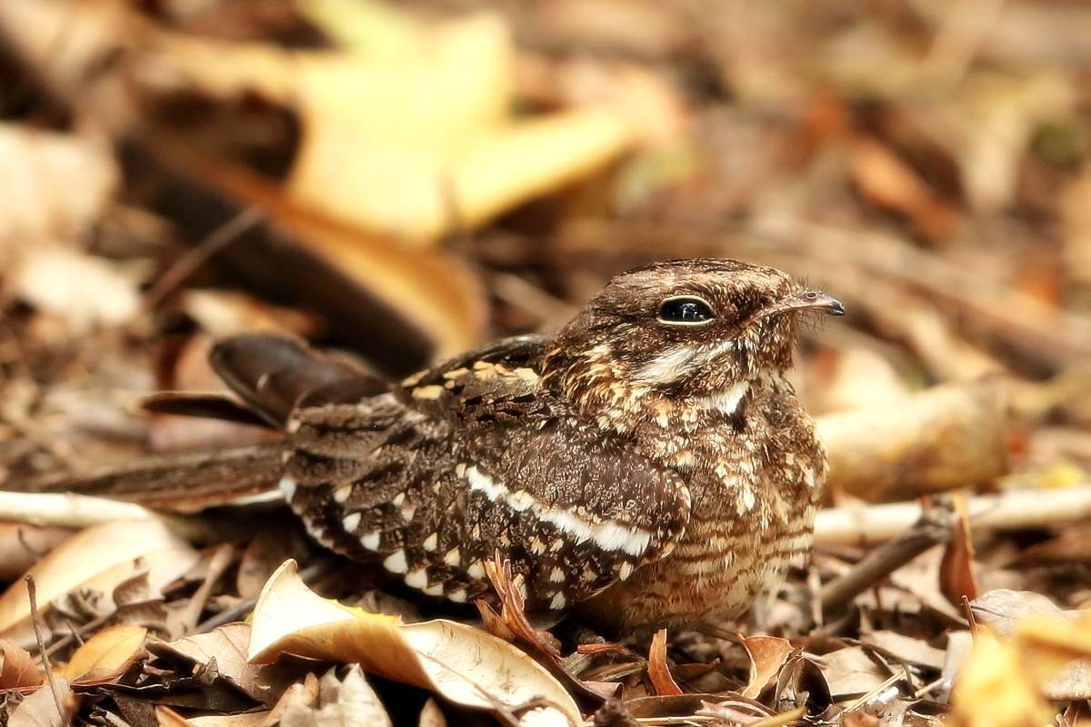 Such a find must be noted. Everyone who has passion for birdwatching or photography knows how hard it is to spot a slender-tailed nightjar. When you manage to find it, it will not be a problem to take pictures, unless you come too close. This time it was Tadeusz who noticed the bird and this is why I send my special thanks to him.  In the morning when we were packing our tents, we had still some time to check the area, whether it would be possible to capture other new species or to take more interesting shots before our departure. And there we had, a few meters from the tent - a slender-tailed nightjar. It knew well that when sitting quietly on the ground among the leaves it was practically invisible to Mr Average. Invisible to the ordinary man in the street but not to Tadeusz...