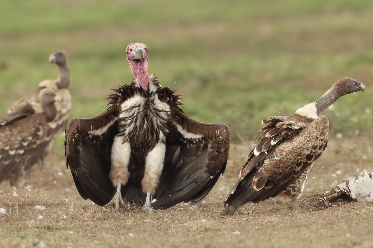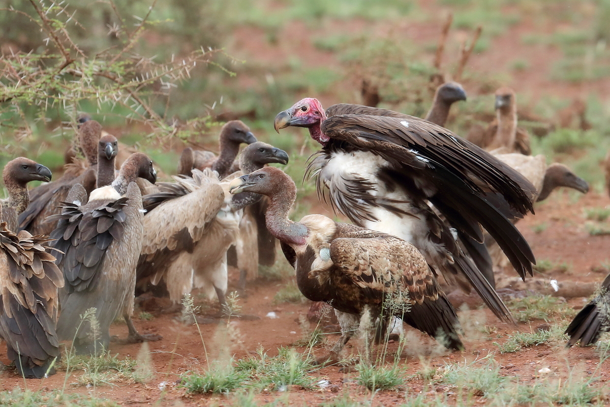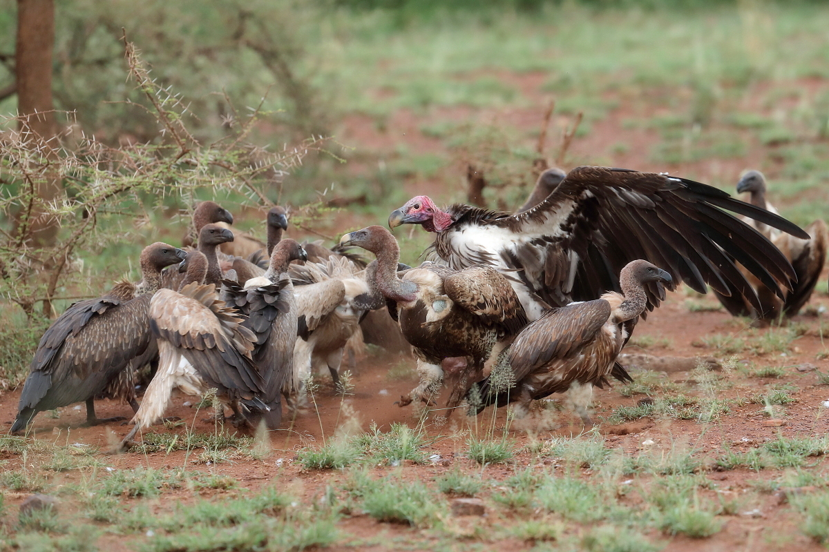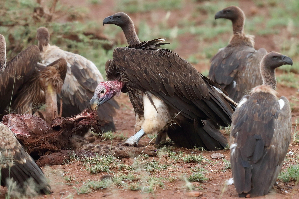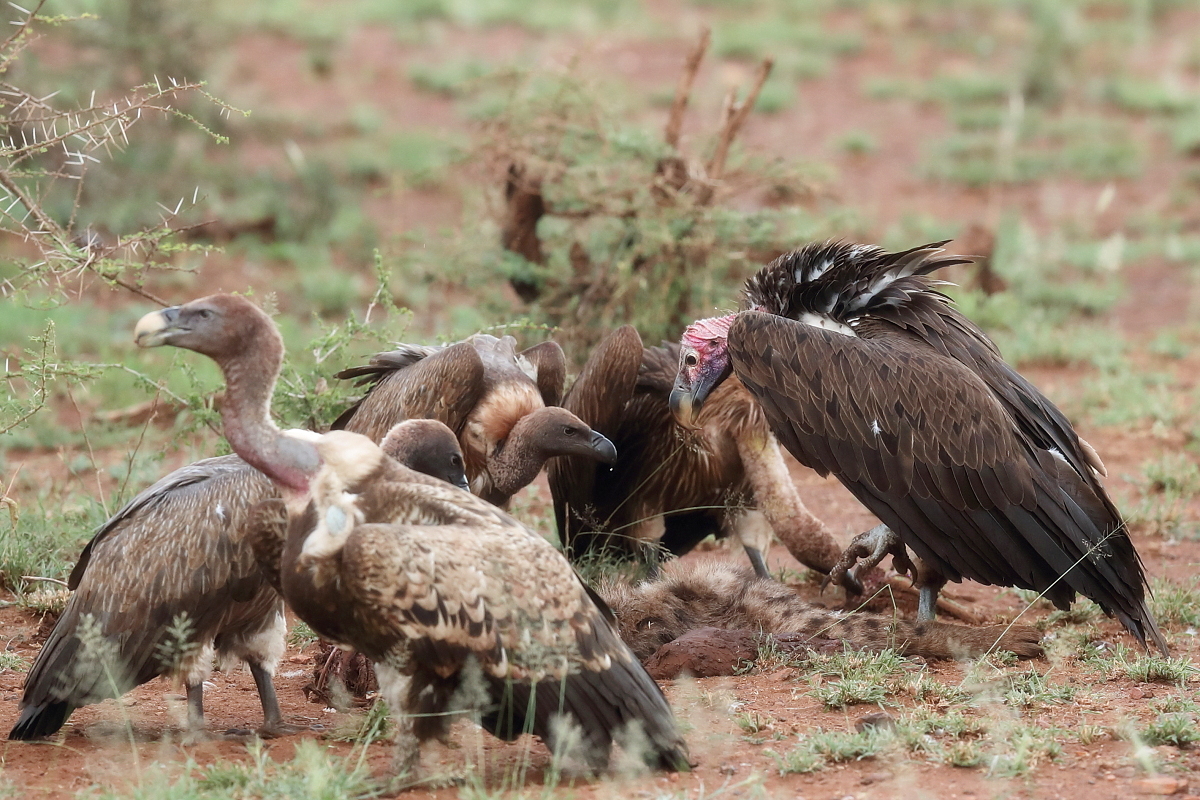 It would be a fact that we always encountered a rueppell's griffon, a lappet-faced vulture and an African white-backed vulture together. However, the most numerous were African white-backed vultures. They were the first at the carrion and instantly started the meal. But as they had already done so, the rueppell's griffon were almost immediately appearing at the meal. They explained quite quickly and effectively to African vultures that it was their turn now. Sometimes they fed together. All this was watched by the Arabian vulture. The vulture assessed the situation slow and easy. But when it came to the conclusion that it was time to start a meal then no creature dared to "discuss" it. It is the largest of African vultures. It happened twice that we found vultures near to carrion. Once zebras and once hyenas. So many pictures were taken that I had enough material for the reconstruction of the gallery of the African white-backed vulture and to build a new gallery of the Arabian vulture and the rueppell's griffon. The enclosed sound recording, however, mostly is the sound of African white-backed vultures, although there may also be voices of Arabian vultures. The text is common to these three species, and the soundtrack is enclosed to the gallery of the White-backed Vultur.
