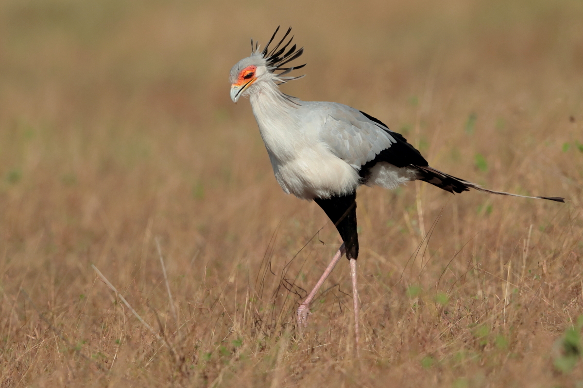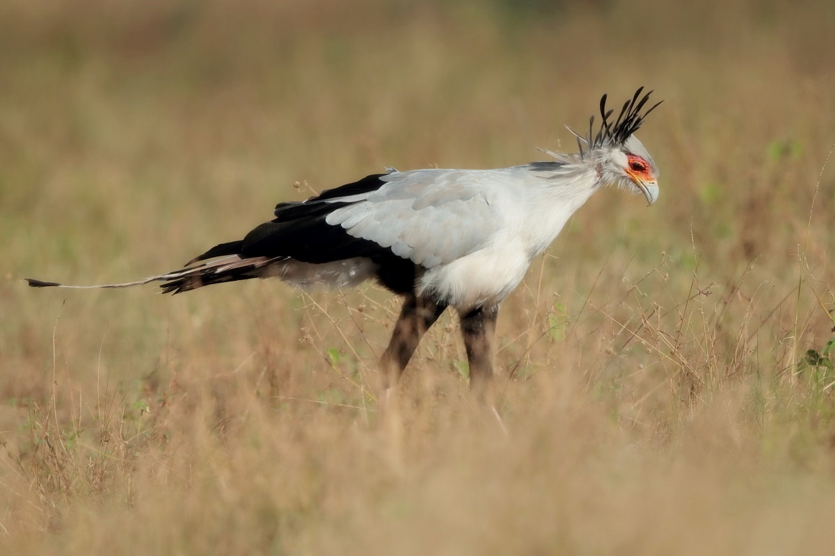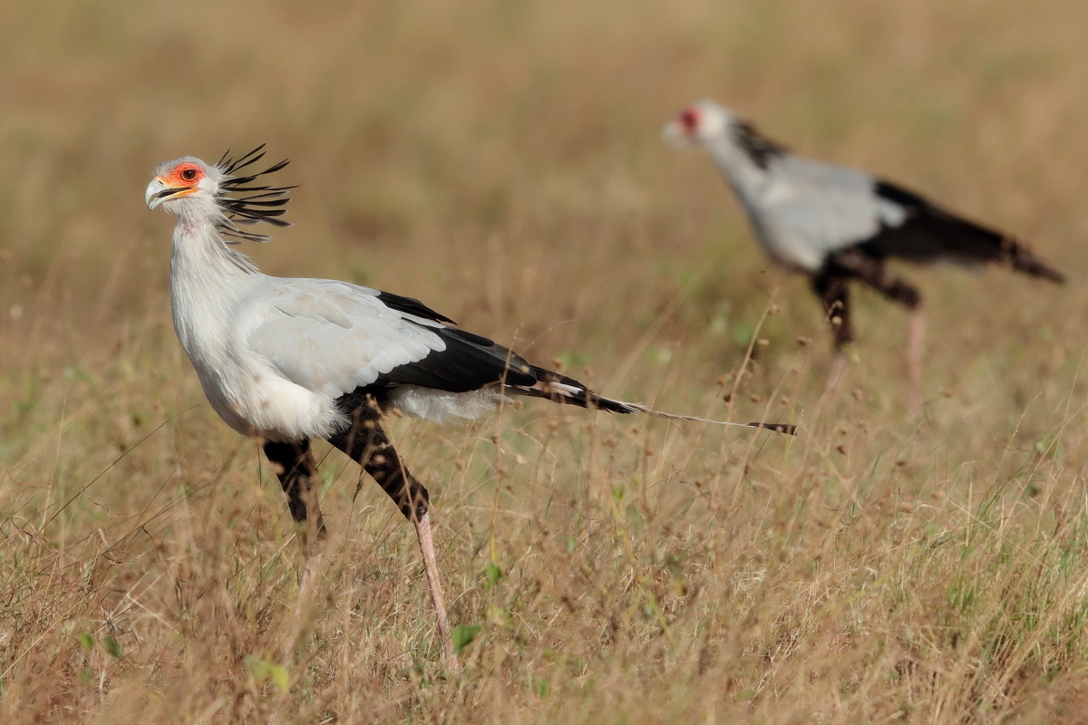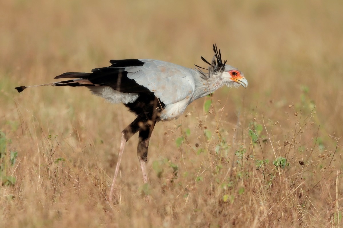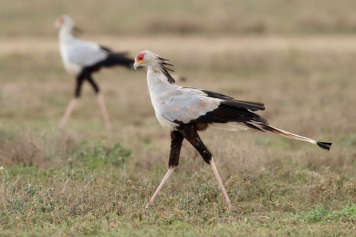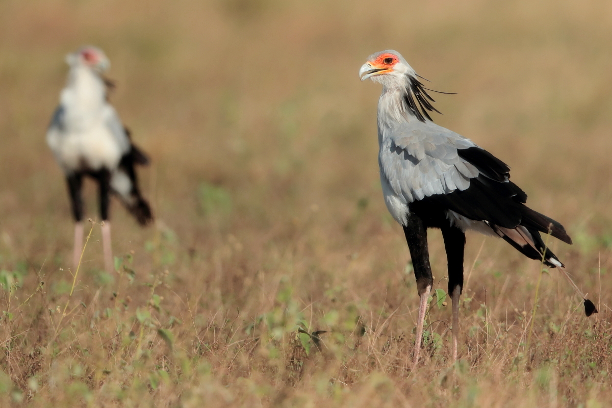 For a long time my head was occupied with the desire to have my own secretary bird's gallery. In South Africa we were already close to a nest, but it later turned out to be abandoned by a pair of secretary birds. The secretary bird is a great individualist among the birds, maybe this is the reason for such fascination, the desire to have my own gallery of the bird, like with another great individualist - the bearded vulture. Secretary birds are found only in Africa, south to the Sahara, in flat, grassy, savanna areas. The bird traverses the savannah like a stroller, occasionally hitting with its foot to scare away insects. This is a specific way of hunting, but it can also preys on lizards and snakes. Stilted legs are especially helpful when looking for food in high grass. As a rule we saw two hunting secretary birds in a short distance one from another. I do not know whether it was a matter of family ties or simply it was a more effective way of hunting for them, and maybe a more secure one?