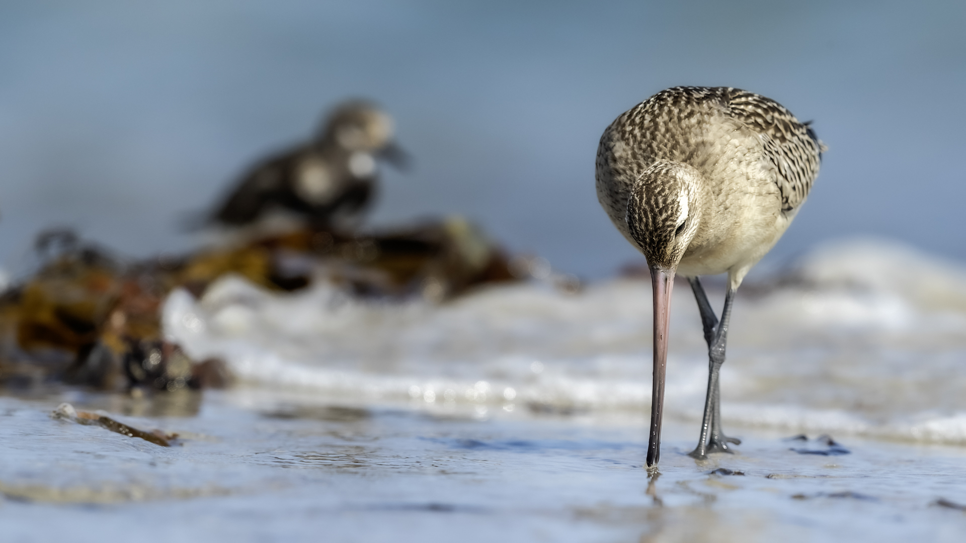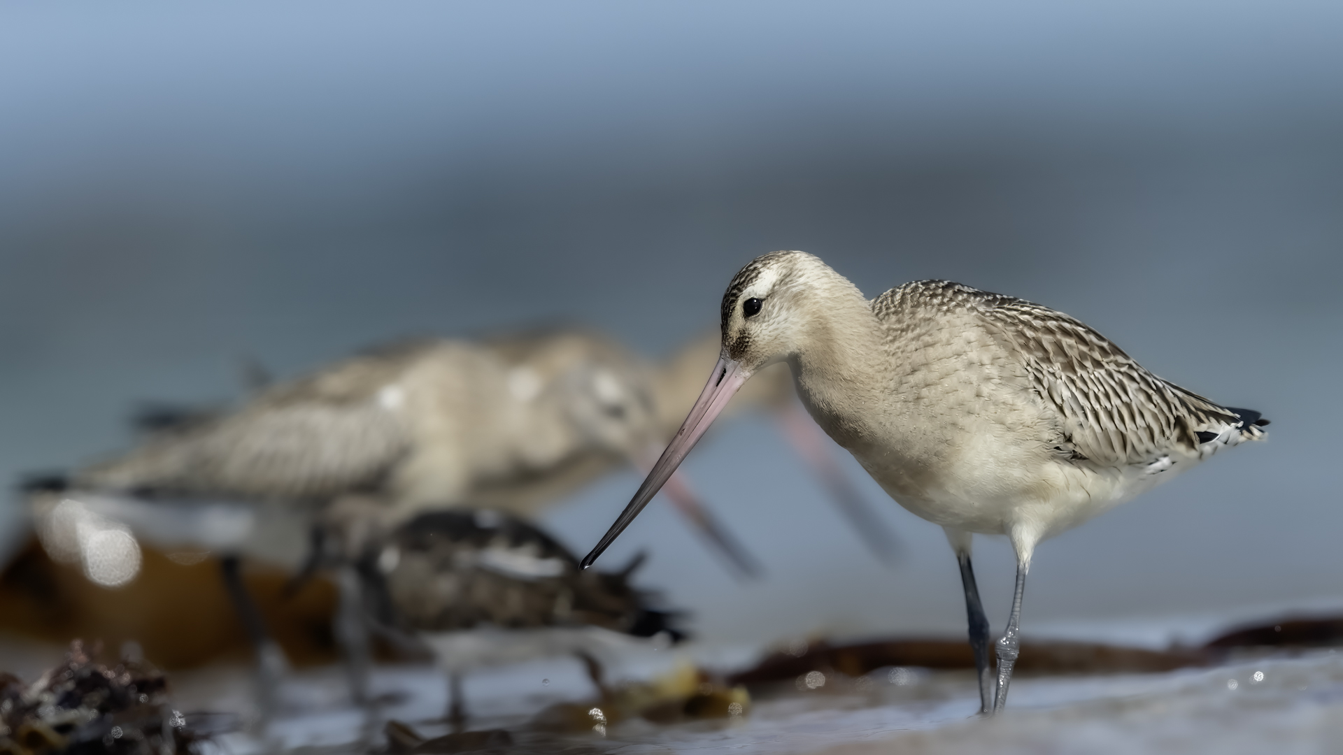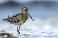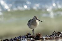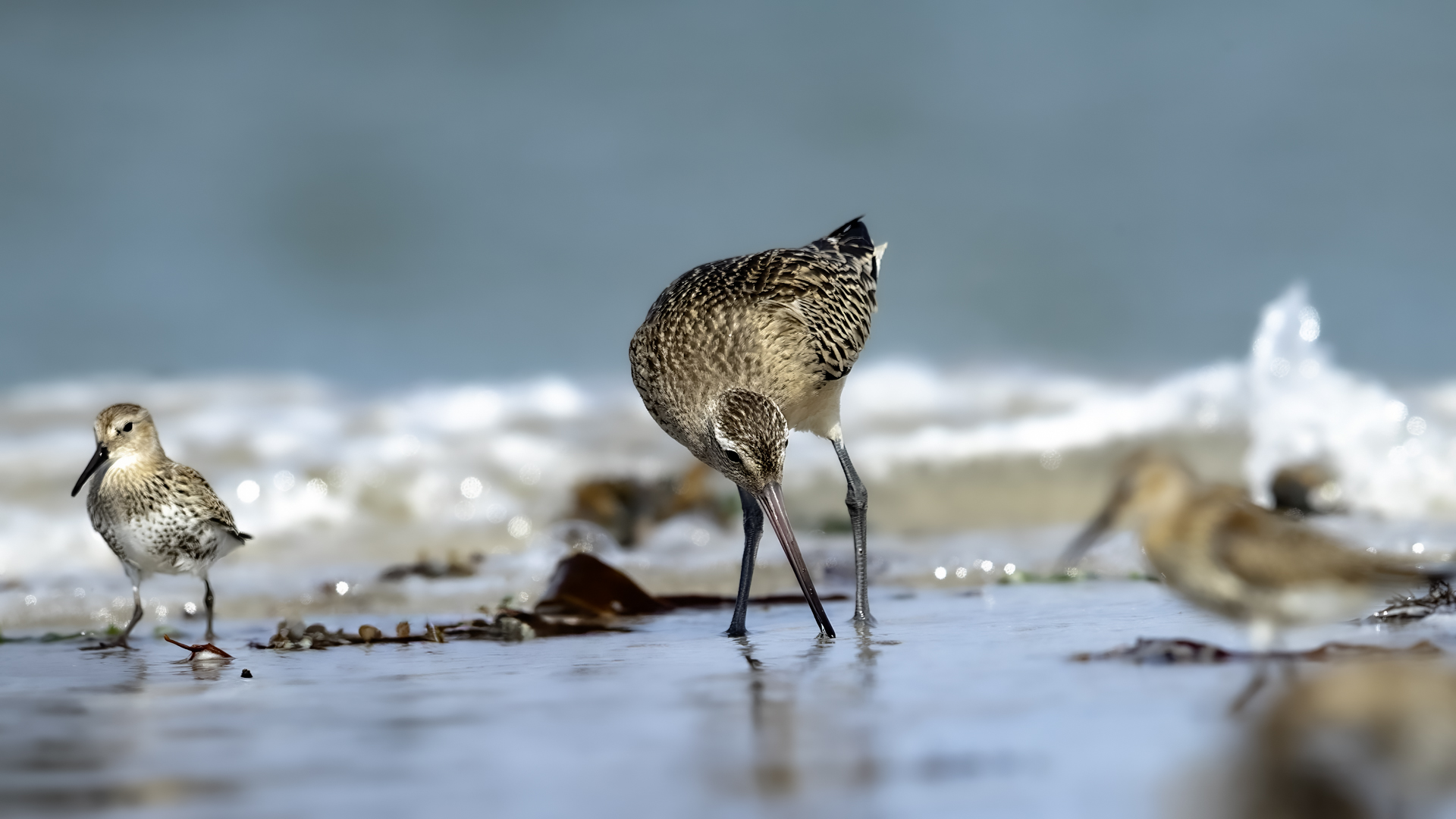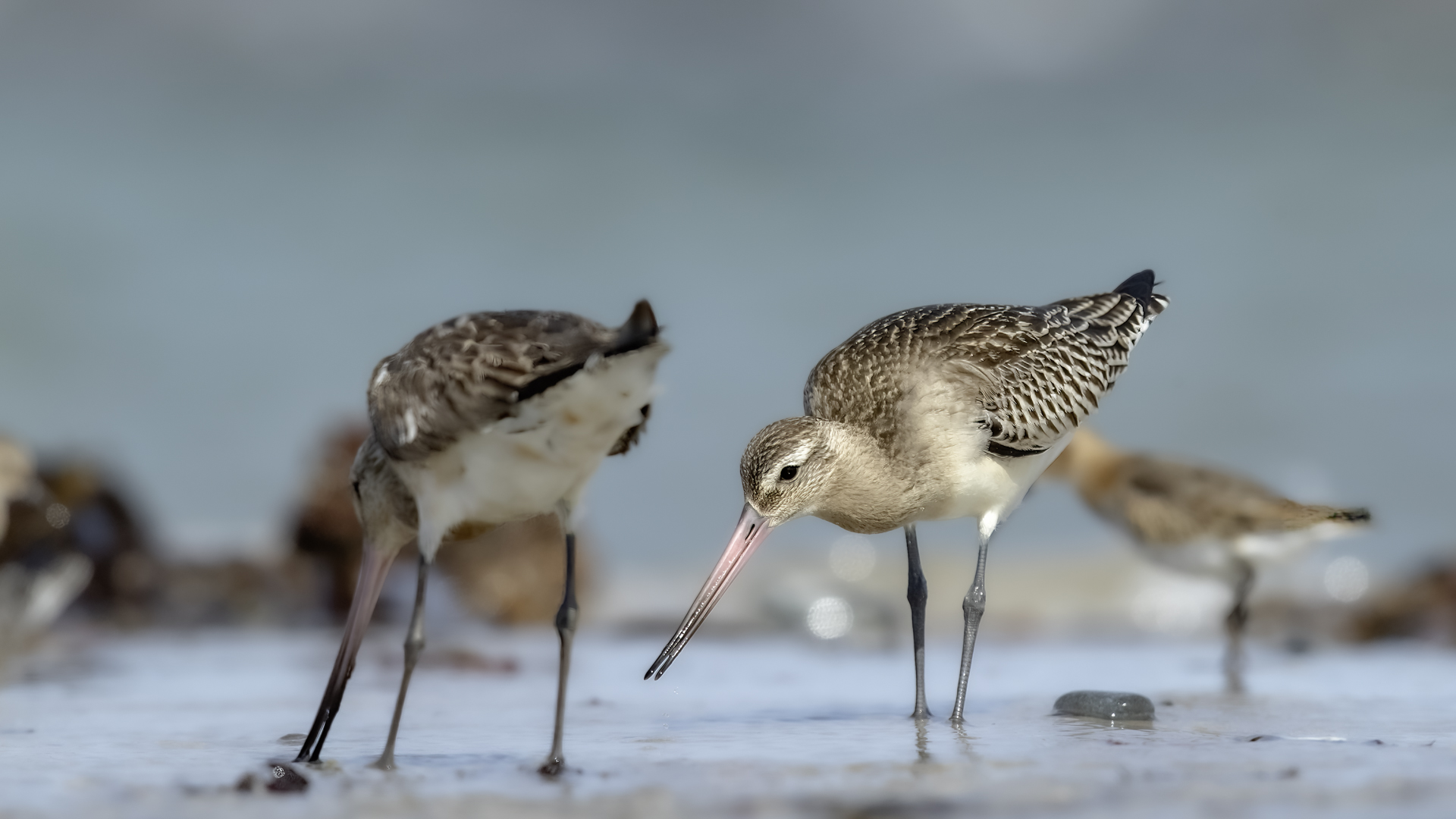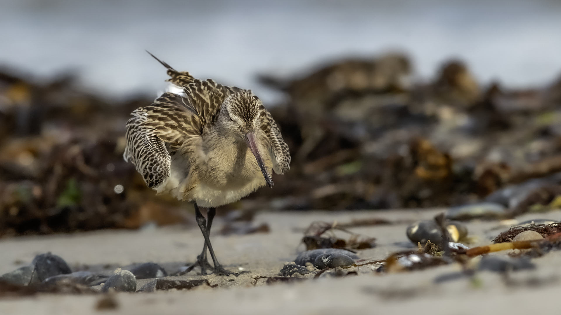 I have stopped counting how many times I was going out to the beach at sunrise in the hope of meeting a bar-tailed godwit. Although it is considered to be common species in Poland, still it is needed to be lucky to photograph it. Of course, taking pictures of this bird in Poland can be possible only when the birds are migrating, in our country it happens in April/May and August/October. There were really several reasons why I wanted to have my own pictures of a bar-tailed godwit. The two of them are its charm and my fascination with this tireless traveler. Tireless, as it holds an official record of the length of uninterrupted bird flight - 8 days and five hours. That much time it took the bar-tailed godwit female to cover a distance of 11.680 km. Well, I cannot help admiring this inconspicuous bird! The weight of the bar-tailed godwit is from 200 to 600 grams. The Earth is not too big for this bird to fly around when it can accomplish such passage. The third reason is that it belongs to the fauna of Poland. If it happens to you that you have the chance to observe the bar-tailed godwit, you can easily take photos, such as those presented, lying peacefully on the beach without any camouflage. The bar-tailed godwit, of course, keeps a distance of a few meters, but it is already enough for taking pictures. The bird when looking for food thoroughly penetrates the coastal bottom with its long beak, dipping into the water every so often. It is so busy that can sometimes get very close. So close that it not always fits in the camera's frame. Several not so short meetings with the bar-tailed godwit ended with the creation of photos for my gallery of this species. Finally!!!