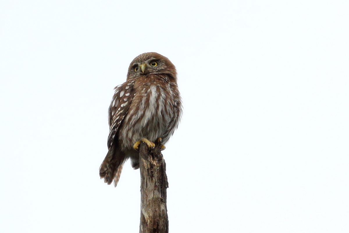 One short event, but I came across four austral pygmy owls. Unfortunately, as it often happens, the sky in the background, in a word, images of a documentary value. Owls were active enough that I was able to record a short sequence of their voice. Its weight does not exceed 100 grams and it relates to females, males are slightly smaller, their weight is no more than 75 grams. The wingspan is about  25 cm.