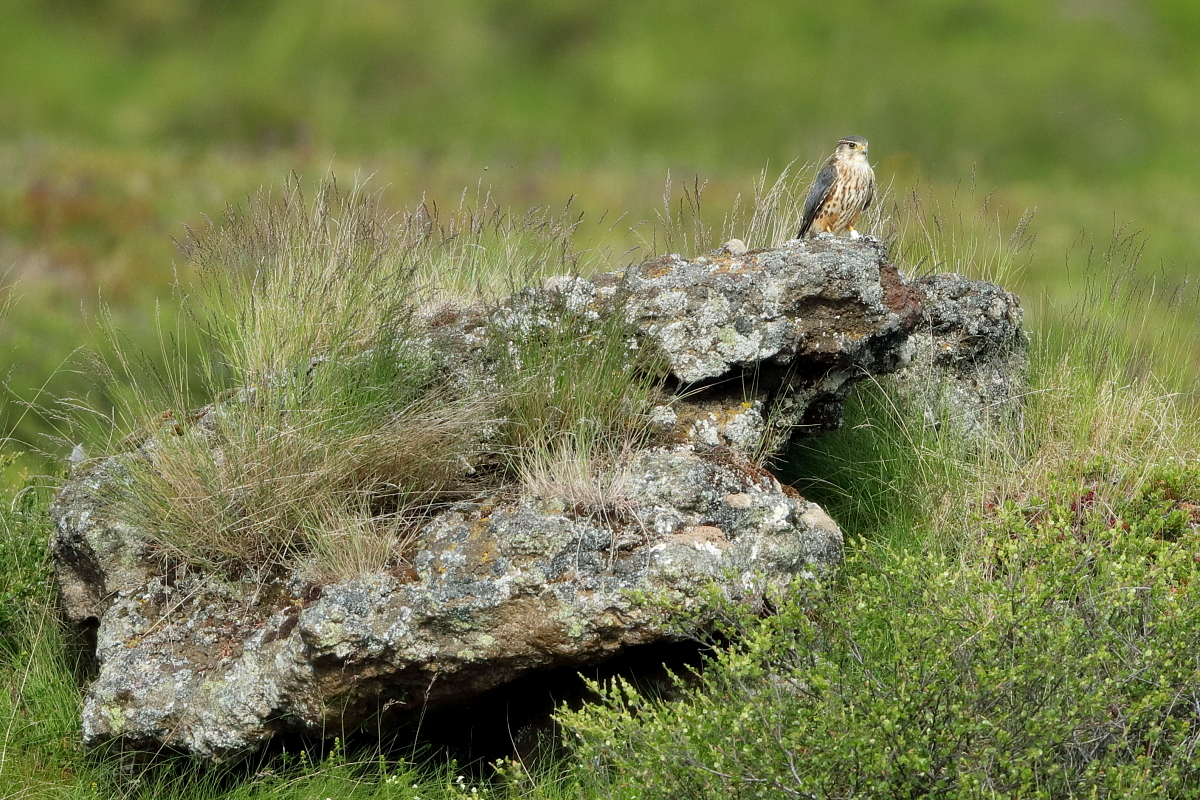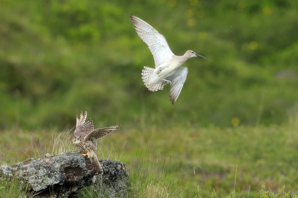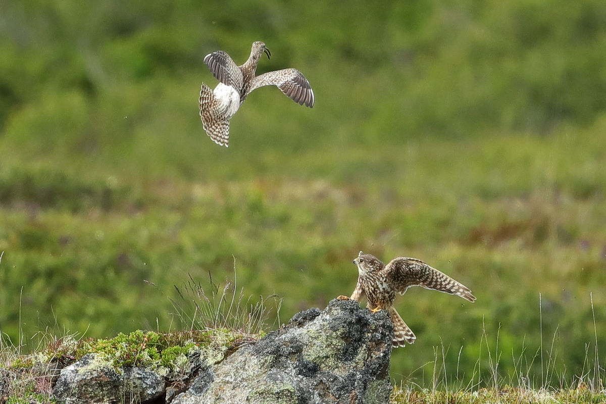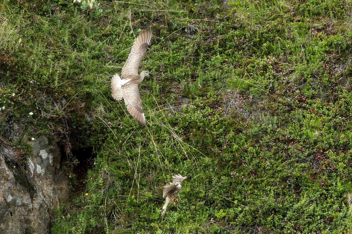 This was my second contact with the merlin, but how different. It is very obvious that I would love to complement the current, practically one-photo gallery of the bird with new photos showing the beauty of this species, but also the environment in which it lives. Such gallery looks interesting, full and makes me willing to look at these images again and again. Staying in Iceland was a good time to find a place (well, Johann - you found it!) where finally more pictures of this falcon could be taken. And we did it in a sense by accident. Despite the fact that we were looking for a merlin in several places that it was said to occur, it could not be observed there. This time just from the public road we were searching for a harlequin duck, when suddenly on a soaring rock, on the top of it, Johann noticed four gray chicks of a merlin lying in a nest in the grass. Unfortunately, it was almost midnight and we had to get some sleep but we returned in the morning to make the merlin’s photo session. We sat under the camouflage nets near the public road. Of course, a pair of parents noticed us but only the merlins’ mother flew over our heads to do a threat assessment. Then the normal daily life of the family started. The female was always close to the nest and ready to react to emerging threats, like of skuas. The male, on the other hand, hunted and gave the prey to the female, who carried food to the nest and fed the young. Its predatory instinct of a female, or perhaps the need to provide more food for the young, was so strong that it penetrated nearby all the places where other birds could have their nests. That's how she got into conflict with a pair of whimbrels. The whimbrels strongly repelled attacks of the falcon. Unfortunately, most of the photos were taken from a considerable distance and framing was necessary. When I tried to take photos of birds' quarrels scene I instinctively pressed the shutter on the largest dynamic object in the frame, which later, while watching photos on the computer screen, turned out to be a whimbrel. But this time in fact I was more interested in the smaller rare species of birds – merlin than in the whimbrel. Nevertheless, Iceland again offered another beautiful spectacle. Well, as usually lack of time, if I could spend a few days more, I would have the possibility to take amazing photos as documentation of merlins’ habits and their struggle for raising their offspring.