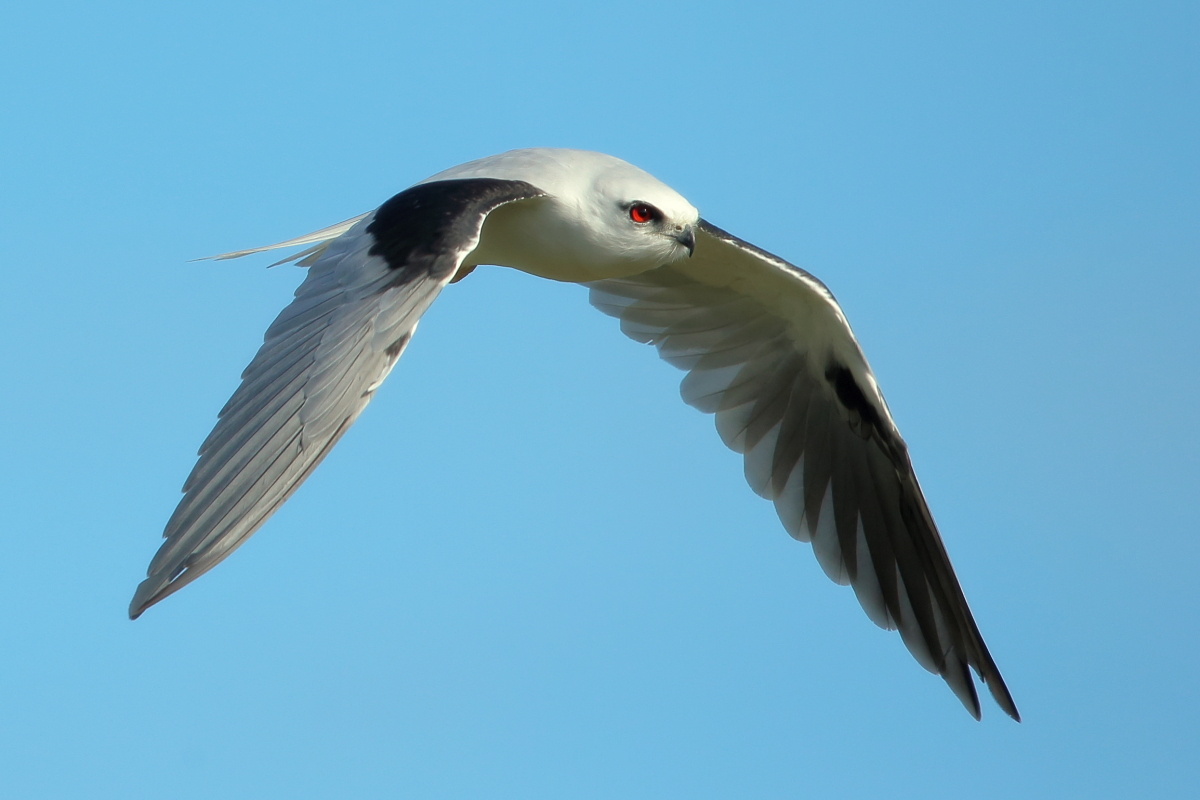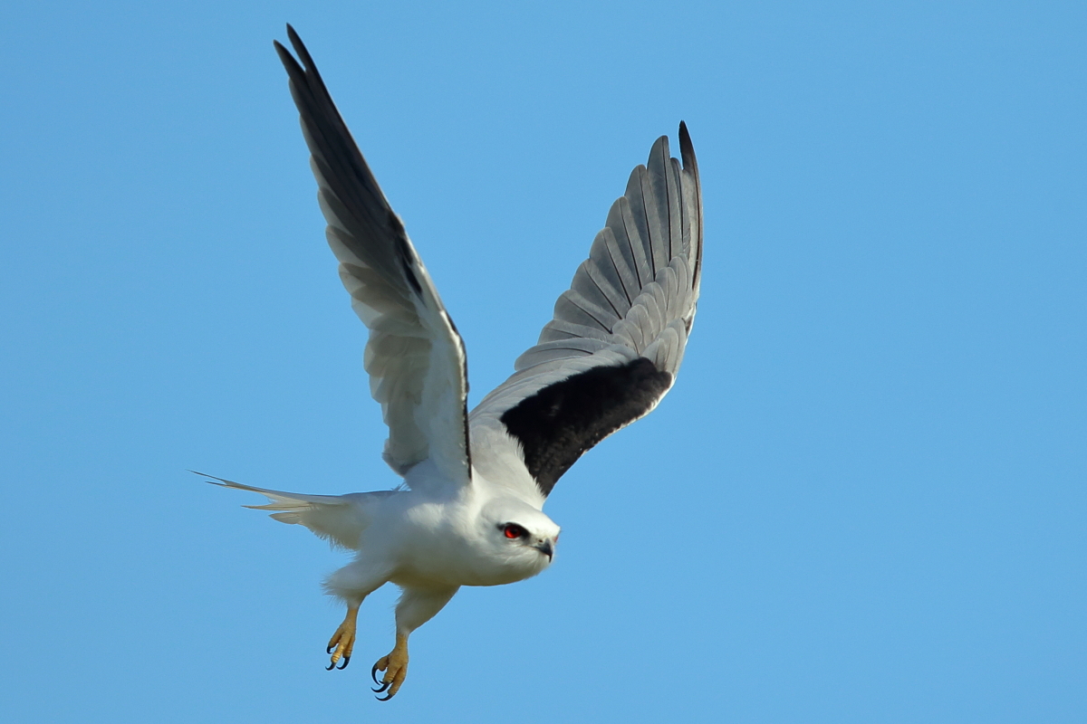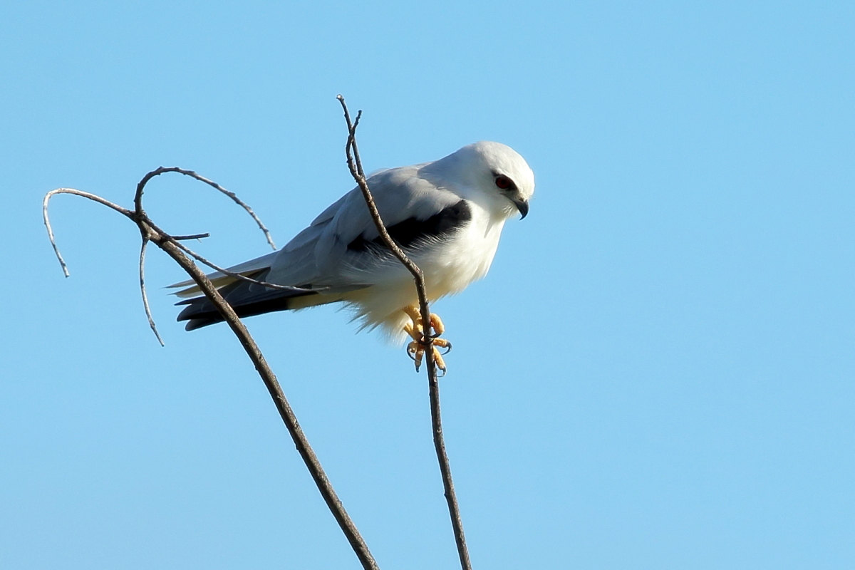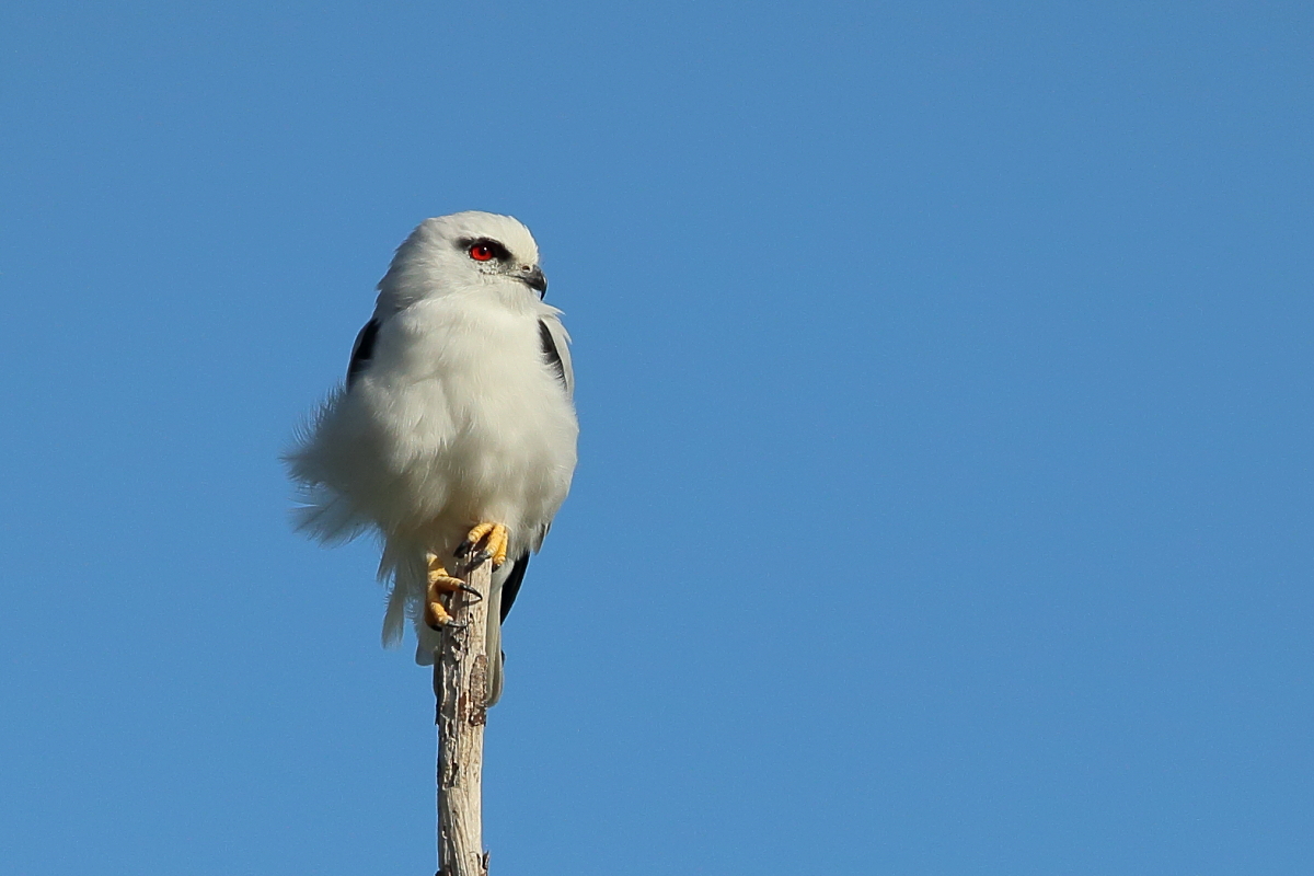 The Black-shouldered Kite or else a short story about how the gallery was created based practically on one approach. Before leaving for Australia I read about the Black-shouldered Kite and found its distinctness about coloration so strange that it seemed very interesting to have such images in the gallery. For a bird with almost white plumage more natural habitat should be in winter climate, but here we have in hot Australia a raptor of such a plumage. Black-shouldered kites belong to the family of Accipitridae and are quite filigree because their weight does not exceed 350 grams . "My" Kite posed for a photo once just for a moment. And so quite specific gallery of " the Black-shouldered Kite anatomy " and its departure was created. Closely watching it I could capture its every move. The pictures did not need framing. The Black-shouldered Kite had its eye on me but apparently the distance of about a dozen meters between us was acceptable to it. What a great joy, almost snow-white raptor with  red eyes looks impressive, I wish I had more pictures and not with the sky in the background, as it often happened in Australia, but other ones diversifying the gallery. Luckily it was so close to me that I was able to take pictures showing anatomically its plumage and beauty, as well as its departure.
