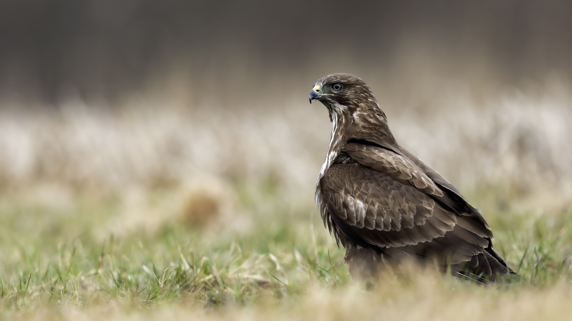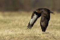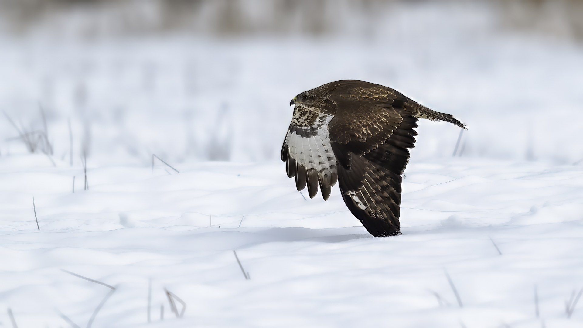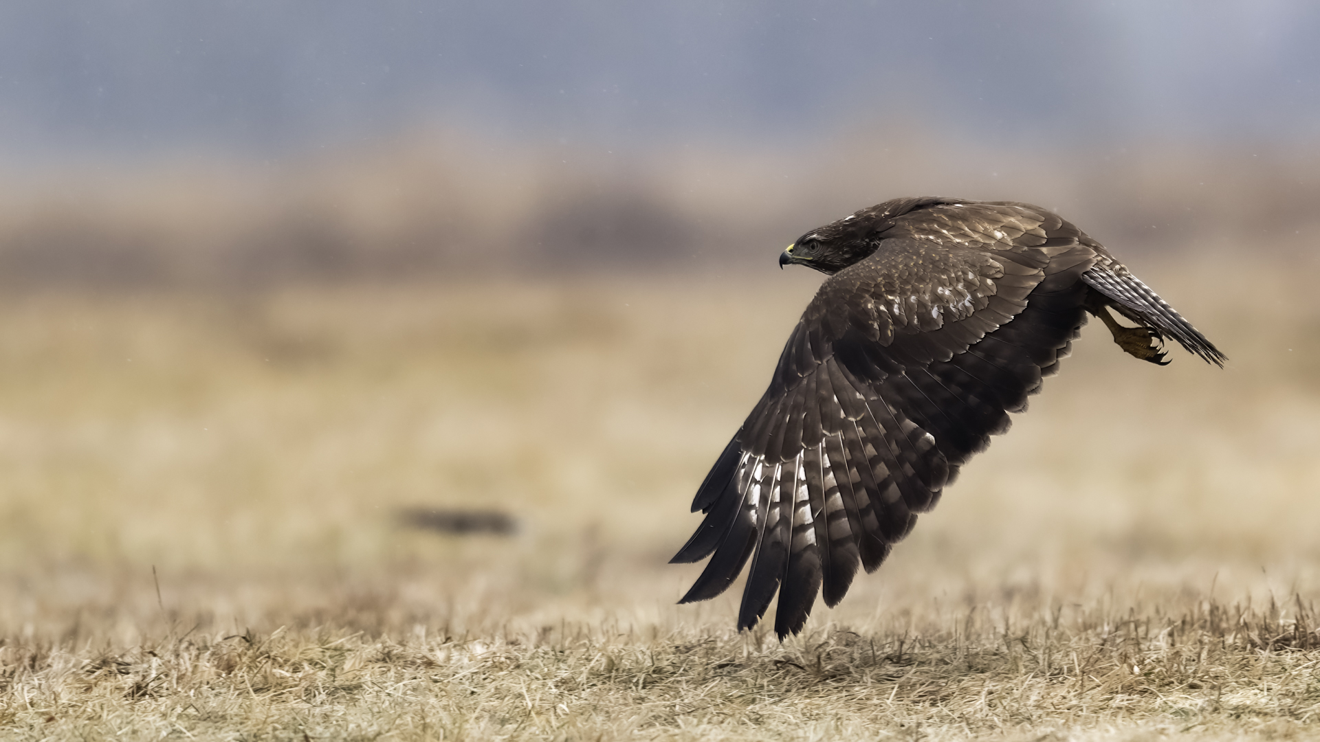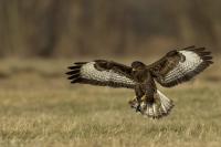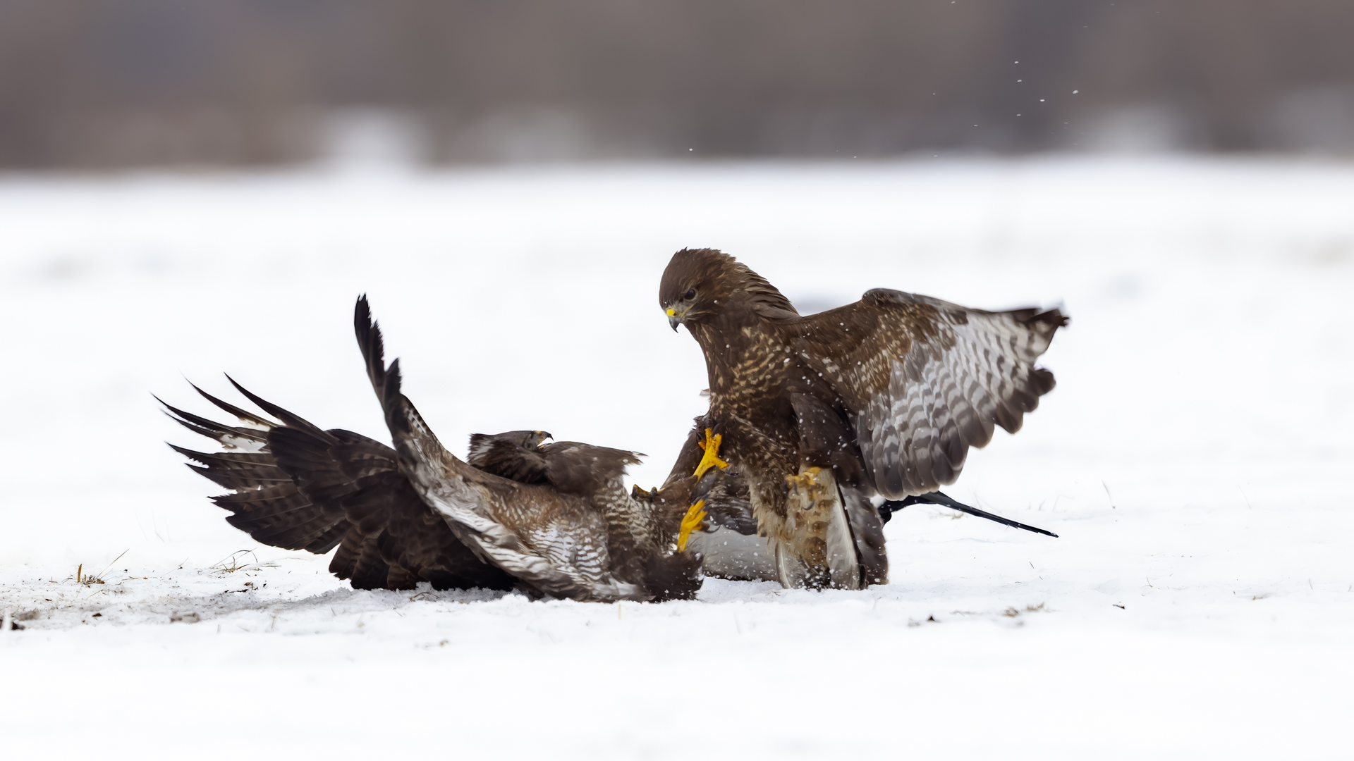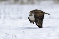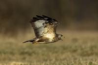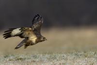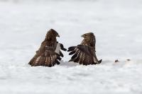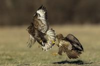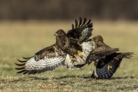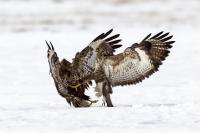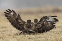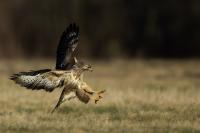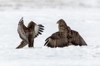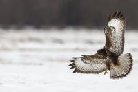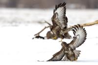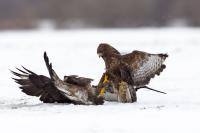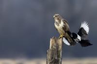 It is my biggest gallery, along with a White-tailed Eagle. It is caused by the fact that they are often the first quests at the watching spot, before White-tailed Eagles arrive. Undoubtly they are one of beautiful, majestic predators. Its population grows, to the point, where it can be photographed on the outskirts of cities and towns, not to mention their watching points along the roads. Of course, as a predator it is quite timid and has got a very good eyesight. So if we make a move in the forest it will most likely spot us and fly away. As always, with observation and photographing I recommend camouflage and easy moves. While you observe Buzzards you can see how good eyesight they have. From around 100 metres, sitting on a bale of straw, he has spotted a mouse, which life was about to come to an end, in a matter of seconds. After literally small spiring with a sliding flight it fell on its victim and returned to the observation point to eat its prey. Buzzard is our medium sized predator, surely most widespread. Some sources say there are even tens of thousands of couples in Poland. It weighs around 1 kilogram and its wingspan is around 1.2 meters.