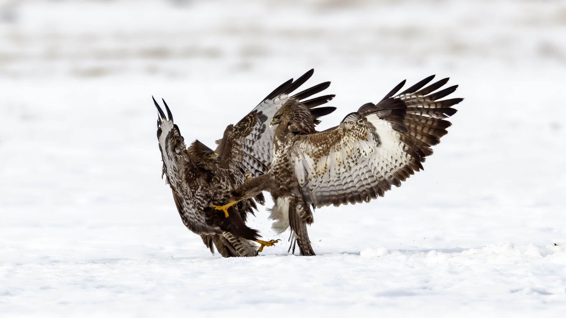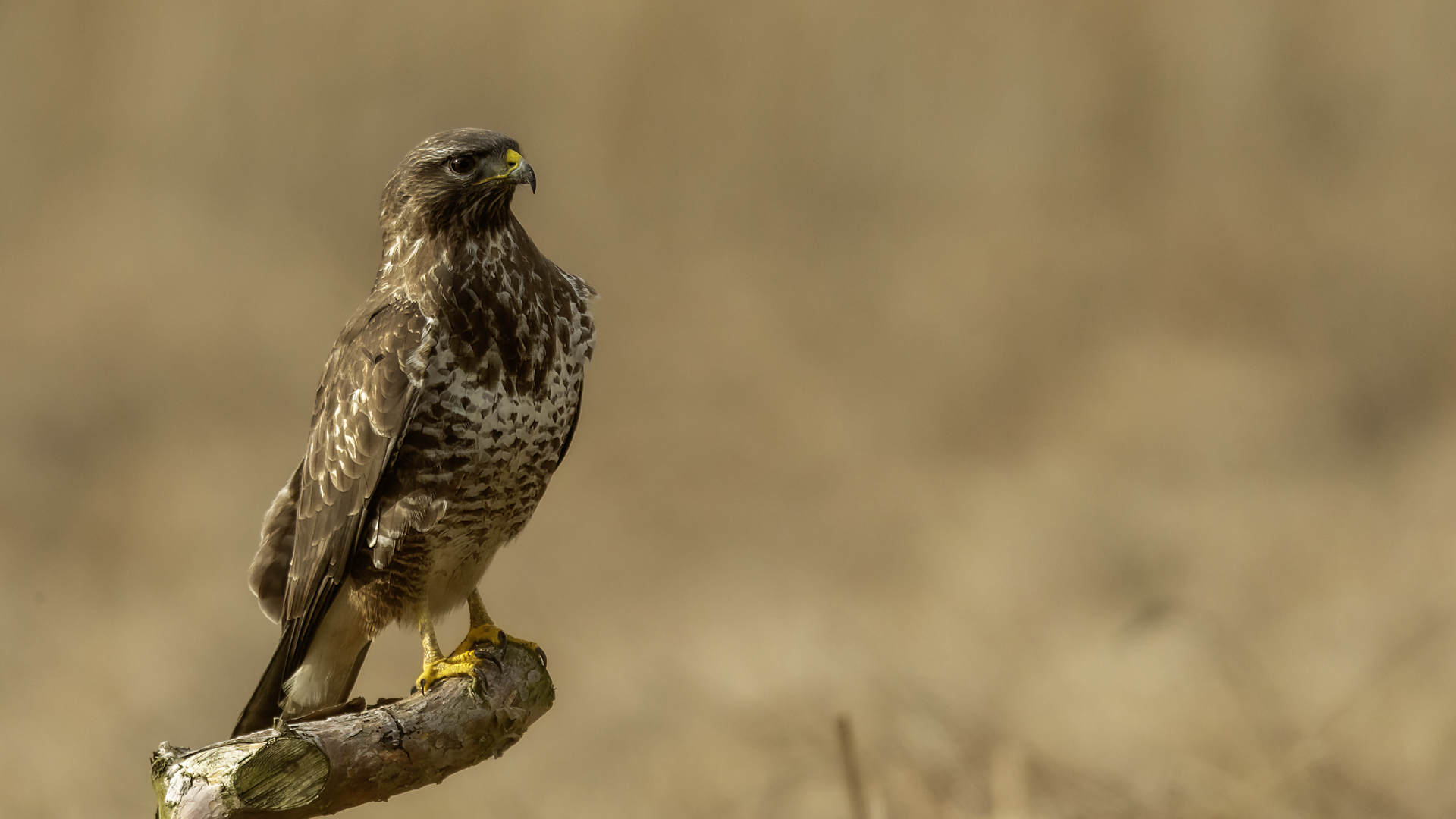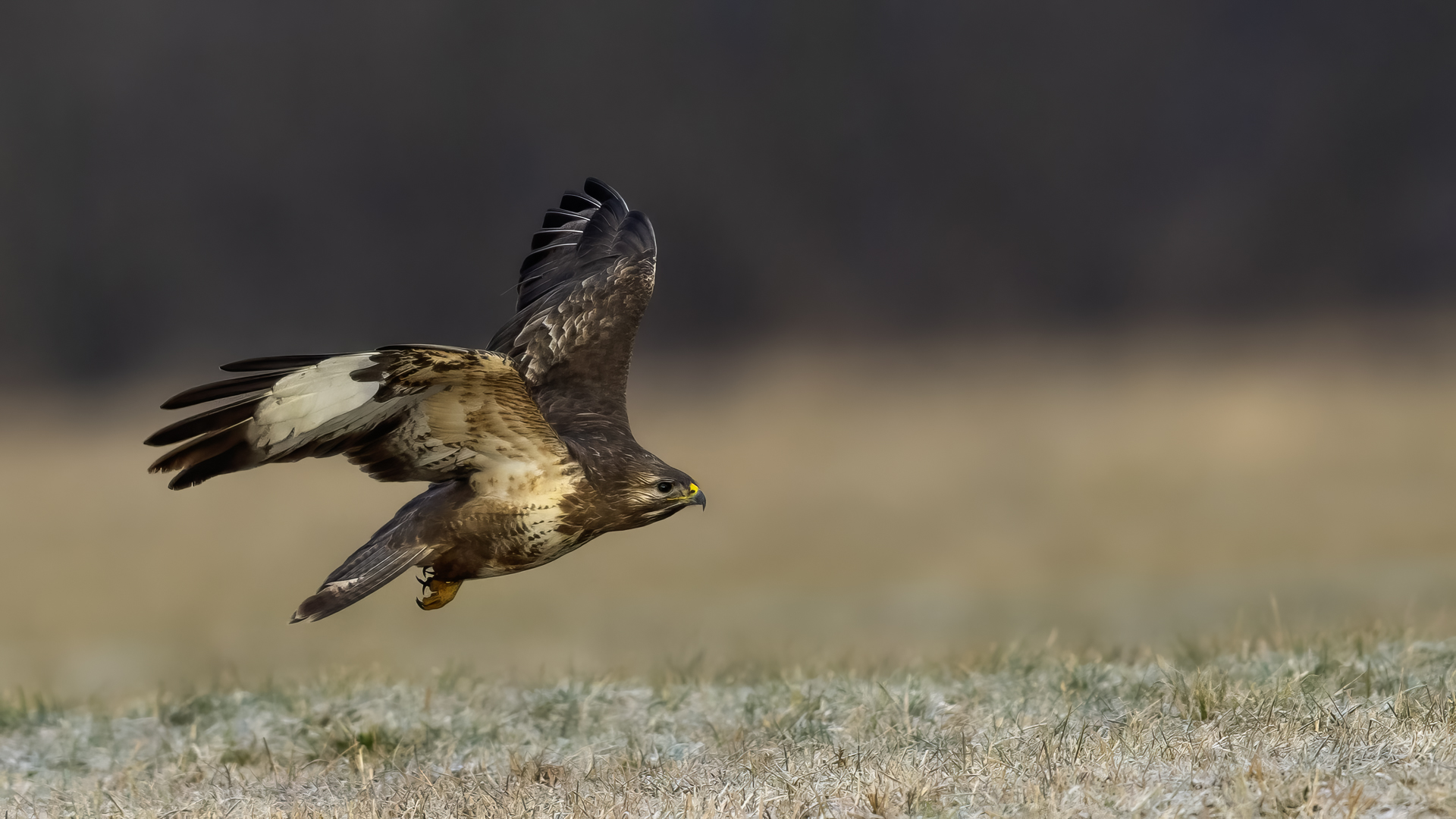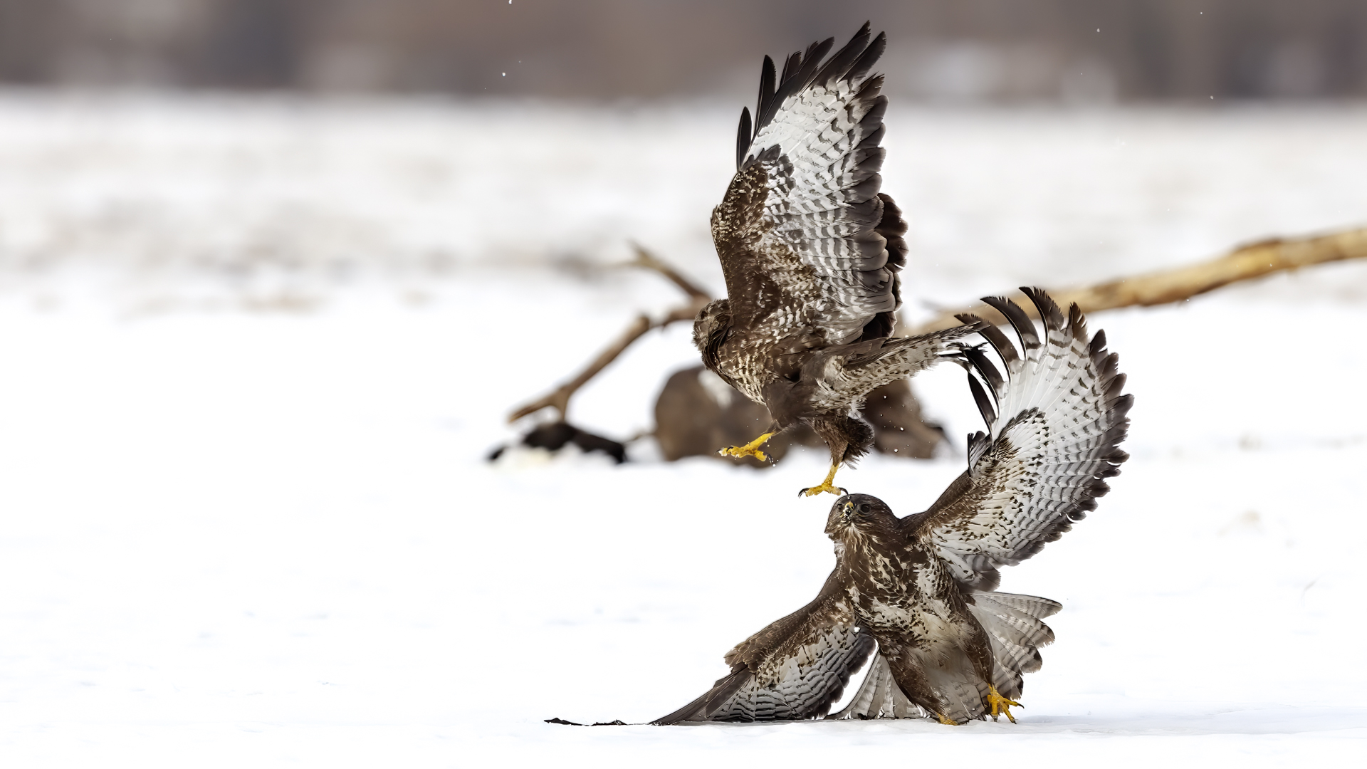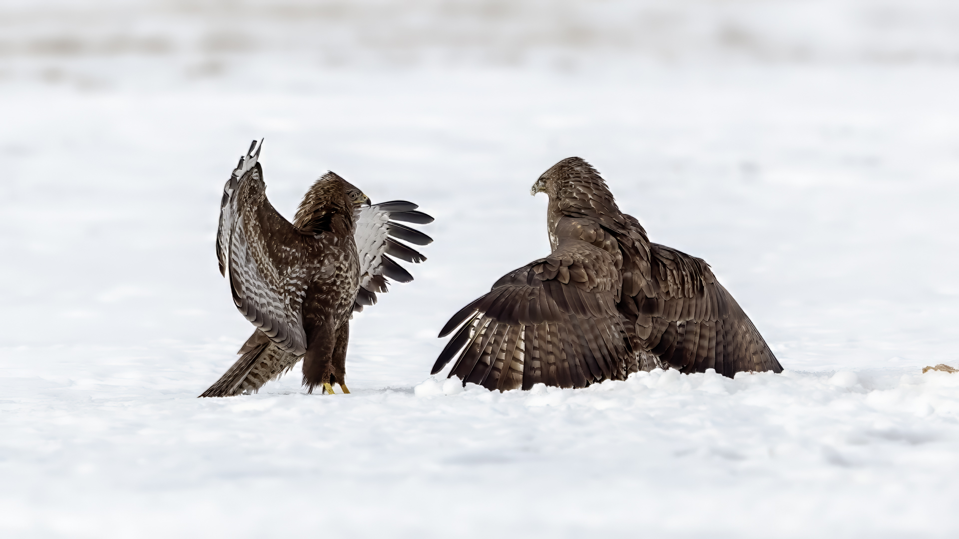 It is my biggest gallery, along with a White-tailed Eagle. It is caused by the fact that they are often the first quests at the watching spot, before White-tailed Eagles arrive. Undoubtly they are one of beautiful, majestic predators. Its population grows, to the point, where it can be photographed on the outskirts of cities and towns, not to mention their watching points along the roads. Of course, as a predator it is quite timid and has got a very good eyesight. So if we make a move in the forest it will most likely spot us and fly away. As always, with observation and photographing I recommend camouflage and easy moves. While you observe Buzzards you can see how good eyesight they have. From around 100 metres, sitting on a bale of straw, he has spotted a mouse, which life was about to come to an end, in a matter of seconds. After literally small spiring with a sliding flight it fell on its victim and returned to the observation point to eat its prey. Buzzard is our medium sized predator, surely most widespread. Some sources say there are even tens of thousands of couples in Poland. It weighs around 1 kilogram and its wingspan is around 1.2 meters.