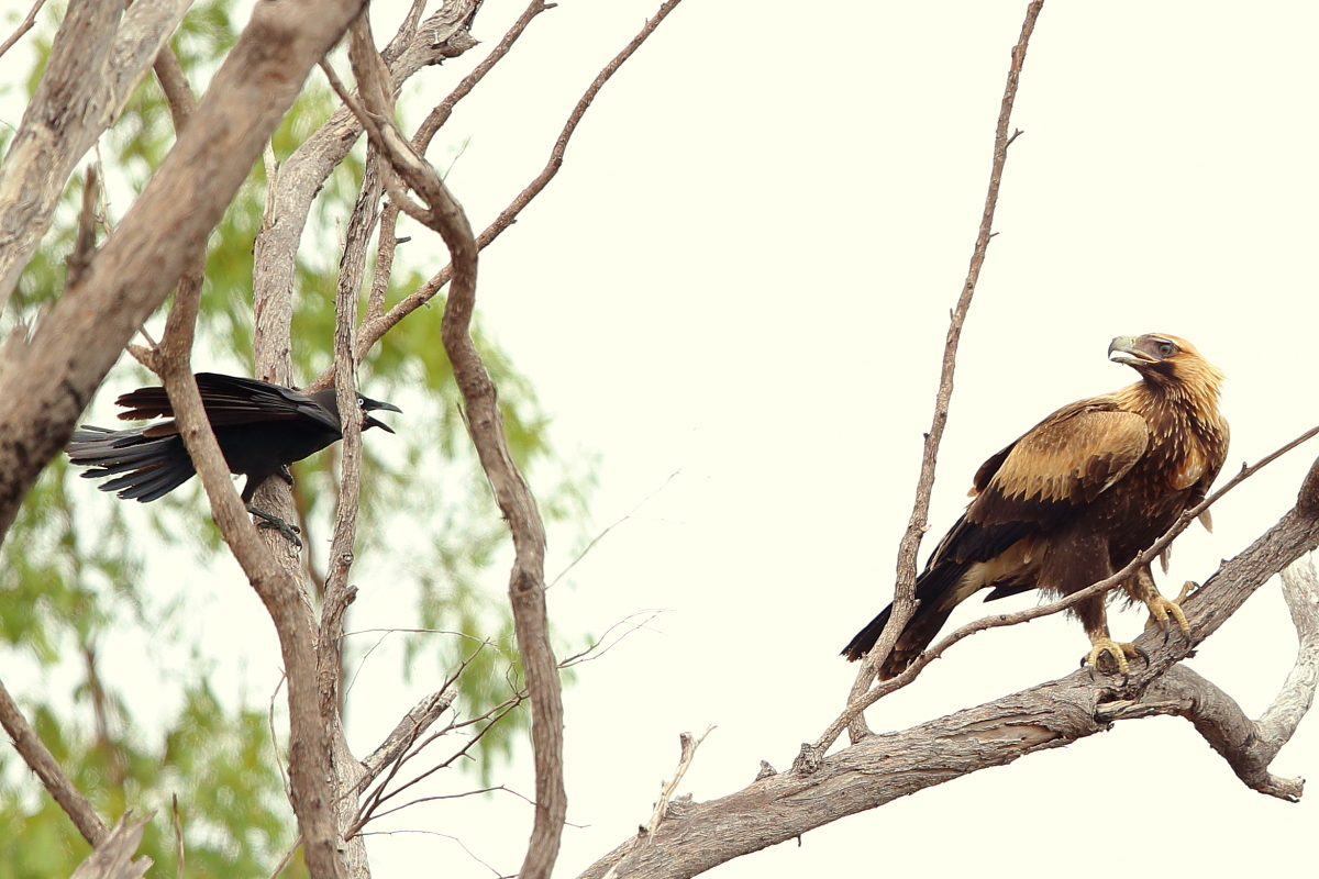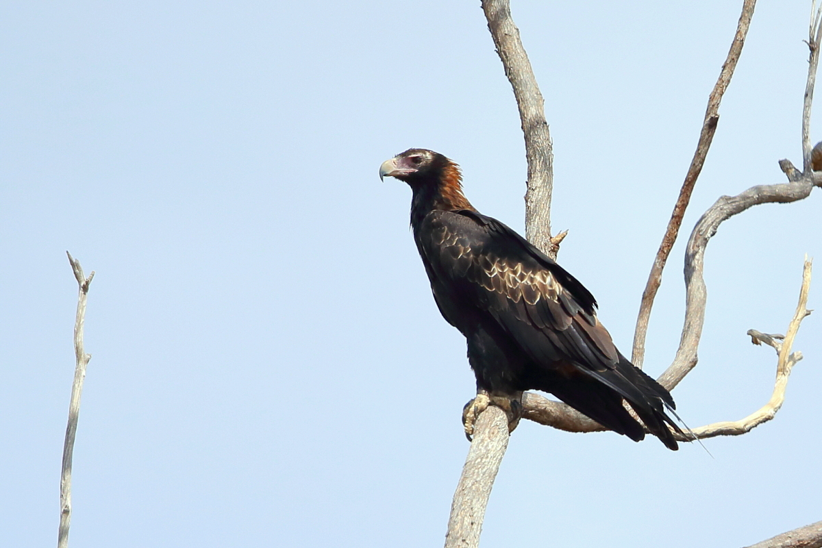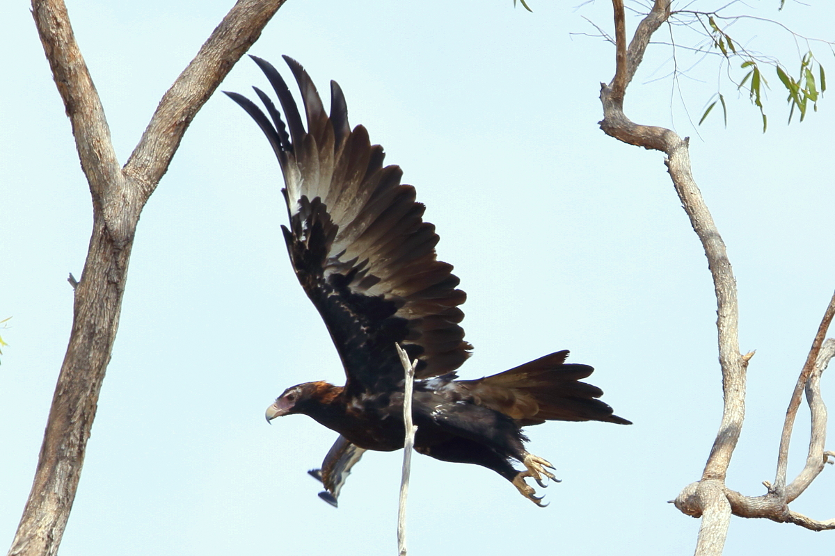 Shooting such a large bird of prey is always exciting. It is really a beautiful bird, although I was not sure if I was dealing with one or two species. Such large variability prompted me to verify the name of species. The Wedge-tailed Eagle is the largest Australian bird of prey. Its weight may exceed 5 kilograms and a wingspan 2.5 meters, supposedly even some specimens were measured which wingspan was 2.8 meters. Physically very similar to our white-tailed eagle. The biggest difference, in my view, is the way the pictures were taken. While we were driving through the bush every now and then carrion of  whiptail wallabies and kangaroos could be seen. On roads where a car is a real rarity an accident happens so easily, especially at dawn and dusk. When nearly 50 meters long three-unit lorries gather speed there is no chance for drivers to brake the vehicle seeing an animal on the road. Birds of prey benefit from the effects of such collisions, and this is why it did not take long to find them. It is interesting that the eagle allowed to take photos, even though it had noticed us earlier it did not take its wings off the ground. The desire to finish an easy meal was stronger. Such situation could not take place in Poland, even in harsh winter conditions the sea eagle would fly away making it impossible to take pictures. So in Poland it is hard to take good photos without lookouts, but in Australia - who knows? Of course, the quality of these images differ from those made in the lookouts, in which the birds often are presented with beautiful forest in the background. Here in Australia I was always had the sky in the background. Watching in traditional way with not too much camouflaging would be possible, especially since in the area of tens kilometers it was no problem to find a decoy for eagles. But such shooting brings other questions and concerns. How long could we last when the temperature indicated in the shade was 30, 35 degrees and whether other animals, which could prove to be dangerous for human beings, would like to hide in the same shadows as well? But let us leave these questions for the future, till the next attempts of shooting Australian eagles ;-). And for sure it would be worth trying because they are beautiful, majestic and powerful birds. As I mentioned it with ravens, Wedge-tailed eagles also are harassed by them, as they do not tolerate eagles’ company. Of course they keep  distance and always approach from behind, as it befits "courageous" birds and they are restless in the pestering.  The Wedge-tailed Eagle belongs to the family Accipitridae. During the mating season the birds perform amazing stunts in the air, including playing "chicken". Coupled with their claws they dive down towards the ground making circles. The first to break free and fly away - loses. It is quite surprising, especially when you can see birds that fall into trees risking injury, what for them means only one – the worse. I wish I had seen it and photographed, but it requires a completely different resources and time commitment. So for now I present a few pictures of this beautiful, the largest Australian bird predator.