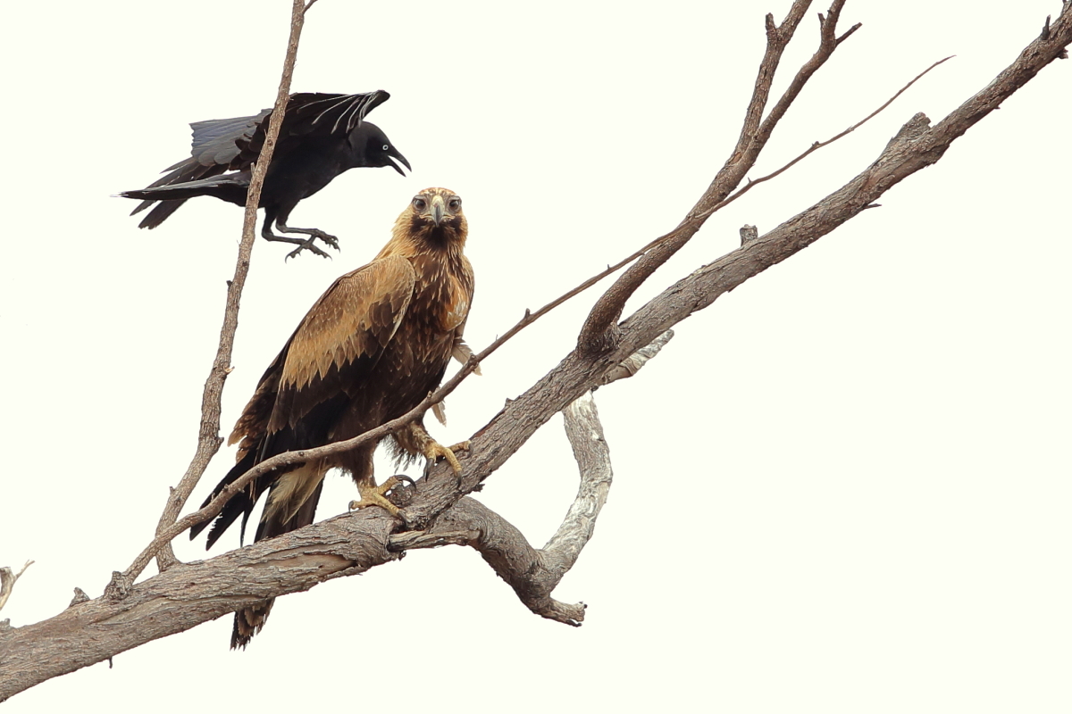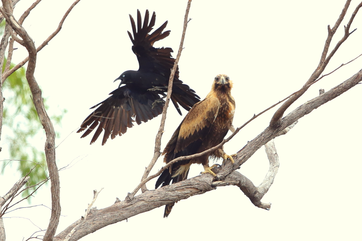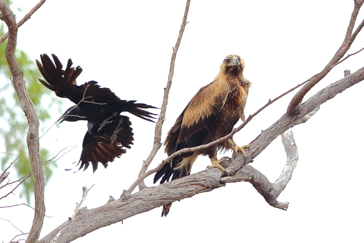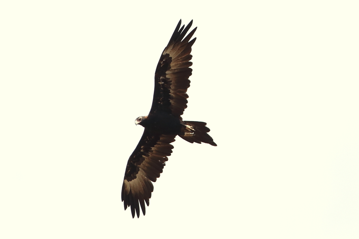 Shooting such a large bird of prey is always exciting. It is really a beautiful bird, although I was not sure if I was dealing with one or two species. Such large variability prompted me to verify the name of species. The Wedge-tailed Eagle is the largest Australian bird of prey. Its weight may exceed 5 kilograms and a wingspan 2.5 meters, supposedly even some specimens were measured which wingspan was 2.8 meters. Physically very similar to our white-tailed eagle. The biggest difference, in my view, is the way the pictures were taken. While we were driving through the bush every now and then carrion of  whiptail wallabies and kangaroos could be seen. On roads where a car is a real rarity an accident happens so easily, especially at dawn and dusk. When nearly 50 meters long three-unit lorries gather speed there is no chance for drivers to brake the vehicle seeing an animal on the road. Birds of prey benefit from the effects of such collisions, and this is why it did not take long to find them. It is interesting that the eagle allowed to take photos, even though it had noticed us earlier it did not take its wings off the ground. The desire to finish an easy meal was stronger. Such situation could not take place in Poland, even in harsh winter conditions the sea eagle would fly away making it impossible to take pictures. So in Poland it is hard to take good photos without lookouts, but in Australia - who knows? Of course, the quality of these images differ from those made in the lookouts, in which the birds often are presented with beautiful forest in the background. Here in Australia I was always had the sky in the background. Watching in traditional way with not too much camouflaging would be possible, especially since in the area of tens kilometers it was no problem to find a decoy for eagles. But such shooting brings other questions and concerns. How long could we last when the temperature indicated in the shade was 30, 35 degrees and whether other animals, which could prove to be dangerous for human beings, would like to hide in the same shadows as well? But let us leave these questions for the future, till the next attempts of shooting Australian eagles ;-). And for sure it would be worth trying because they are beautiful, majestic and powerful birds. As I mentioned it with ravens, Wedge-tailed eagles also are harassed by them, as they do not tolerate eagles’ company. Of course they keep  distance and always approach from behind, as it befits "courageous" birds and they are restless in the pestering.  The Wedge-tailed Eagle belongs to the family Accipitridae. During the mating season the birds perform amazing stunts in the air, including playing "chicken". Coupled with their claws they dive down towards the ground making circles. The first to break free and fly away - loses. It is quite surprising, especially when you can see birds that fall into trees risking injury, what for them means only one – the worse. I wish I had seen it and photographed, but it requires a completely different resources and time commitment. So for now I present a few pictures of this beautiful, the largest Australian bird predator.