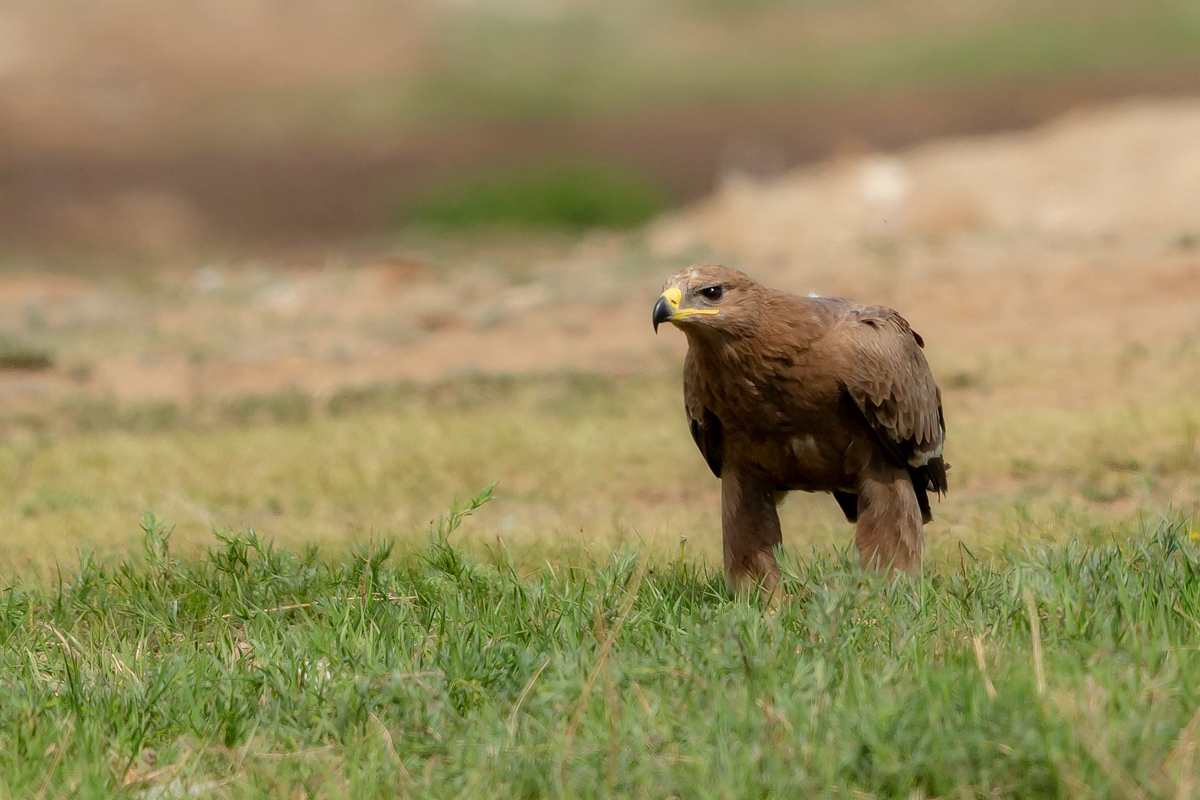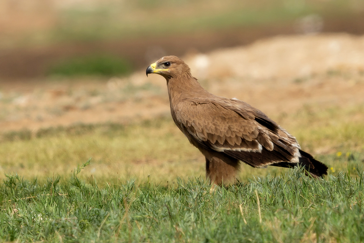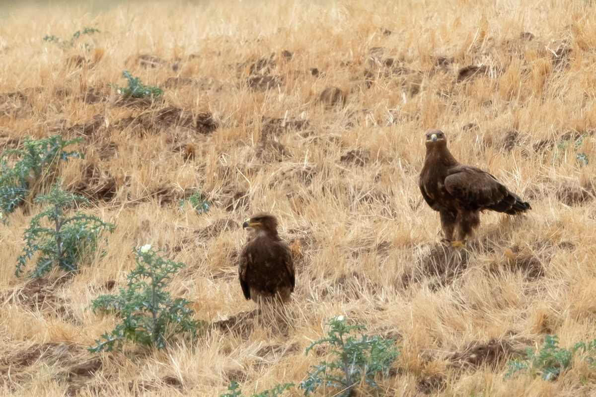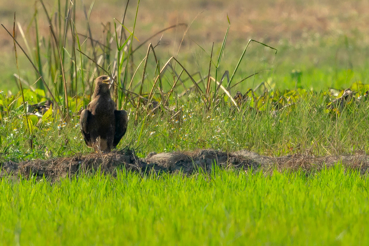 Well, I haven’t brought interesting pictures of birds of prey. Just a few photos of documentary value, which do not deserve attention. Nevertheless, my unusual encounter with the steppe eagle is worth mentioning and recording. For several reasons. Photographing this bird does not belong to easy or often achievements. Secondly, so far in this bird species’ gallery there have been only a few photos of a bird soaring against the sky, framed to a great extent. So, we have a beautiful bird and several documentary pictures. Finally, the third and most important aspect – the current encounter with this bird in Thailand. We were driving by a dam between rice fields. There was some not very tall tree growing on the right, and a pond with domestic ducks near it. At a distance of not more than 10 meters, seeing our car, a steppe eagle soared in front of our eyes. We had probably disturbed it in preying, but there was an atmosphere of euphoria in our car resulting from such an unexpected encounter with this rare bird. It was very hot and the bird flew a distance of about 100 meters and sat on the ground peacefully observing the surroundings. There was time for taking out a tripod, converter and taking a few documentary photos of this bird – this time, on the ground, for a change. The encounter was so amazing that even our guide, Tu, was excited. He took a picture of the screen of my camera and officially reported the fact that such a rare observation had taken place. Those few pictures taken as a keepsake of this encounter are worth uploading.