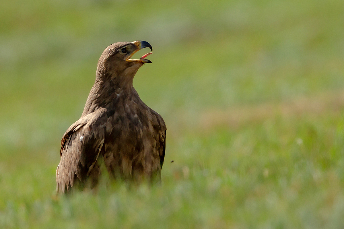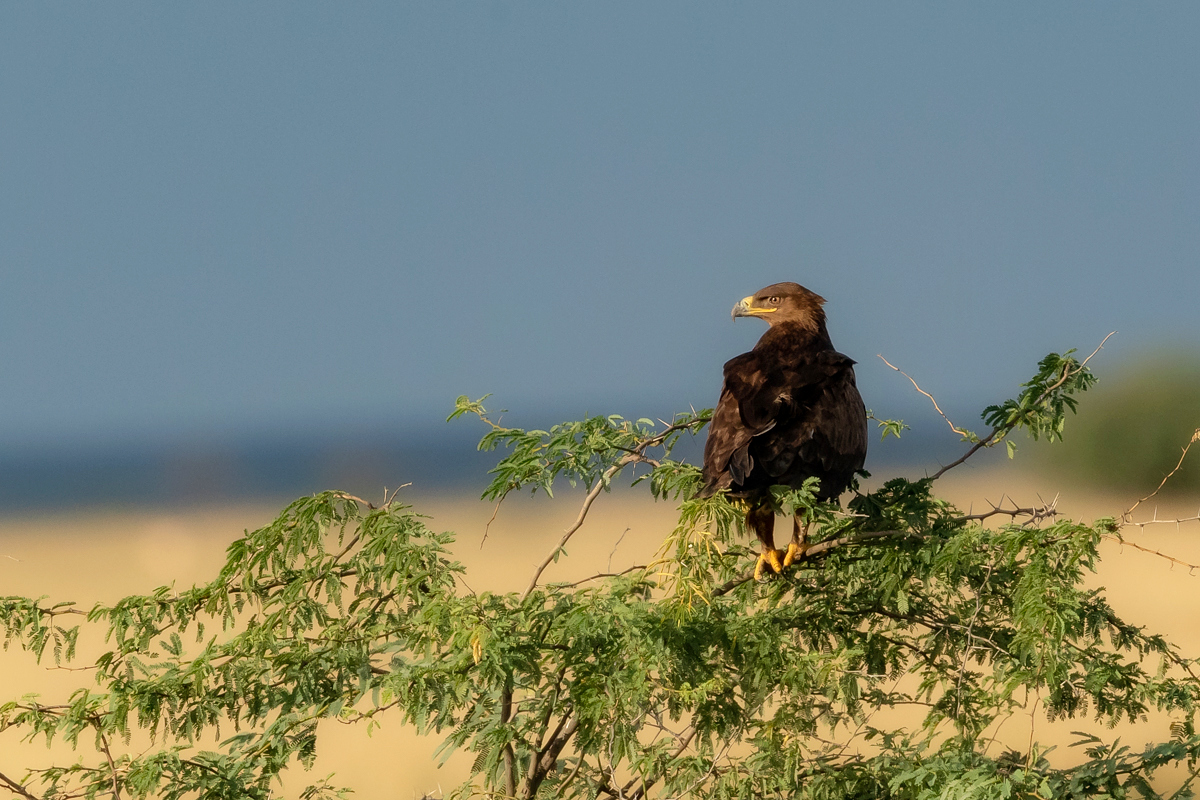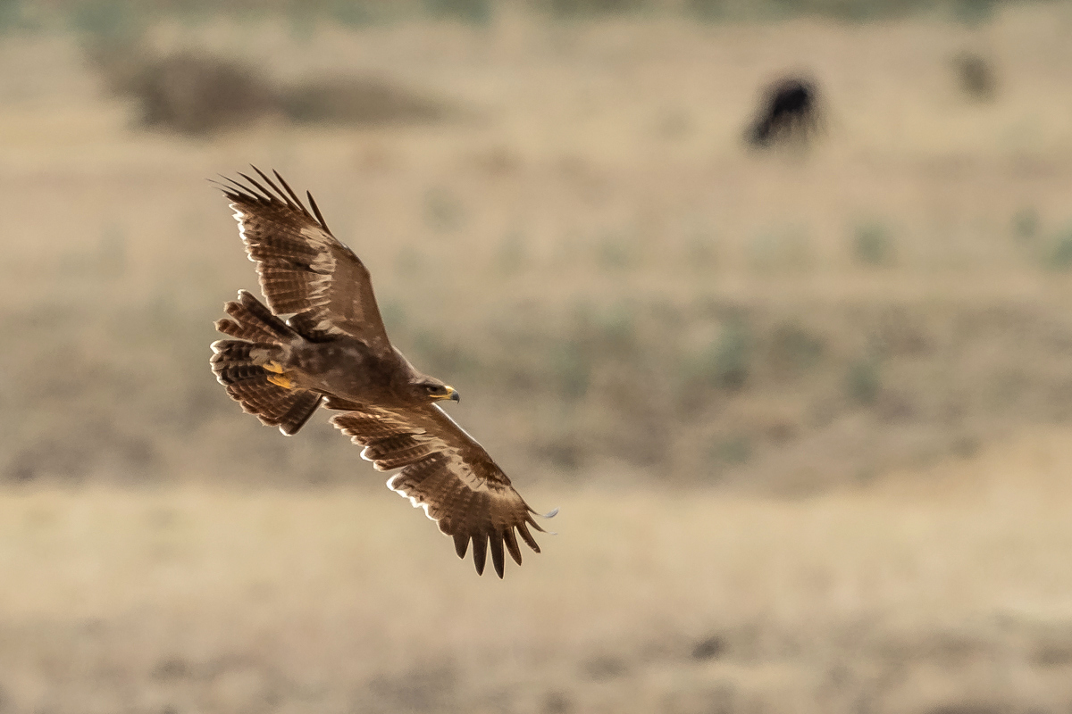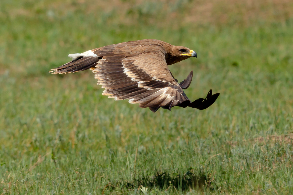 Well, I haven’t brought interesting pictures of birds of prey. Just a few photos of documentary value, which do not deserve attention. Nevertheless, my unusual encounter with the steppe eagle is worth mentioning and recording. For several reasons. Photographing this bird does not belong to easy or often achievements. Secondly, so far in this bird species’ gallery there have been only a few photos of a bird soaring against the sky, framed to a great extent. So, we have a beautiful bird and several documentary pictures. Finally, the third and most important aspect – the current encounter with this bird in Thailand. We were driving by a dam between rice fields. There was some not very tall tree growing on the right, and a pond with domestic ducks near it. At a distance of not more than 10 meters, seeing our car, a steppe eagle soared in front of our eyes. We had probably disturbed it in preying, but there was an atmosphere of euphoria in our car resulting from such an unexpected encounter with this rare bird. It was very hot and the bird flew a distance of about 100 meters and sat on the ground peacefully observing the surroundings. There was time for taking out a tripod, converter and taking a few documentary photos of this bird – this time, on the ground, for a change. The encounter was so amazing that even our guide, Tu, was excited. He took a picture of the screen of my camera and officially reported the fact that such a rare observation had taken place. Those few pictures taken as a keepsake of this encounter are worth uploading.