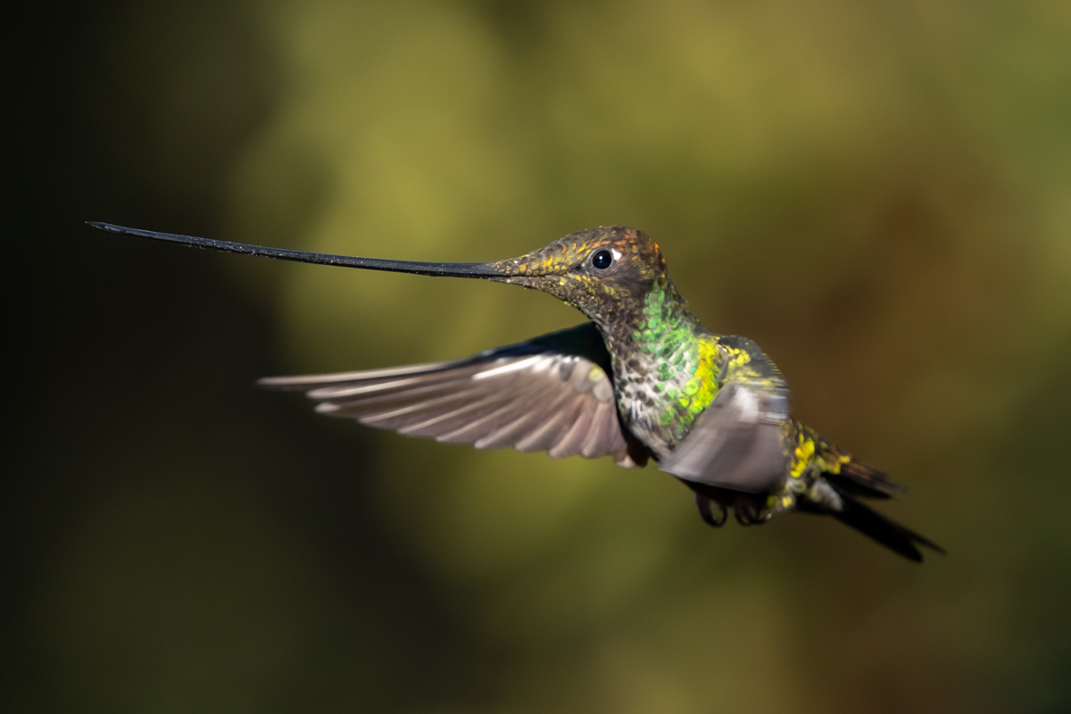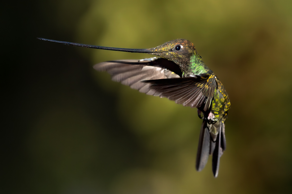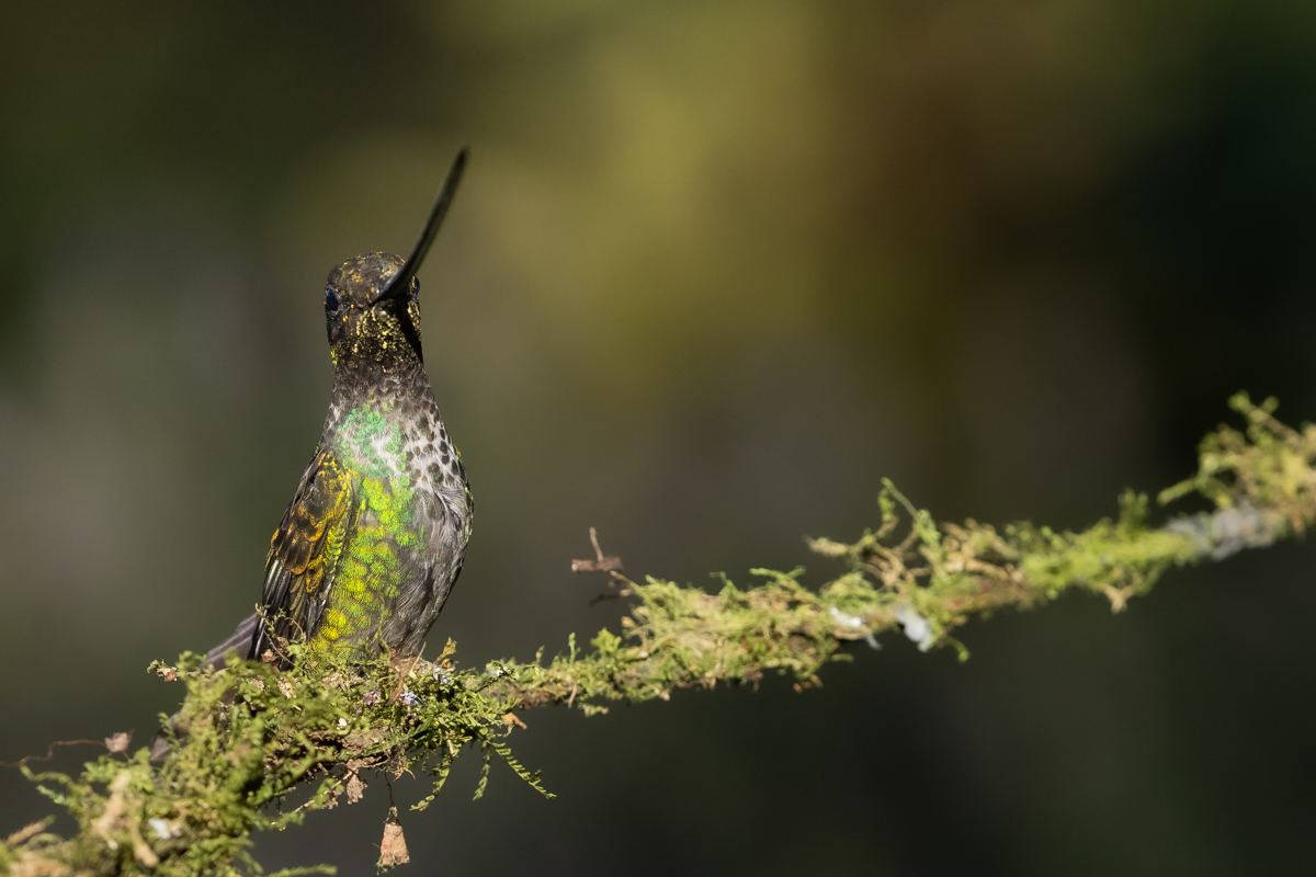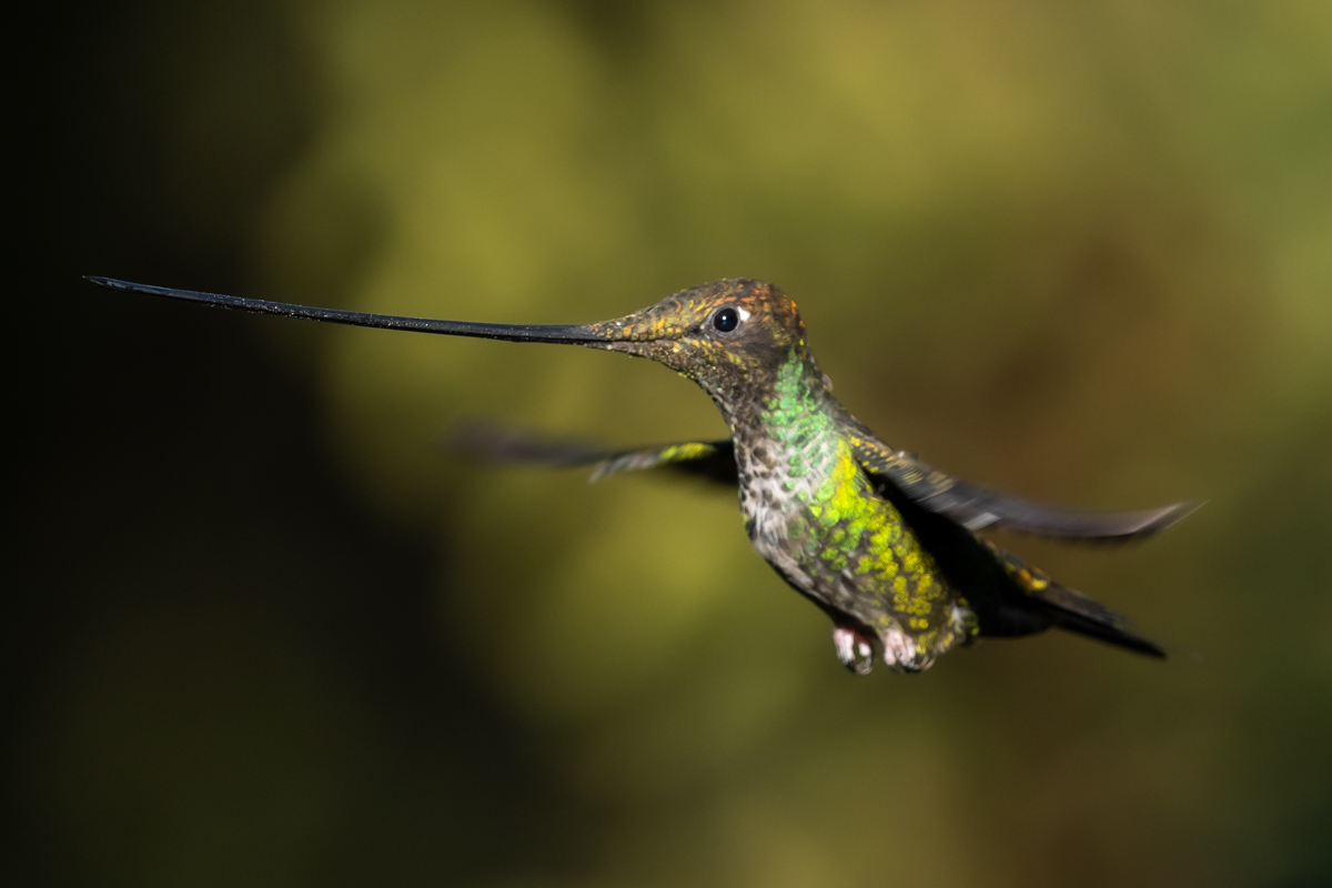 According to Miles McMullan's book 'The Guide to the Hummingbirds', there are between 330 and 360 species of hummingbirds in the world and as many as 129 species of them in Ecuador. Hummingbirds are found from Alaska in North America to the south of South America. So there are more than 30 per cent of hummingbird species there on two mighty continents, and in the small area of Ecuador in comparison. They are indeed almost everywhere in Ecuador, and at least during our entire stay, we gave them daily sightings. Roadside restaurants almost always have hummingbird drinkers. While waiting for a meal, we were never bored because there was always something going on at the feeders and photos were being taken. The contact with nature is so close that in one such place we took a break for lunch and while eating soup not far from the hummingbird feeders, one of the hummingbirds sat on my forearm and watched what I was doing. An amazing encounter, an amazing contact with nature.  In yet another, I was standing in front of a hummingbird drinker, almost motionless trying to get a dynamic picture of a hummingbird, while another wanted to check the cleanliness of my ear. I can assure you that it is an unpleasant feeling to hear the swish of its feathers an inch or two from your ear, and to be aware that it will slip its long beak into your ear. You have to refrain from the reflex that accompanies a mosquito or fly in such a situation, and so wave your hand vigorously. This could be fatal to the hummingbird. Just move your head vigorously and the bird will fly away. By holding a flower in hand in such places, you can count on the hummingbird to sit on it and check for the sometimes tasty nectar. We shot such short films and sent them to Poland "with greetings" from Ecuador . Could there be a more beautiful 'postcard' with holiday greetings? Despite the close contact with hummingbirds, photography is not easy. I am not thinking of photos of hummingbirds drinking from or sitting on plastic containers. I'm thinking of dynamic photos in flight of these amazing sky acrobats. The photography itself is worthwhile if it is preceded by a brief observation of the species there. It often happens that one of them is a dominant species, very territorial and behaves in a characteristic, predictable way. These species are always easier to photograph. They sometimes fly up to a few centimetres from the drinker, hover in the air for a second, two or three, make sure it is safe, then start their sweet meal. This moment is a situation in which dynamic photographs can be created. Likewise with the flowers situated near the existing drinkers. The birds hover near them and sip the sweet water artificially left there. These are the predictable species. There are, however, some that suddenly fly out of the bushes straight to the drinkers, feed and as quickly as they appeared, they disappear. With these, humans hardly stand a chance. Just like the aerial quarrels, the hummingbirds skirmish. They are so fast, the movement of two individuals so synchronous, that one can only stop to observe. Photographing such a quarrel is pure coincidence. In the end, 41 species of hummingbirds were photographed during the entire trip to Ecuador. All of them have the present text posted, and only the Giant hummingbird and the Ecuadorian Hillstar, have the text expanded with individual information. I have marked this as a double T-"TT".
