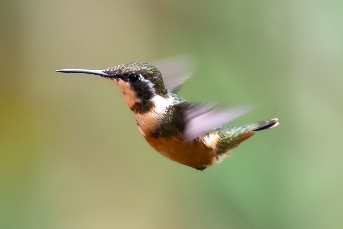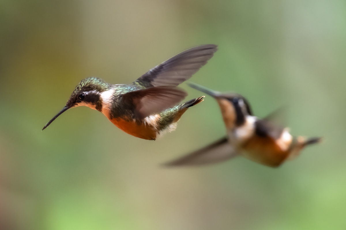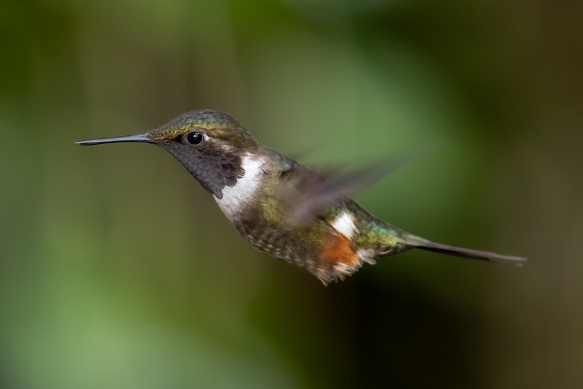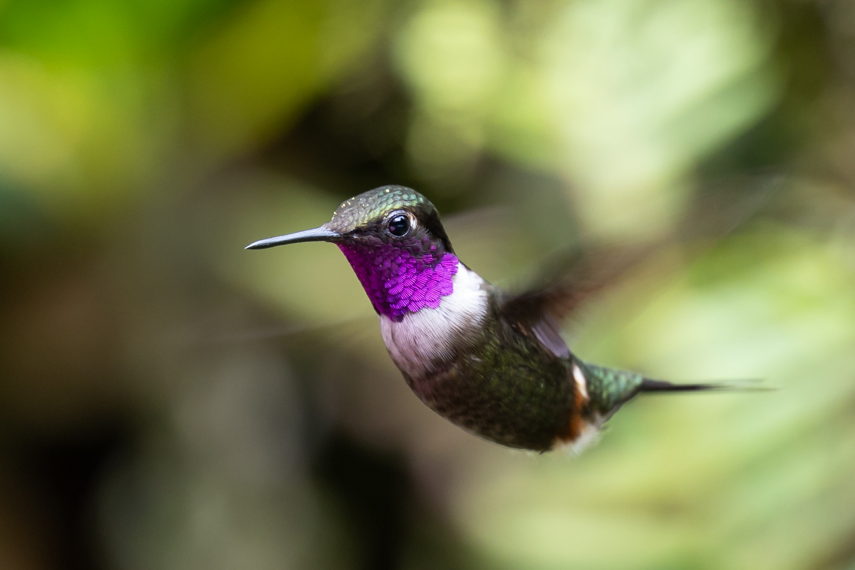 According to Miles McMullan's book 'The Guide to the Hummingbirds', there are between 330 and 360 species of hummingbirds in the world and as many as 129 species of them in Ecuador. Hummingbirds are found from Alaska in North America to the south of South America. So there are more than 30 per cent of hummingbird species there on two mighty continents, and in the small area of Ecuador in comparison. They are indeed almost everywhere in Ecuador, and at least during our entire stay, we gave them daily sightings. Roadside restaurants almost always have hummingbird drinkers. While waiting for a meal, we were never bored because there was always something going on at the feeders and photos were being taken. The contact with nature is so close that in one such place we took a break for lunch and while eating soup not far from the hummingbird feeders, one of the hummingbirds sat on my forearm and watched what I was doing. An amazing encounter, an amazing contact with nature.  In yet another, I was standing in front of a hummingbird drinker, almost motionless trying to get a dynamic picture of a hummingbird, while another wanted to check the cleanliness of my ear. I can assure you that it is an unpleasant feeling to hear the swish of its feathers an inch or two from your ear, and to be aware that it will slip its long beak into your ear. You have to refrain from the reflex that accompanies a mosquito or fly in such a situation, and so wave your hand vigorously. This could be fatal to the hummingbird. Just move your head vigorously and the bird will fly away. By holding a flower in hand in such places, you can count on the hummingbird to sit on it and check for the sometimes tasty nectar. We shot such short films and sent them to Poland "with greetings" from Ecuador . Could there be a more beautiful 'postcard' with holiday greetings? Despite the close contact with hummingbirds, photography is not easy. I am not thinking of photos of hummingbirds drinking from or sitting on plastic containers. I'm thinking of dynamic photos in flight of these amazing sky acrobats. The photography itself is worthwhile if it is preceded by a brief observation of the species there. It often happens that one of them is a dominant species, very territorial and behaves in a characteristic, predictable way. These species are always easier to photograph. They sometimes fly up to a few centimetres from the drinker, hover in the air for a second, two or three, make sure it is safe, then start their sweet meal. This moment is a situation in which dynamic photographs can be created. Likewise with the flowers situated near the existing drinkers. The birds hover near them and sip the sweet water artificially left there. These are the predictable species. There are, however, some that suddenly fly out of the bushes straight to the drinkers, feed and as quickly as they appeared, they disappear. With these, humans hardly stand a chance. Just like the aerial quarrels, the hummingbirds skirmish. They are so fast, the movement of two individuals so synchronous, that one can only stop to observe. Photographing such a quarrel is pure coincidence. In the end, 41 species of hummingbirds were photographed during the entire trip to Ecuador. All of them have the present text posted, and only the Giant hummingbird and the Ecuadorian Hillstar, have the text expanded with individual information. I have marked this as a double T-"TT".