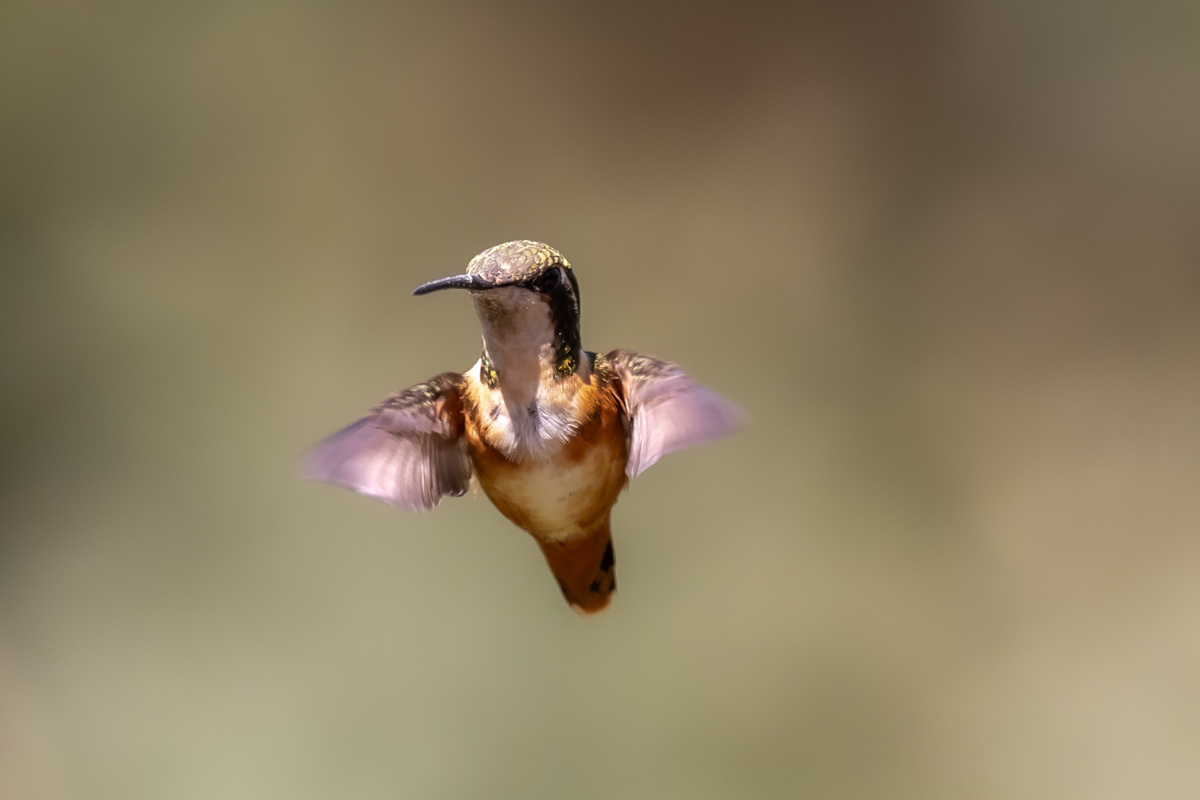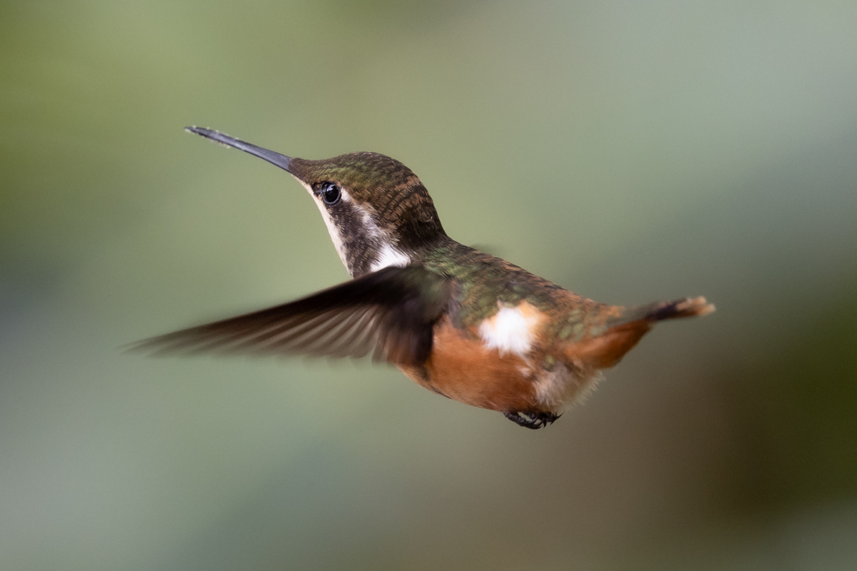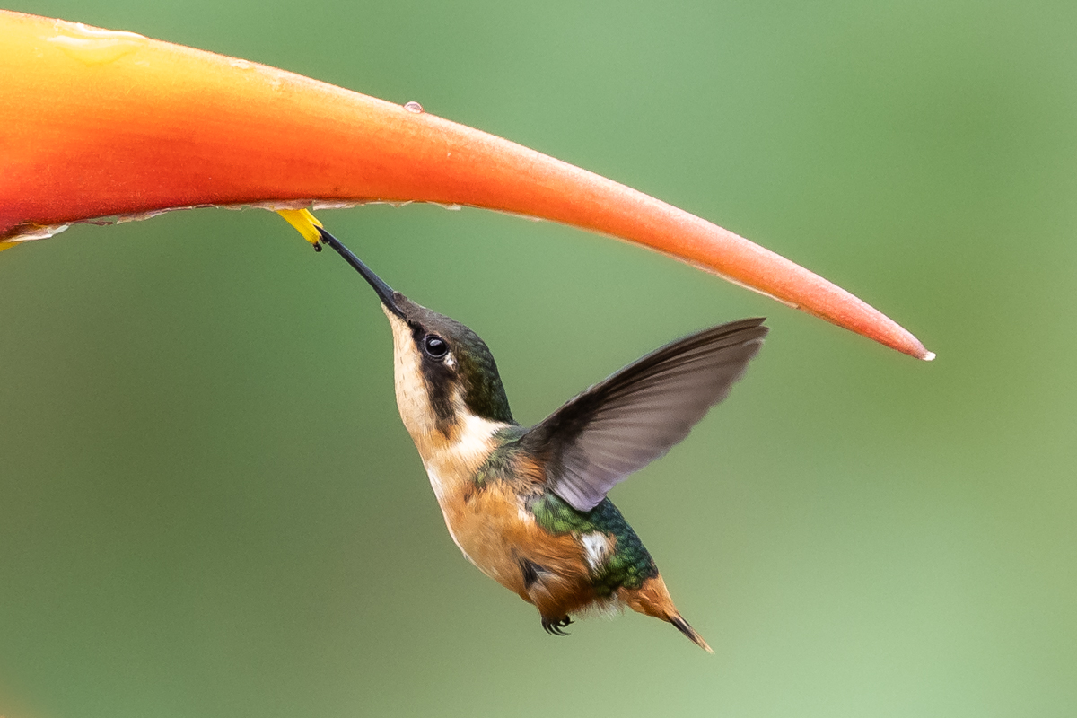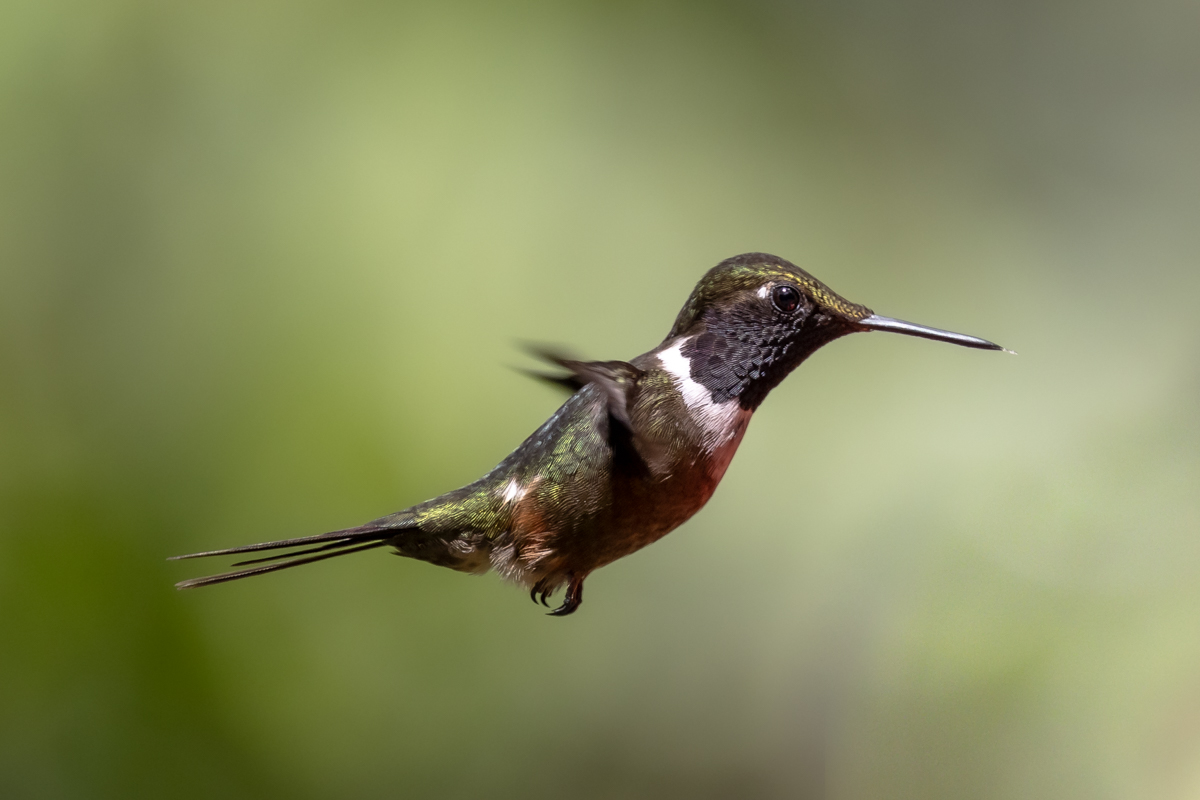According to Miles McMullan's book 'The Guide to the Hummingbirds', there are between 330 and 360 species of hummingbirds in the world and as many as 129 species of them in Ecuador. Hummingbirds are found from Alaska in North America to the south of South America. So there are more than 30 per cent of hummingbird species there on two mighty continents, and in the small area of Ecuador in comparison. They are indeed almost everywhere in Ecuador, and at least during our entire stay, we gave them daily sightings. Roadside restaurants almost always have hummingbird drinkers. While waiting for a meal, we were never bored because there was always something going on at the feeders and photos were being taken. The contact with nature is so close that in one such place we took a break for lunch and while eating soup not far from the hummingbird feeders, one of the hummingbirds sat on my forearm and watched what I was doing. An amazing encounter, an amazing contact with nature.  In yet another, I was standing in front of a hummingbird drinker, almost motionless trying to get a dynamic picture of a hummingbird, while another wanted to check the cleanliness of my ear. I can assure you that it is an unpleasant feeling to hear the swish of its feathers an inch or two from your ear, and to be aware that it will slip its long beak into your ear. You have to refrain from the reflex that accompanies a mosquito or fly in such a situation, and so wave your hand vigorously. This could be fatal to the hummingbird. Just move your head vigorously and the bird will fly away. By holding a flower in hand in such places, you can count on the hummingbird to sit on it and check for the sometimes tasty nectar. We shot such short films and sent them to Poland "with greetings" from Ecuador . Could there be a more beautiful 'postcard' with holiday greetings? Despite the close contact with hummingbirds, photography is not easy. I am not thinking of photos of hummingbirds drinking from or sitting on plastic containers. I'm thinking of dynamic photos in flight of these amazing sky acrobats. The photography itself is worthwhile if it is preceded by a brief observation of the species there. It often happens that one of them is a dominant species, very territorial and behaves in a characteristic, predictable way. These species are always easier to photograph. They sometimes fly up to a few centimetres from the drinker, hover in the air for a second, two or three, make sure it is safe, then start their sweet meal. This moment is a situation in which dynamic photographs can be created. Likewise with the flowers situated near the existing drinkers. The birds hover near them and sip the sweet water artificially left there. These are the predictable species. There are, however, some that suddenly fly out of the bushes straight to the drinkers, feed and as quickly as they appeared, they disappear. With these, humans hardly stand a chance. Just like the aerial quarrels, the hummingbirds skirmish. They are so fast, the movement of two individuals so synchronous, that one can only stop to observe. Photographing such a quarrel is pure coincidence. In the end, 41 species of hummingbirds were photographed during the entire trip to Ecuador. All of them have the present text posted, and only the Giant hummingbird and the Ecuadorian Hillstar, have the text expanded with individual information. I have marked this as a double T-"TT".
