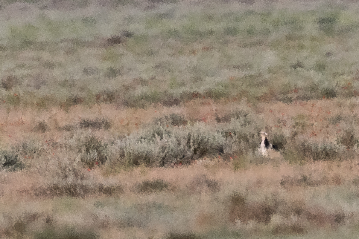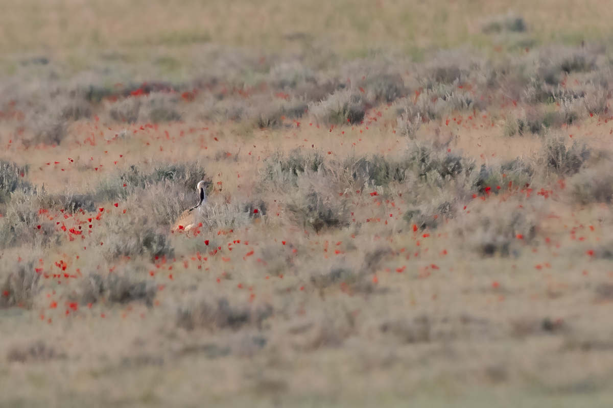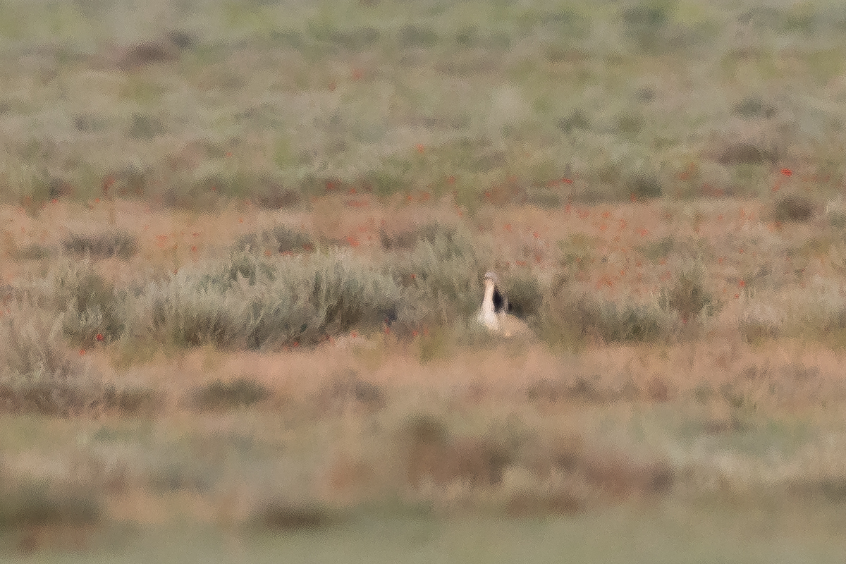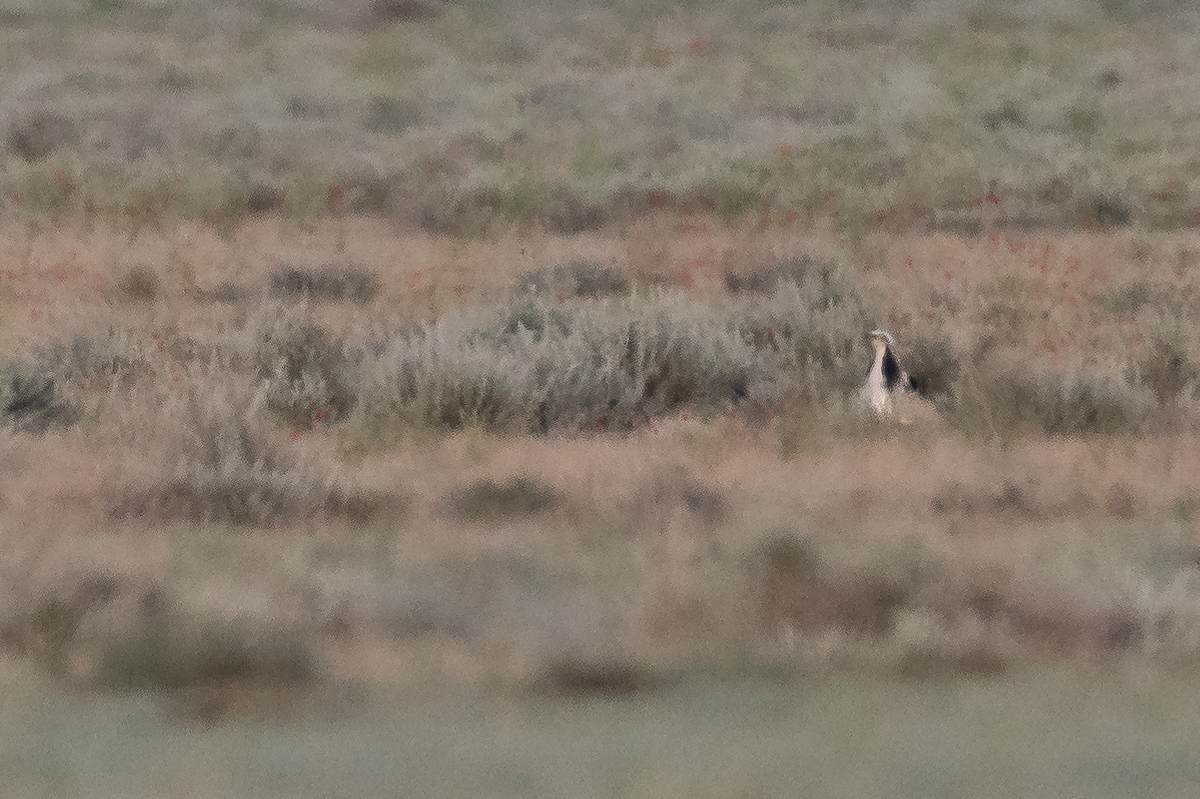 This is undoubtedly the worst gallery of any species among nearly 2,000 bird galleries on my website. You have to trust the author a bit to believe that it is indeed this bird in the photos, rather than another – a bit of irony about my photographic failure to capture the Arabian bustard. These are not really photos, but more like painted pictures. Usually, I don’t create galleries for species photographed in less than documentary quality during my trips, but I made an exception for the Macqueen's Bustard. Why? Because this species was one of the reasons I went to Kazakhstan. I really wanted to see the Macqueen's Bustard and, of course, take pictures. This species is part of Poland’s fauna and belongs to the bustard family, which I have favored for years. At sunrise, I saw the Macqueen's Bustard courtship dance through the spotting scope. Amazing, beautiful! It’s unforgettable. Then I tried to get closer to the birds, but unfortunately without success. The birds were shy and considered a few hundred meters a safe distance. To illustrate how far the birds were, I included one photo (currently the last in the gallery) without cropping, taken with a 600 mm lens, a 2x converter, and a full-frame camera, giving a focal length of 1200 mm! The birds moved among small shrubs like in a labyrinth, appearing and disappearing constantly. It’s unlikely I will have another chance to see these birds, so I created the gallery. In the past, it was similar with the galleries of the Eurasian Thick-knee, Greater Spotted Eagle, Pallas's gull, and others. Who knows? Maybe the content of this gallery will unexpectedly improve, but after what I saw in Kazakhstan – how shy and elusive these birds are and considering their range – it probably won’t happen soon.