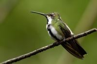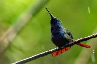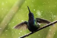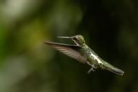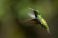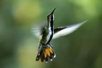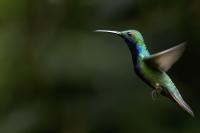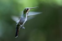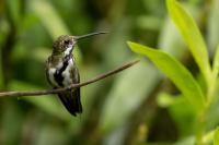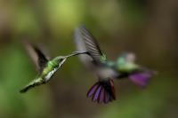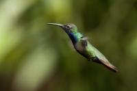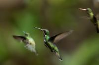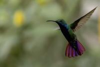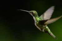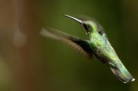 Being in Iguazú, even if you are not particularly interested in bird beauties, you should visit a place, which is unique on a global scale. Every taxi driver knows this place in  Iguazú and for a few dollars will take you to an amazing hummingbird garden. An admission ticket costs really little. The place itself is very plain. For many years, on a small area of a backgarden, its owner has been hanging water fountains for hummingbirds around. The place is so much in hummingbirds’ taste that you can encounter dozens of them in one moment,  even though they are still wild birds, having no limits and free. The birds are so preoccupied with themselves that every now and then they bump into people admiring them. At first, I’m delighted to see a dozen or a few dozen hummingbirds over a small area and I’m almost sure that I’ll be able to easily take many satisfactory photos. I couldn’t be more wrong. The first problem is inadequate lighting conditions. ISO 1600-3200 and the achieved times 1/250, 1/100s are a nightmare for the photographer. They are such dynamic birds. You would like to use 1/8000, with a certain depth, but you are just unable to use the appropriate settings. However it’s not the end of my troubles. Sitting and admiring this piece of hummingbird paradise is one thing, but capturing it is a totally different story. The first few dozen attempts to take a picture ended in a complete failure. Birds freeze for a second and it is the only moment when you can photograph them in a typical hummingbird-like manner. In this fracture of a second you have to switch from birdwatching without a camera to taking your camera, directing it to the bird, pressing the shutter so that the focus can sharpen the frame and finally taking a series of pictures. Everything happens in a fracture of a second. I assure you, it’s almost impossible. After half an hour in such a place, despite good equipment, I have no photos. To make matters worse, it starts to rain and the lighting conditions worsen to an even greater extent. Happily it does not last long and I’ll have some more opportunities to take pictures on this day. I get back to the hotel. I check what I have on the cards, but I’m not euphoric. Admittedly, there are some clear images of several hummingbird species, but my assembly lacks photos with ultra-short times and with a possibility to use some focal depth. Even a 300/2,8 lens seems to be too dark. I go back there the next day, when the lighting conditions are a notch better. In proportion to the light there are also more people. Yesterday I was there alone, today there are a few bird admirers. A change of the photography technique brings better results. It is recommended to pick the place most frequently visited by birds (steady track used by birds to approach a water fountain), set everything in the camera manually (including focus) and take photos in whole series, as soon as birds appear in the frame. The majority of pictures, 60-70%, can be deleted, but there are also a few photos which are worth saving. After several hours of observation you can learn the birds’ behavior. The way they fly into a place and fly away within short distances is repeatable. Therefore you can always take a few pictures. All in all I managed to photograph 7 hummingbird species. Unfortunately some of these species appeared only 3-4 times and I was only able to take 1-2 series of photos. Thus photo galleries of representatives of the hummingbird family were created, each of the galleries having a different content.  I uploaded the same sound to each gallery – this time the sound of birds flying and a buzz which is specific for this amazing garden. The birds were so close and in such quantities that I decided to record the sound of their wings flutter. It is quite an unusual bird sound, but the gallery of these unusual birds deserves a unique sound recording. This text is common for all captured hummingbird species. A hummingbird’s weight reaches a few grams, with a wingspan of a few centimeters. They are very tiny, but their dynamic flight, freezing in the air have no rivals. Well, maybe among dragonflies, but those have two pairs of wings. In order to be able to fly so deftly you have to have an amazing heart. In this little, few-centimeter body there is a heart which can beat over a thousand times a minute. They are unusual birds and so delicate. An intensifying rain was a hazard to them to such an extent that they all hid for a moment, and I stayed alone on this little bird arena.  I invite you to encounter those little birds, which in fact should be moved from bird galleries to the macro gallery.
