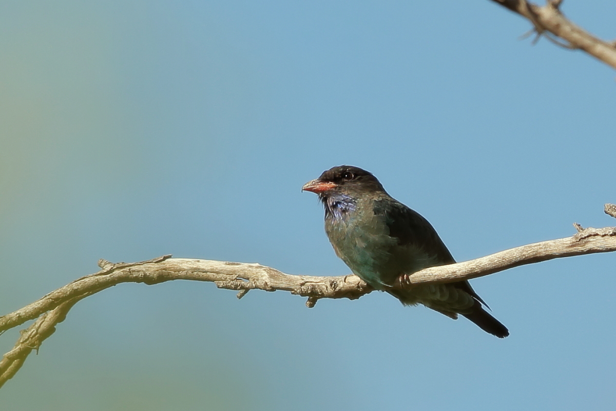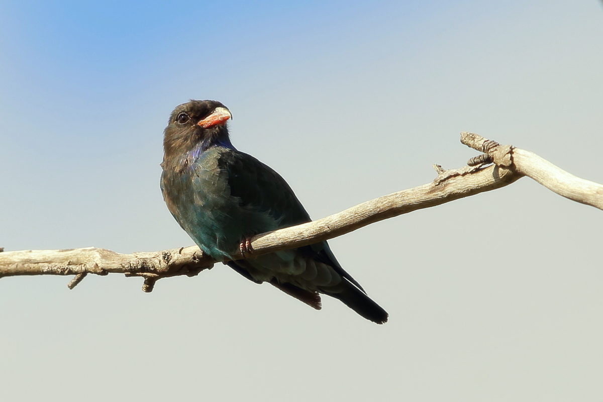 So far I have not been lucky about dollarbirds.  An open air session in Spain was interesting due to a quarrel between the Lesser Kestrel and the European Roller about a nest box and dynamic images could be taken, but a concrete pole and sky in the background are the least desired elements of the landscape that you want to see in nature photography. Well, here in Australia it was not much better. The Oriental Dolarbird could be seen several times, but always in the same circumstances. Pictures taken straight into the sun, with high-contrast make it difficult to show the full charm of coloration of the bird. It is a bird of the roller family named so not without reason – blue-green-grey coloration with a red beak produce a beautiful result. Showing the charm of the bird at sunrise with vegetation in the background would bring a stunning effect. Too bad I had no more time left to try again. The Dollarbird weight is about 200 grams, with a wingspan of about a half meter.