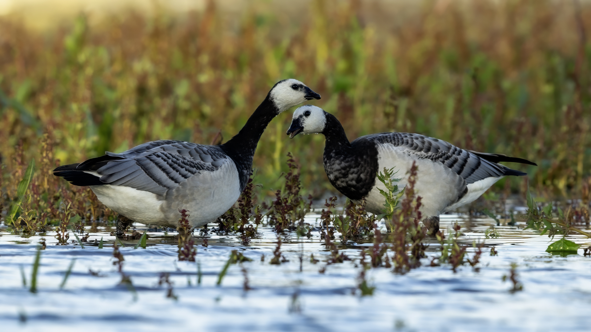 Takie gatunki, jak bernikla białolica można spotkać w naszym kraju wyłącznie na przelotach i to bardzo nielicznie. Październik 2013 roku można powiedzieć, że był dla mnie miesiącem bernikli. Sfotografowałem trzy gatunki tego ptaka, z których dwa są rzadkie i trudne do sfotografowania. O sfotografowaniu bernikli obrożnej zadecydował przypadek i determinacja. Tak, o bernikli białolicej zadecydowała podpowiedź o miejscu ich występowania. Oczywiście nikt gwarancji nie daje, że będą tam występowały, bo to dzikie i wolne ptaki, ale jak się nie próbuje, to na pewno się nie uda. I proszę pierwsze podejście i bernikle bez trudu dały się sfotografować. Rankiem drugiego dnia już ich nie było. Czy odleciały na zimowisko, czy to chwilowa ich nieobecność już nie wiem. Szkoda, że ich nieodzownym kompanem była gęś zbożowa, która zakłóciła (weszła w kadr) w najbardziej dynamicznym ujęciu spośród zdjęć wykonanych na tym plenerze. Normalnie mieć gęś zbożową na tak niedużym dystansie, z ciepłą barwą zachodzącego słońca, radość byłaby wielka, ale nie przy fotografowaniu takich „wisienek na torcie” jak bernikle białolice. No cóż to nie market, tu scenariusz pisze natura. Gęsi, niestety w milczeniu, nie wydając odgłosu pasły się spokojnie. Tak, więc znów nie ma mojego nagrania odgłosu tego ptaka. Bernikla białolica jest wagowo i pod względem rozpiętości skrzydeł bardzo podobna do bernikli obrożnej (waga około dwóch kilogramów, przy rozpiętości skrzydeł ok 1,2 metra). W zachowaniu także bardzo podobne, choć nie widziałem w locie bernikli białolicej. Czas pokaże, czy będzie jeszcze sposobność poszerzenia galerii tego ptaka w innej scenerii.
