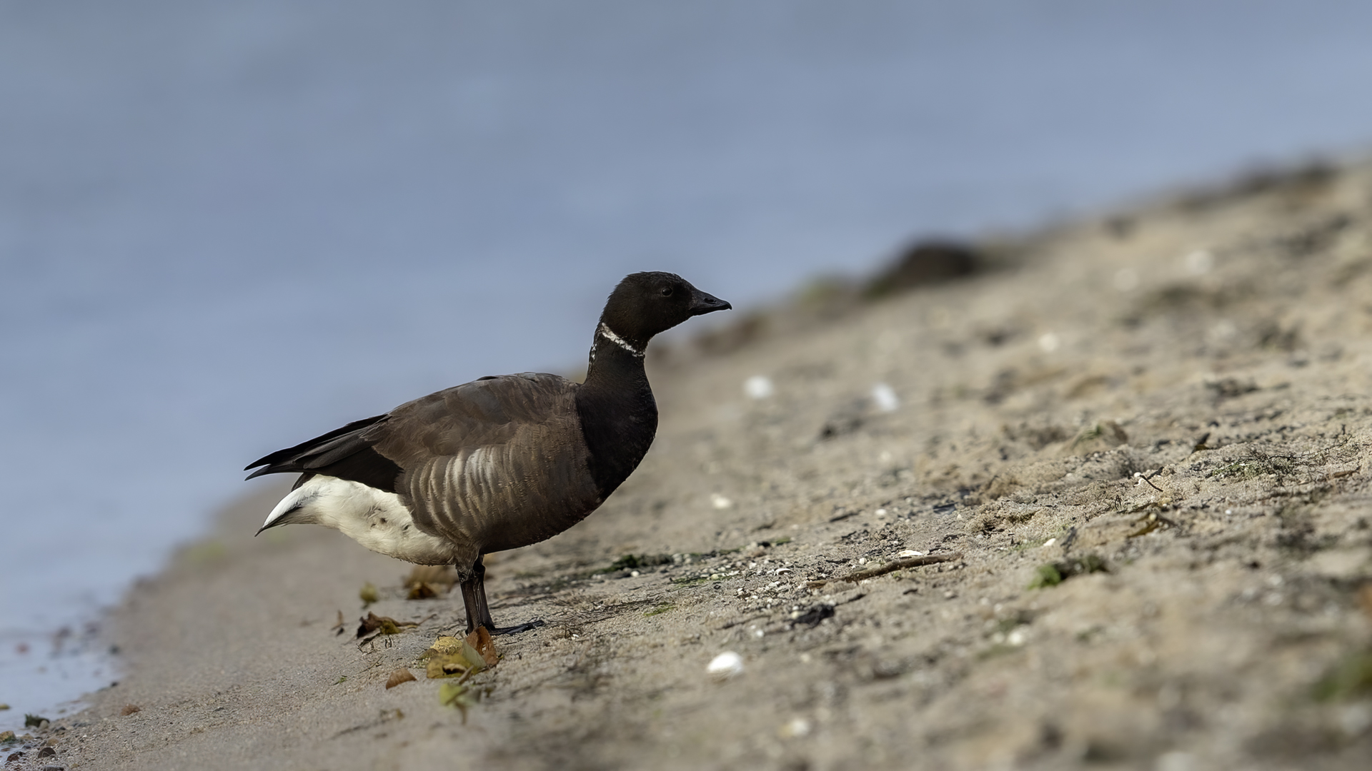 Mój wyjazd październikowy nad morze miał zakończyć się doskonaleniem galerii biegusów, a tym razem zaowocował sfotografowaniem dwóch nowych gatunków: bernikli obrożnej i śnieguły. Spokojnie podchodząc do skupiska ptaków z dala widać było jednego odmieńca wśród żerujących na plaży mew. Z daleka dość spora sylwetka w porównaniu z mewami, odmienne ubarwienie, jednak nie pozwalała ocenić co to za gatunek. Powoli zmniejszam odległość do kilkudziesięciu metrów i rzut oka przez wizjer aparatu i wszystko jasne. To widywany w Polsce, wyłącznie na przelotach, gatunek arktycznej gęsi, jaką jest bernikla obrożna. Rozpiętość skrzydeł przekracza jeden metr, przy masie ciała około 2 kilogramów. Tak, więc w porównaniu z jej inwazyjną w Polsce krewniaczką, berniklą kanadyjską, obrożna jest trzykrotnie od niej lżejsza i posiada połowę rozpiętości skrzydeł bernikli kanadyjskiej. Przypomina bardziej jej miniaturkę. Leżąc na plaży, doskonale widoczny przez berniklę, chyba miałem szczęście, że przy brzegu kilka metrów ode mnie występowała jakaś podwodna, przybrzeżna roślinność, za którą bernikla przepadała. Powoli podchodziła coraz bliżej na swoje żerowisko. Niestety kiepskie już oświetlenie nie dawało szansy na zrobienie satysfakcjonujących zdjęć. No cóż „startowe” zdjęcia galerii są, może jutrzejszy poranek przyniesie lepsze zdjęcia w porannym świetle, ale czy bernikla jeszcze tam będzie? Zobaczymy…