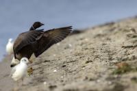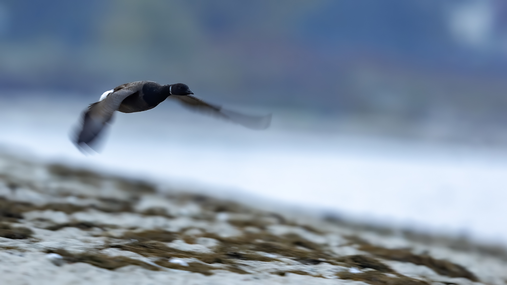 Przyszedłem jeszcze o zmroku w to samo miejsce. Ciemno wszędzie, głucho wszędzie, czas na prosty posiłek (bułki, woda) i przygotowanie sprzętu do nagrywania dźwięków. Nieco przed wschodem słońca pojawiają się pierwsze mewy i kormorany. Niestety nieco za daleko, nie mówiąc już o świetle. Ale co to, bernikla przyleciała w miejsce wczorajszego żerowiska. Ba, nawet od razu zmniejszyła odległość do mnie, no i to wschodzące słońce dało szansę na wykonanie jeszcze lepszych zdjęć. Niestety raz po raz zasłaniane było przez chmury pogarszając radykalnie warunki fotografowania i tym samym jakość zdjęć. Po wykonaniu pierwszej serii zdjęć chciałoby się wykonać bardziej dynamiczne niż tylko spokojnie żerującego ptaka. Apetyt rośnie w miarę jedzenia, a co na to bernikla? Najpierw majestatycznie rozprostowała skrzydła, a potem wykonała kilka kółek wokół mnie, kończąc na lądowaniu w odległości kilkunastu metrów. Nie ma co, pełna współpraca, chyba mnie polubiła. Szkoda, że warunki oświetleniowe były jeszcze nie najlepsze i w kadr nieraz wchodziła mewa. Powstaje ciekawy materiał na galerię. Bernikla zaczęła żerować dalej i obserwowałem ją przez wizjer aparatu, gdy nagle poderwała się do lotu, zresztą jak pozostałe ptaki. Pomyślałem sobie, że jakiś spacerowicz zakończył mi plener. Rozglądam się wokół, ale nie widzę nikogo. To, co było przyczyną ucieczki ptaków siedziało znacznie dalej, jakieś 150 metrów ode mnie. Nie był to człowiek, a największy polski drapieżnik-bielik. Usiadł dostojnie, już samotnie nad brzegiem morza. Kadr byłby przepiękny, gdyby nie odległość i kiepskie światło. Wykonałem kilka zdjęć, ale mają wartość dokumentacyjną. Wyglądał naprawdę niesamowicie budząc respekt w okolicy na tle morza. Zaabsorbowany jego przybyciem nie zauważyłem, że tuż obok mnie w piasku żeruje śnieguła. Kilka zdjęć śnieguły, ale potem rzut oka na miejsce w którym wylądował przed chwilą bielik. Niestety tak samo jak się pojawił nagle, nie wiadomo skąd, tak szybko zniknął. Na szczęście doskonale współpracująca bernikla pojawiła się za chwilę lądując w swoim ulubionym miejscu i dało się wykonać jeszcze kilka dynamicznych zdjęć. Dwie godziny przed zachodem słońca i dwie po wschodzie słońca, a ile wrażeń i emocji, jaki relaks. Po prostu fotografia przyrodnicza…