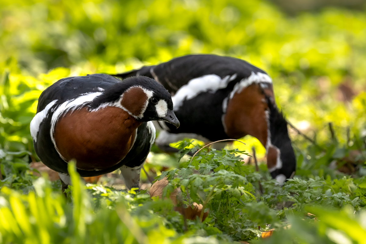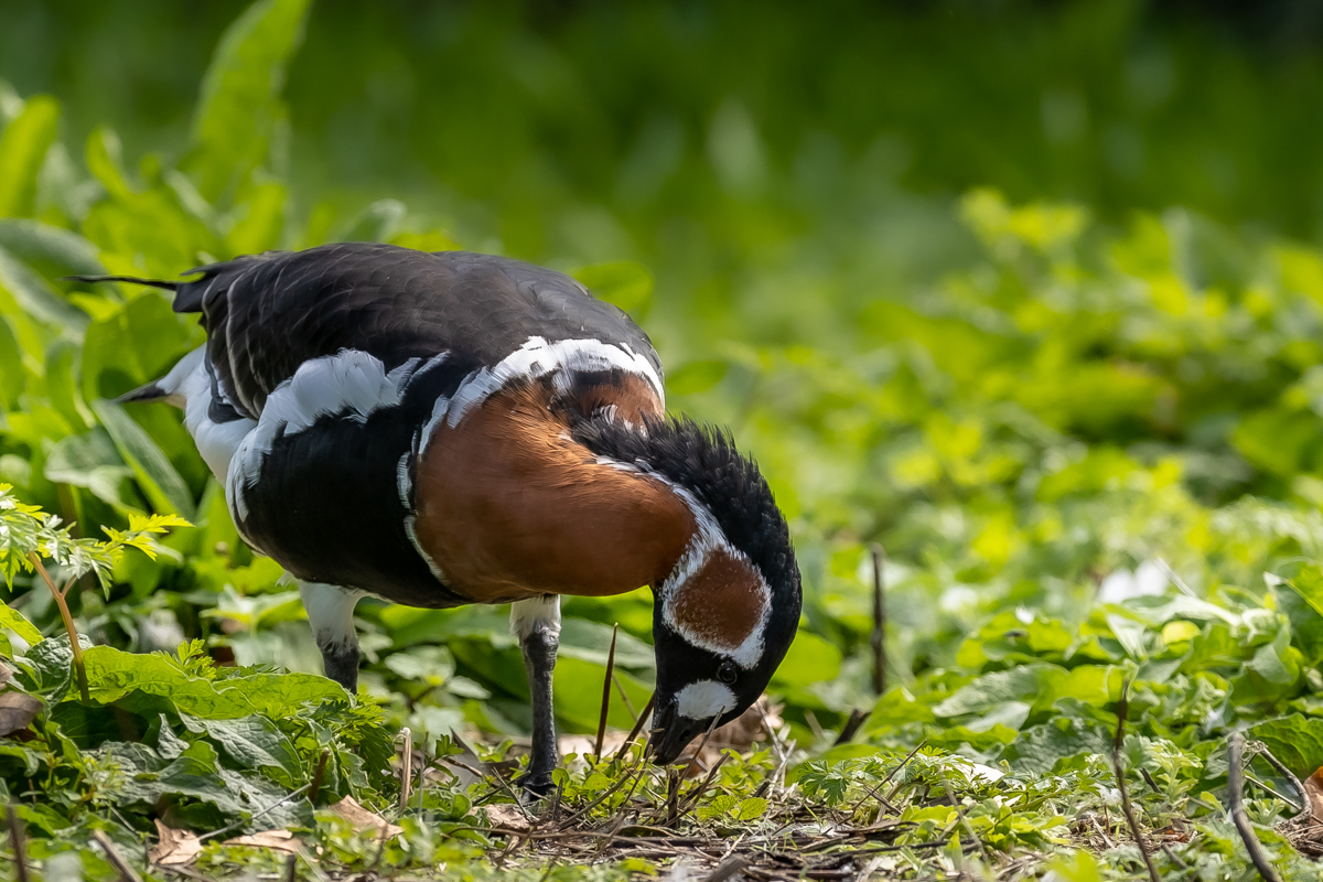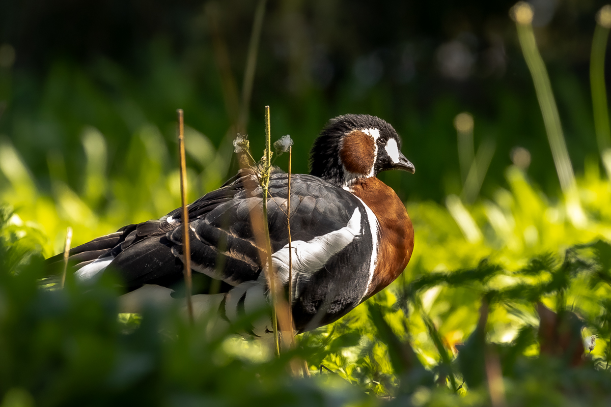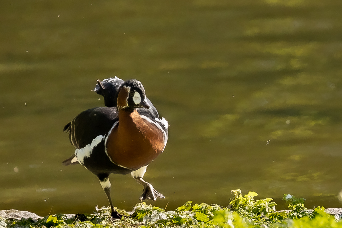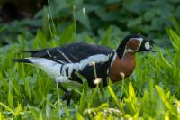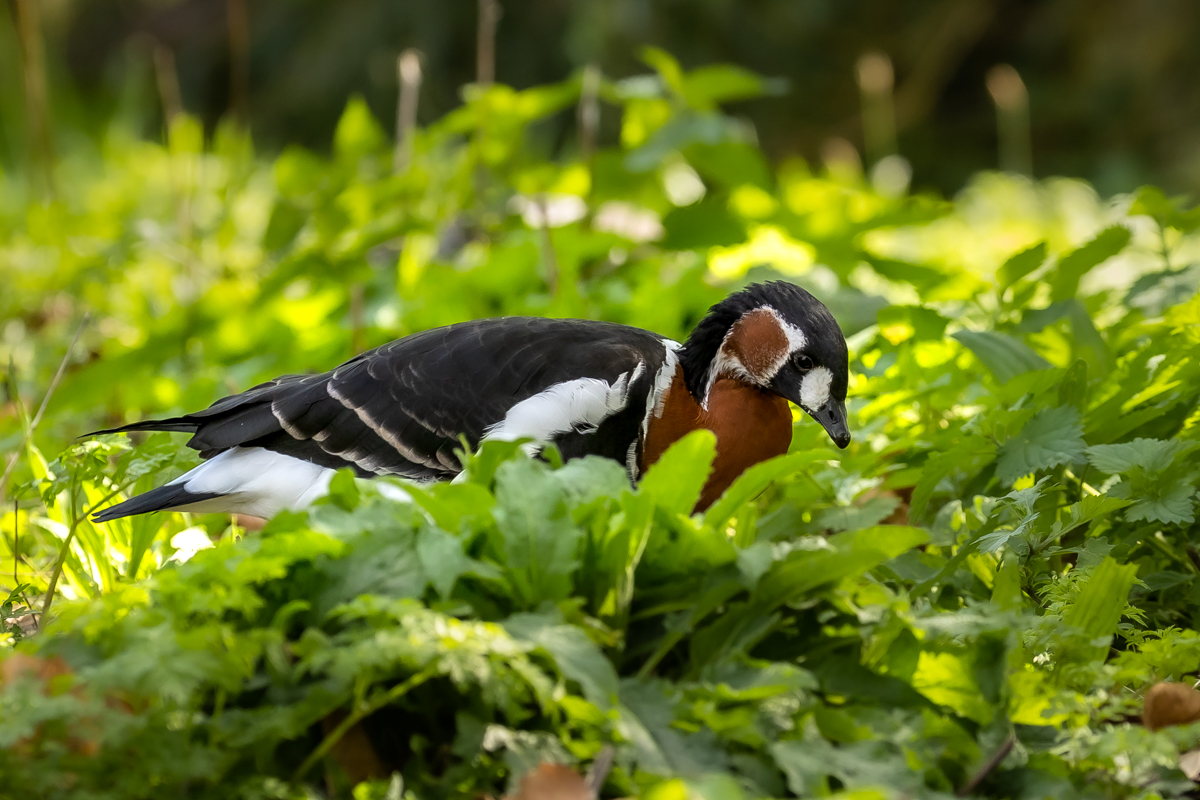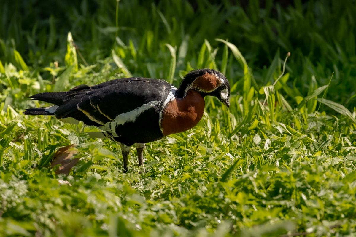 Chyba najpiękniejsza z bernikli dotychczas fotografowanych przeze mnie. Niestety mimo zastosowania konwertera 2x i 600-milimetrowego obiektywu odległość była tak duża, że widać mocne kadrowanie zdjęć. Ale to ważny dla mnie gatunek z dwóch powodów. Pierwszy to taki, że uwiecznienie tego ptaka jest dopełnieniem sfotografowania przedstawicieli rodziny bernikli sporadycznie występujących w Polsce. Druga, że to 400-setny gatunek ptaka zamieszczony na mojej stronie. Bernikla rdzawoszyja jest dość rzadko spotykana w Polsce, bo jej naturalnym środowiskiem jest zachodnia Syberia. Zimują na południu Azji, nad morzem Kaspijskim i w Zatoce Perskiej. Mam nadzieję, że będzie jeszcze okazja i uda się wykonać ciekawsze zdjęcia tej najmniejszej, ale jakże ciekawie ubarwionej bernikli. Tym razem nie było łatwo, bo trudność polegała na dostrzeżeniu jednej, jedynej bernikli, spośród setek, jak nie tysiąca ptaków. Kaczki krzyżówki, gęsi białoczelne, gęgawy, gęsi zbożowe, czajki, czaple siwe i białe, bekasy, biegusy, łabędzie krzykliwe, czarnodziobe- w jednym miejscu to przepiękny, ale rzadki widok w Polsce. Niesamowite, piękne, ciekawe miejsce, do którego trzeba będzie wrócić na wiosnę.  Bernikla rdzawoszyja osiąga wagę do 1,5 kilograma, a rozpiętość skrzydeł to około 1,2 metra.