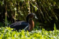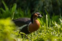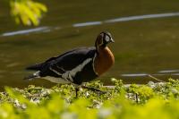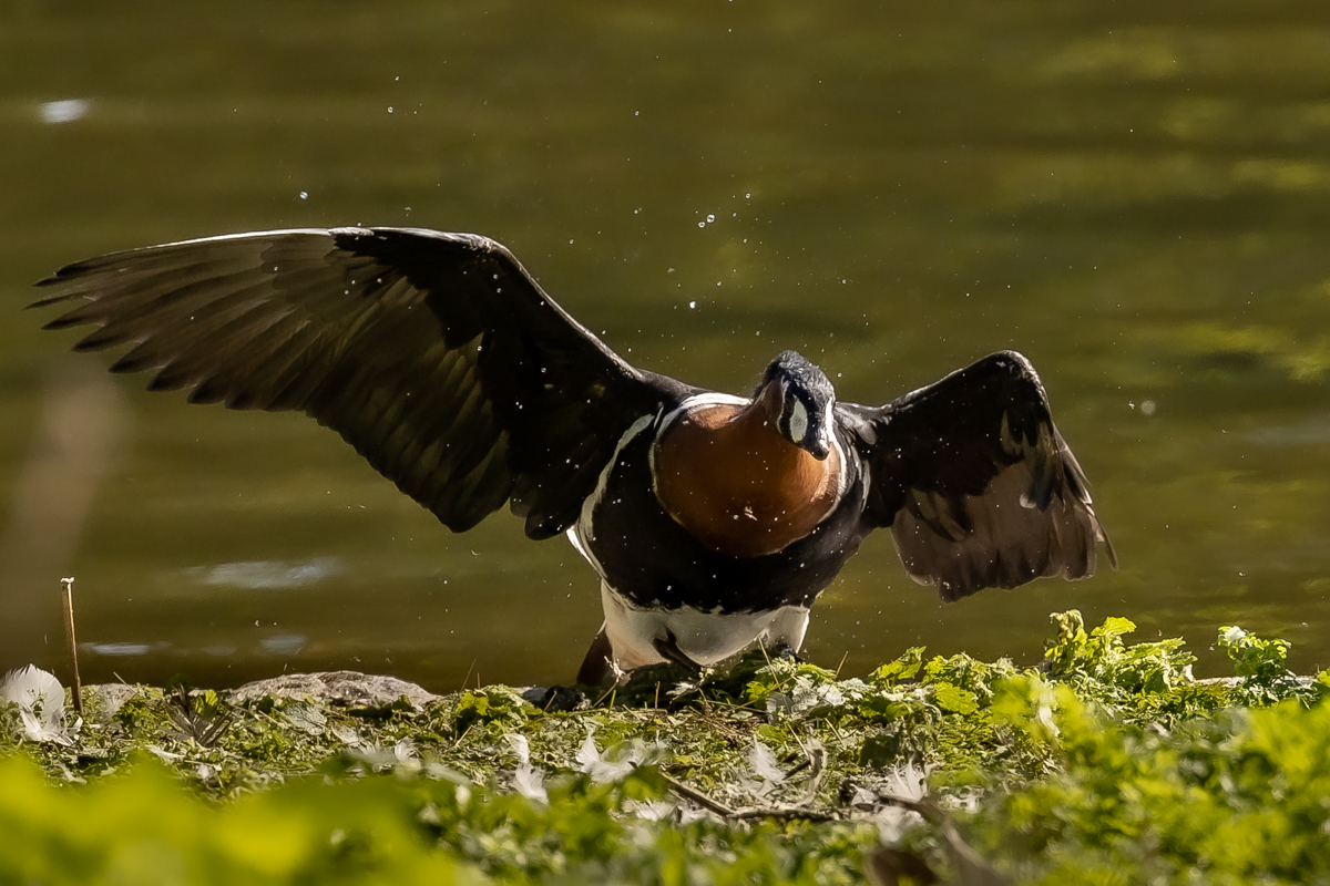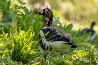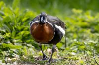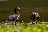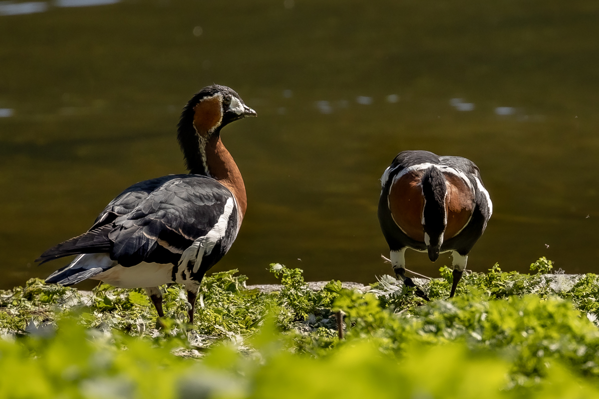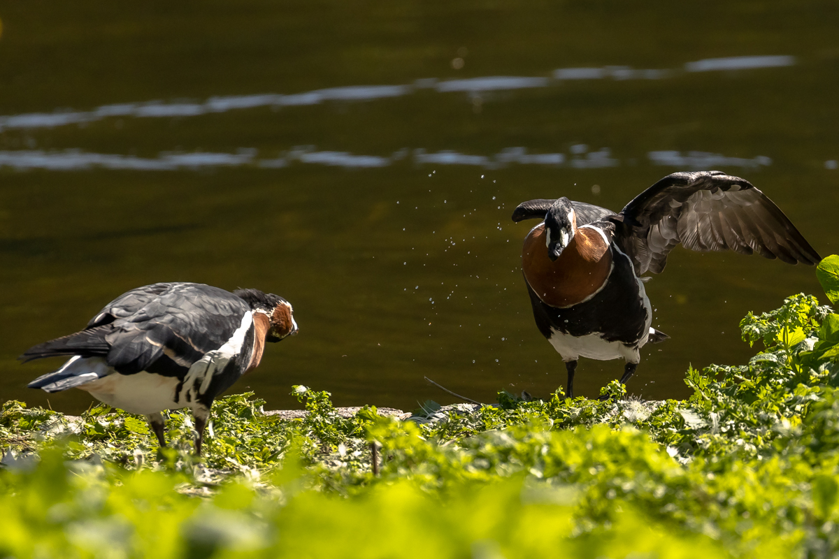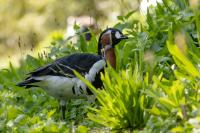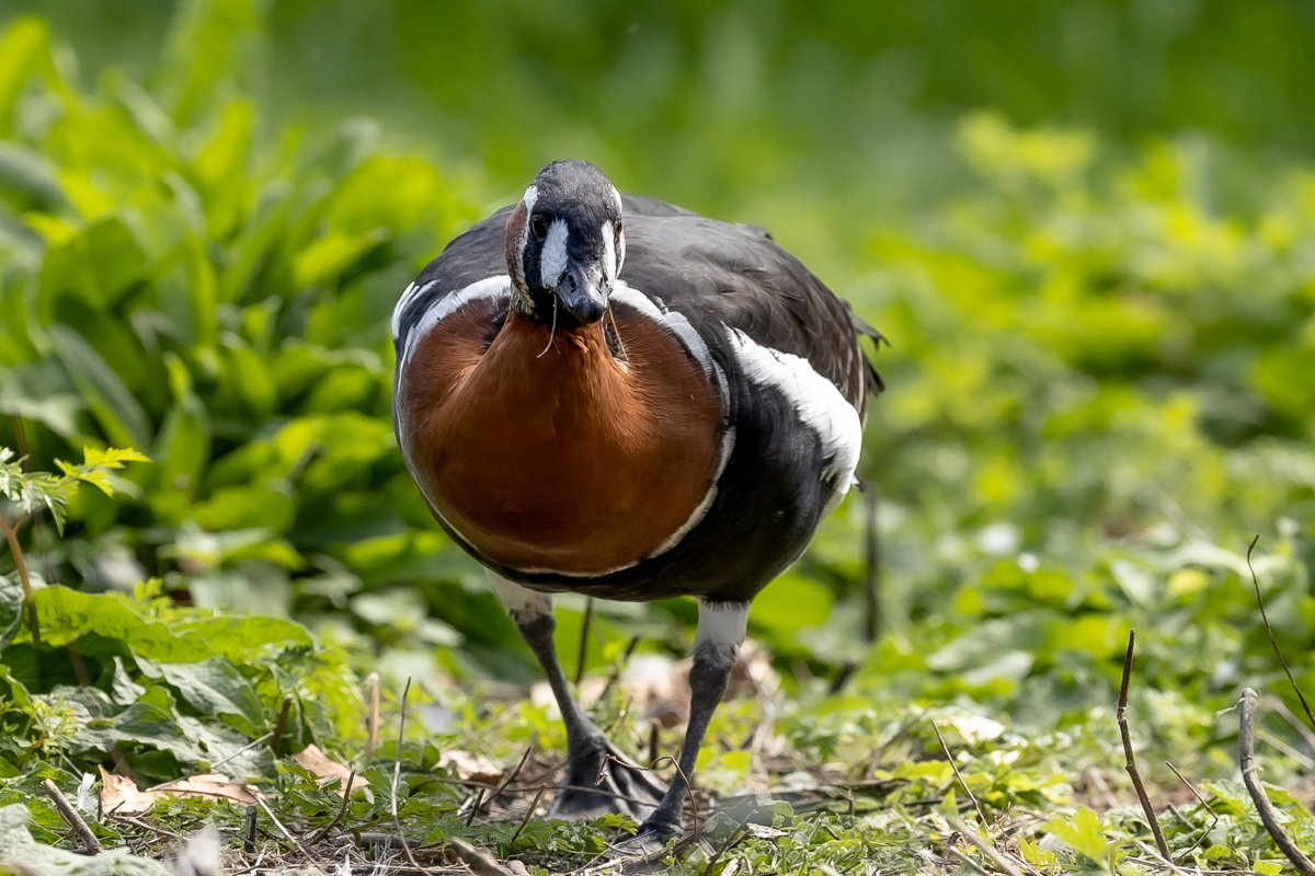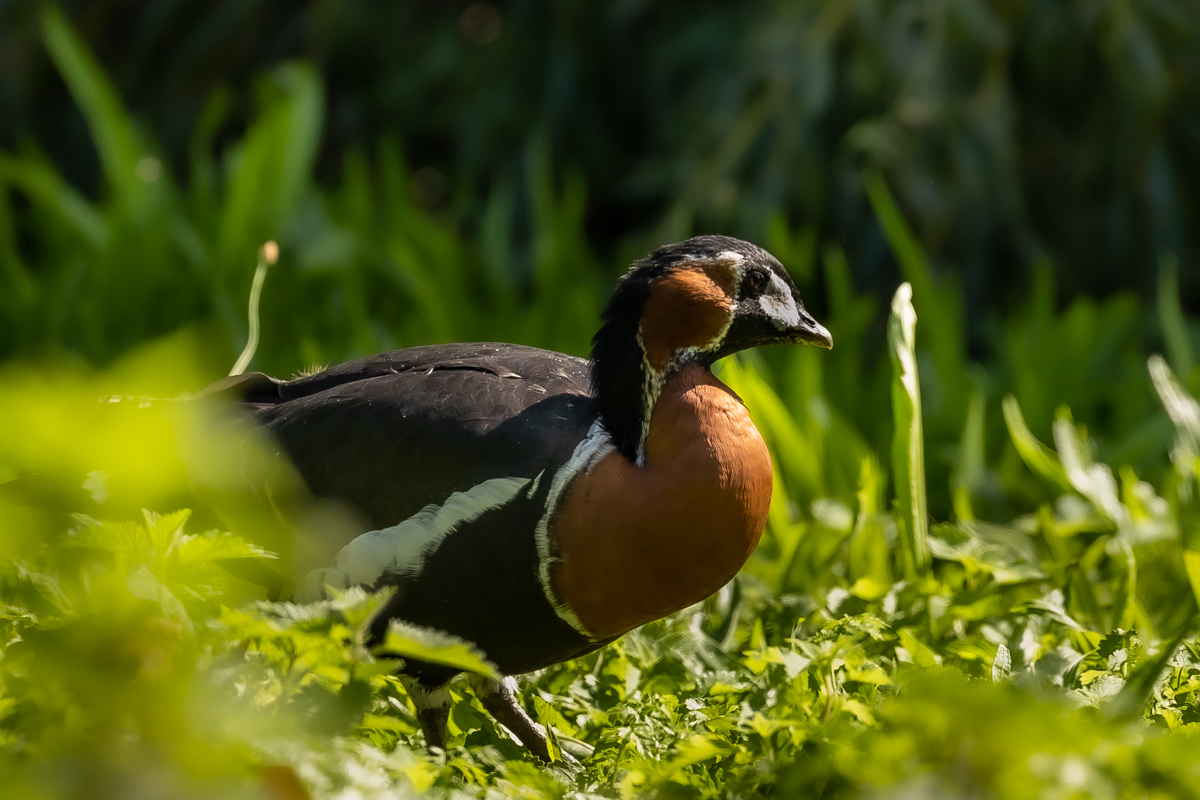 Chyba najpiękniejsza z bernikli dotychczas fotografowanych przeze mnie. Niestety mimo zastosowania konwertera 2x i 600-milimetrowego obiektywu odległość była tak duża, że widać mocne kadrowanie zdjęć. Ale to ważny dla mnie gatunek z dwóch powodów. Pierwszy to taki, że uwiecznienie tego ptaka jest dopełnieniem sfotografowania przedstawicieli rodziny bernikli sporadycznie występujących w Polsce. Druga, że to 400-setny gatunek ptaka zamieszczony na mojej stronie. Bernikla rdzawoszyja jest dość rzadko spotykana w Polsce, bo jej naturalnym środowiskiem jest zachodnia Syberia. Zimują na południu Azji, nad morzem Kaspijskim i w Zatoce Perskiej. Mam nadzieję, że będzie jeszcze okazja i uda się wykonać ciekawsze zdjęcia tej najmniejszej, ale jakże ciekawie ubarwionej bernikli. Tym razem nie było łatwo, bo trudność polegała na dostrzeżeniu jednej, jedynej bernikli, spośród setek, jak nie tysiąca ptaków. Kaczki krzyżówki, gęsi białoczelne, gęgawy, gęsi zbożowe, czajki, czaple siwe i białe, bekasy, biegusy, łabędzie krzykliwe, czarnodziobe- w jednym miejscu to przepiękny, ale rzadki widok w Polsce. Niesamowite, piękne, ciekawe miejsce, do którego trzeba będzie wrócić na wiosnę.  Bernikla rdzawoszyja osiąga wagę do 1,5 kilograma, a rozpiętość skrzydeł to około 1,2 metra.