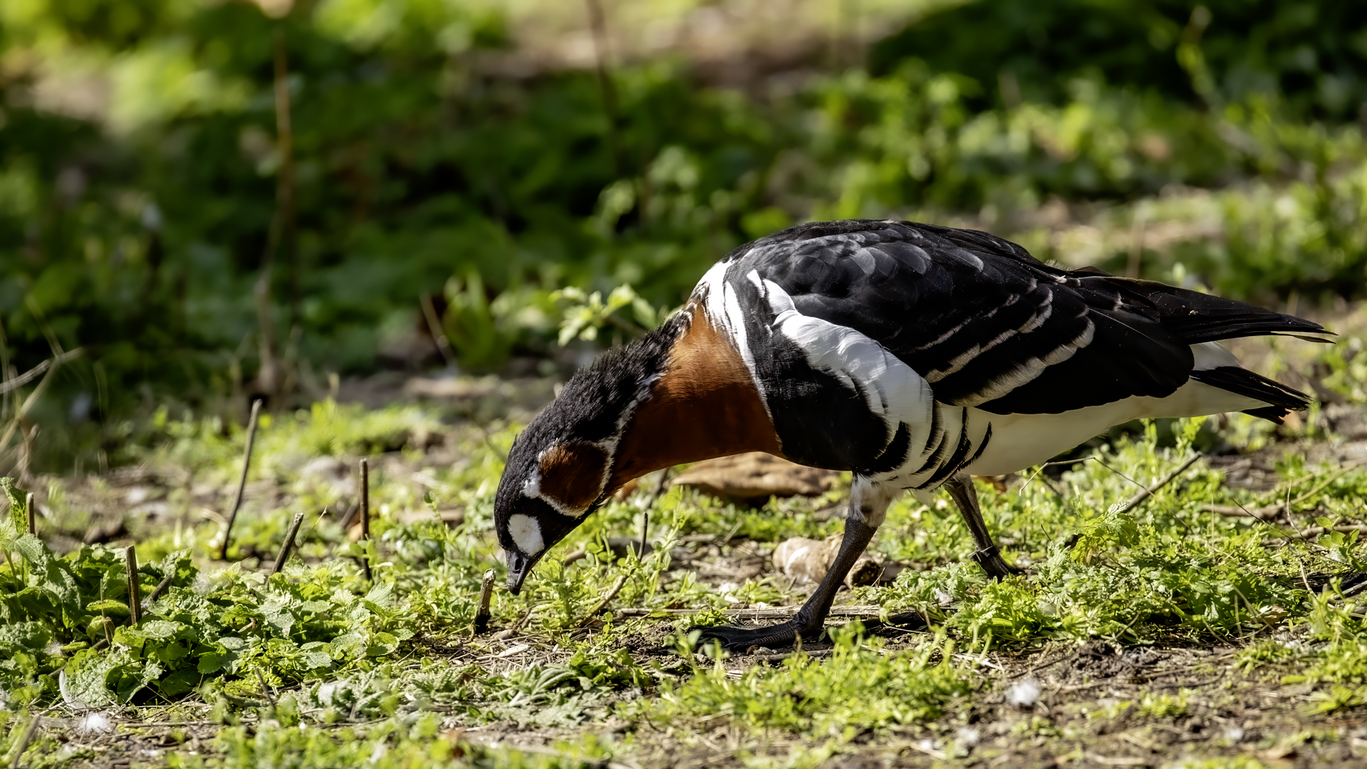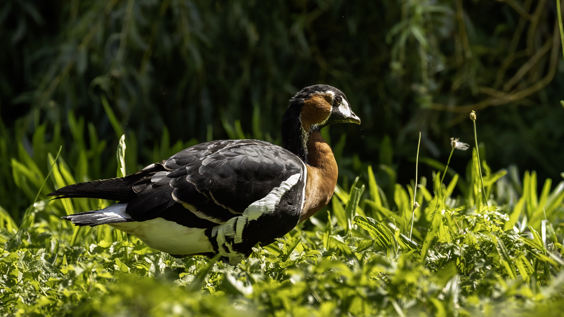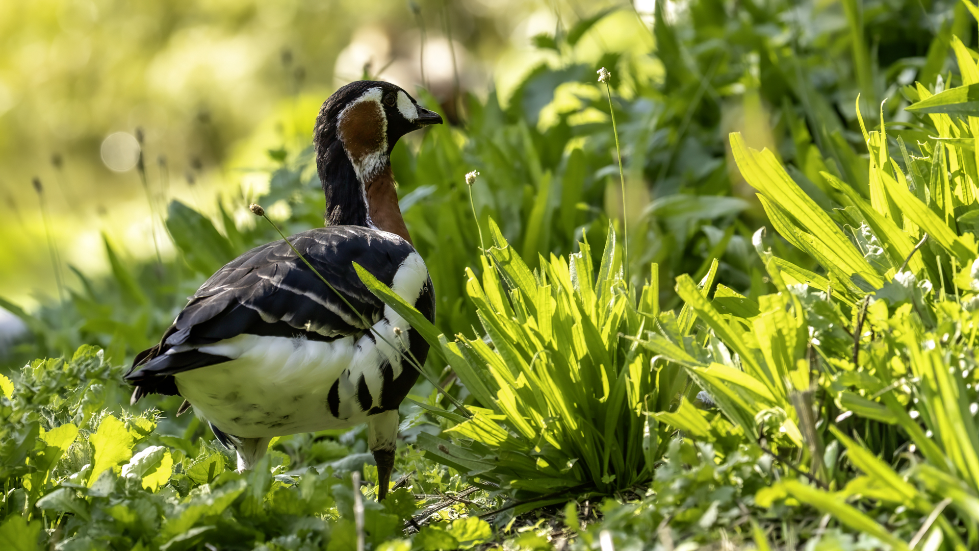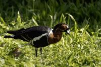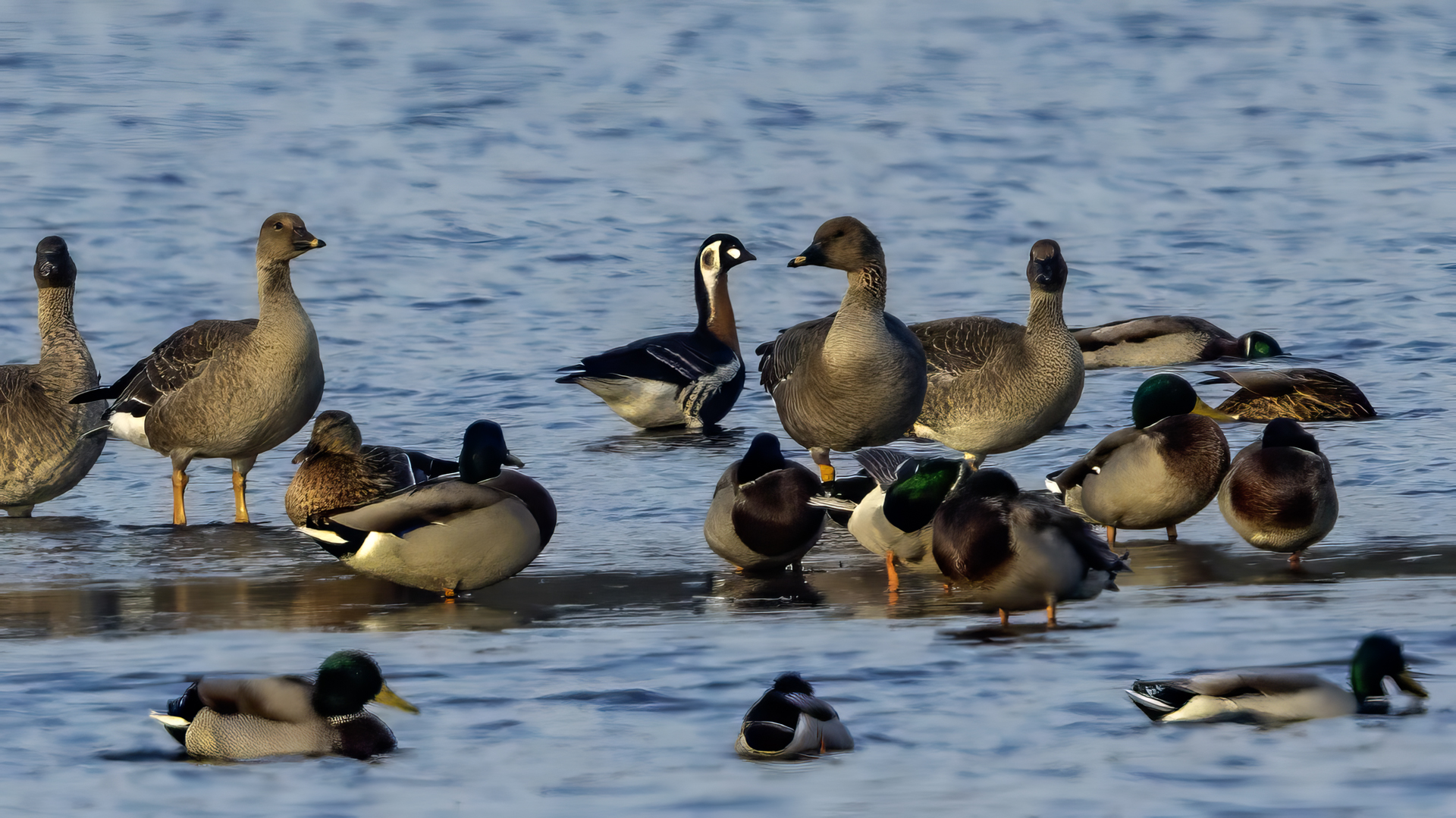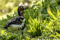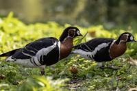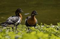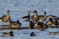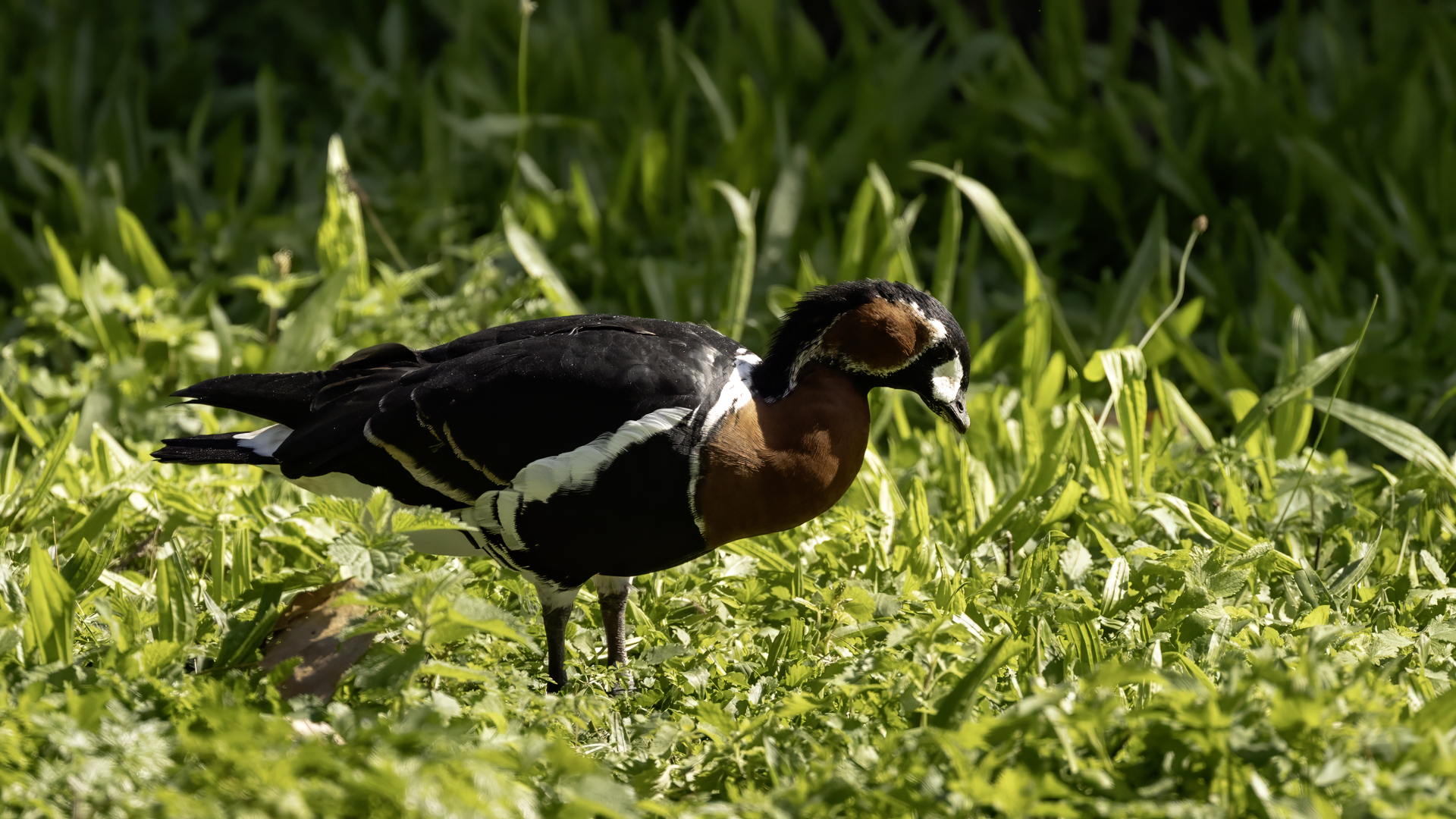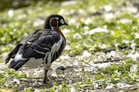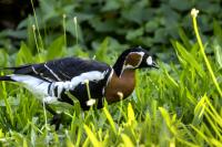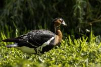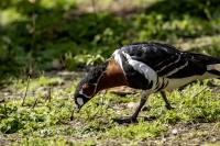 Chyba najpiękniejsza z bernikli dotychczas fotografowanych przeze mnie. Niestety mimo zastosowania konwertera 2x i 600-milimetrowego obiektywu odległość była tak duża, że widać mocne kadrowanie zdjęć. Ale to ważny dla mnie gatunek z dwóch powodów. Pierwszy to taki, że uwiecznienie tego ptaka jest dopełnieniem sfotografowania przedstawicieli rodziny bernikli sporadycznie występujących w Polsce. Druga, że to 400-setny gatunek ptaka zamieszczony na mojej stronie. Bernikla rdzawoszyja jest dość rzadko spotykana w Polsce, bo jej naturalnym środowiskiem jest zachodnia Syberia. Zimują na południu Azji, nad morzem Kaspijskim i w Zatoce Perskiej. Mam nadzieję, że będzie jeszcze okazja i uda się wykonać ciekawsze zdjęcia tej najmniejszej, ale jakże ciekawie ubarwionej bernikli. Tym razem nie było łatwo, bo trudność polegała na dostrzeżeniu jednej, jedynej bernikli, spośród setek, jak nie tysiąca ptaków. Kaczki krzyżówki, gęsi białoczelne, gęgawy, gęsi zbożowe, czajki, czaple siwe i białe, bekasy, biegusy, łabędzie krzykliwe, czarnodziobe- w jednym miejscu to przepiękny, ale rzadki widok w Polsce. Niesamowite, piękne, ciekawe miejsce, do którego trzeba będzie wrócić na wiosnę.  Bernikla rdzawoszyja osiąga masę ciała do 1,5 kilograma, a rozpiętość skrzydeł to około 1,2 metra.