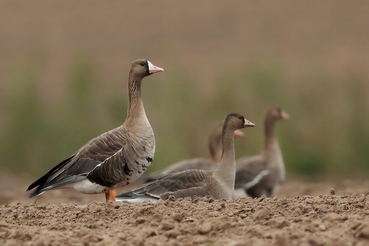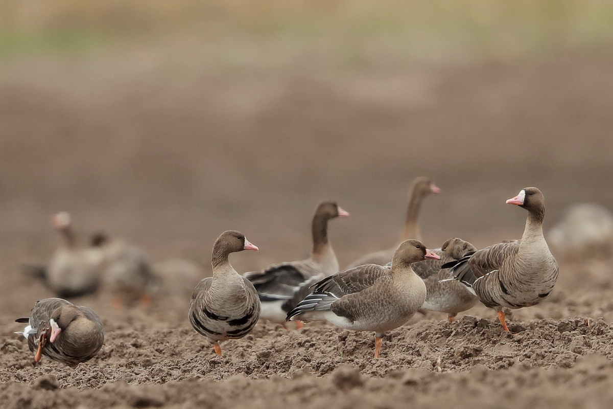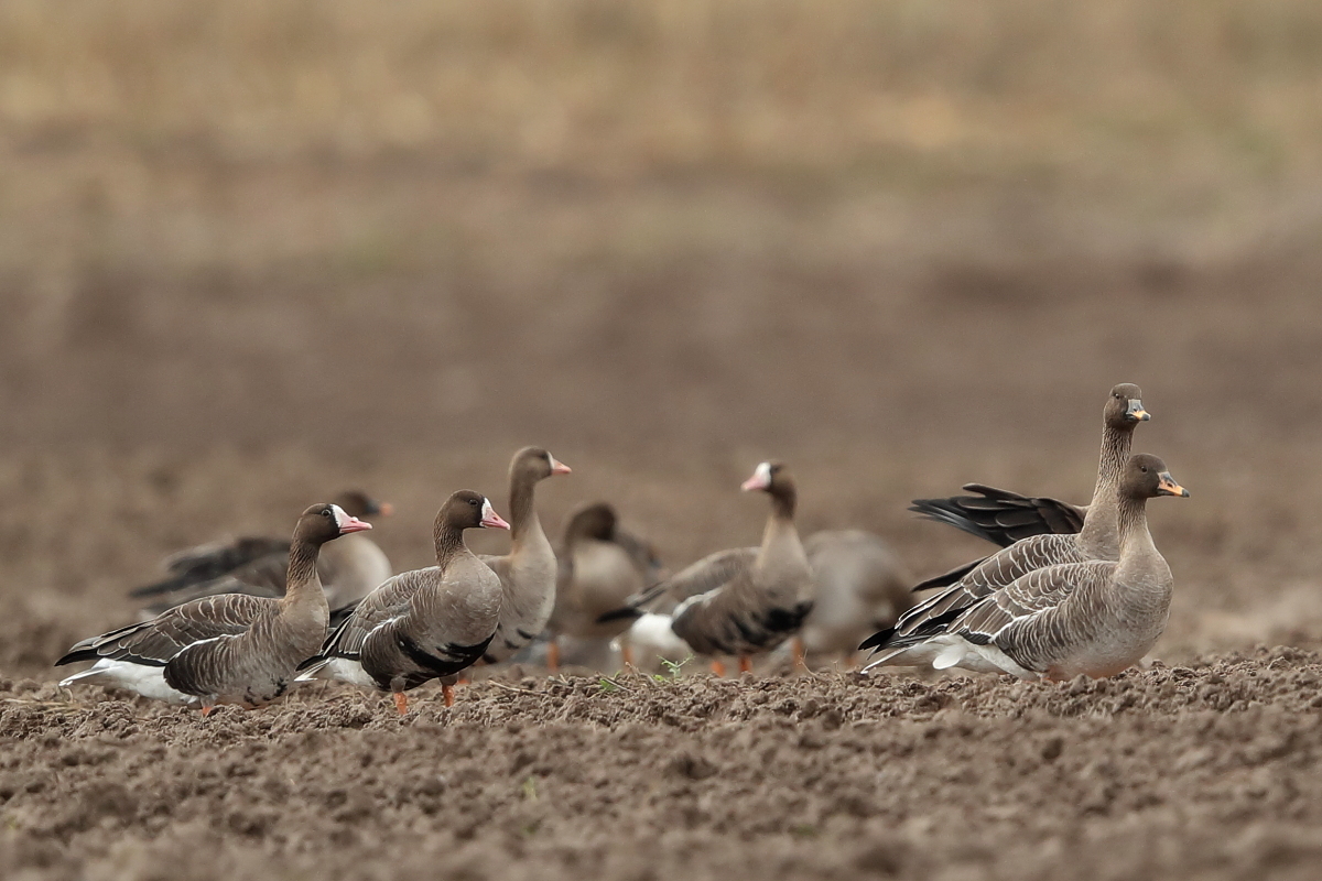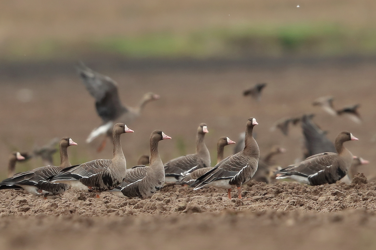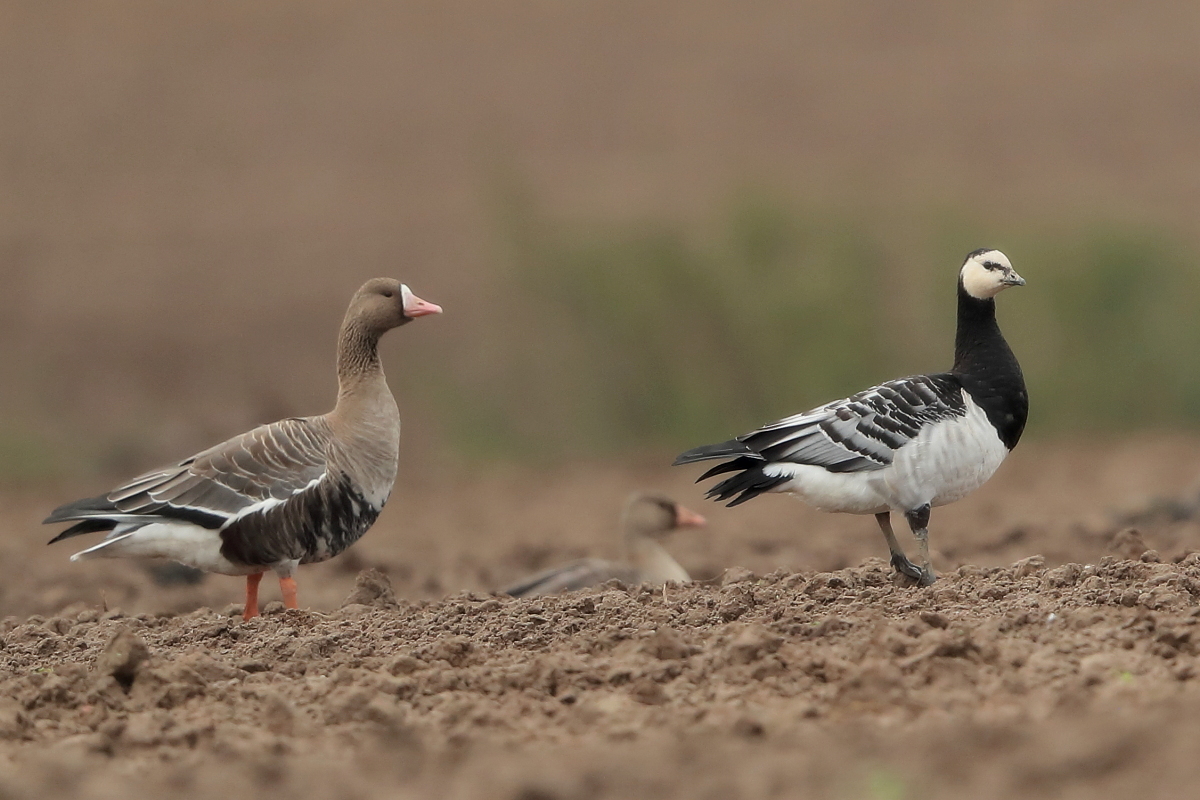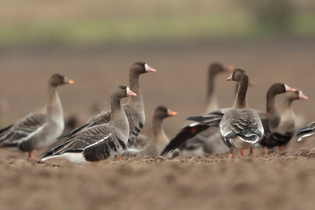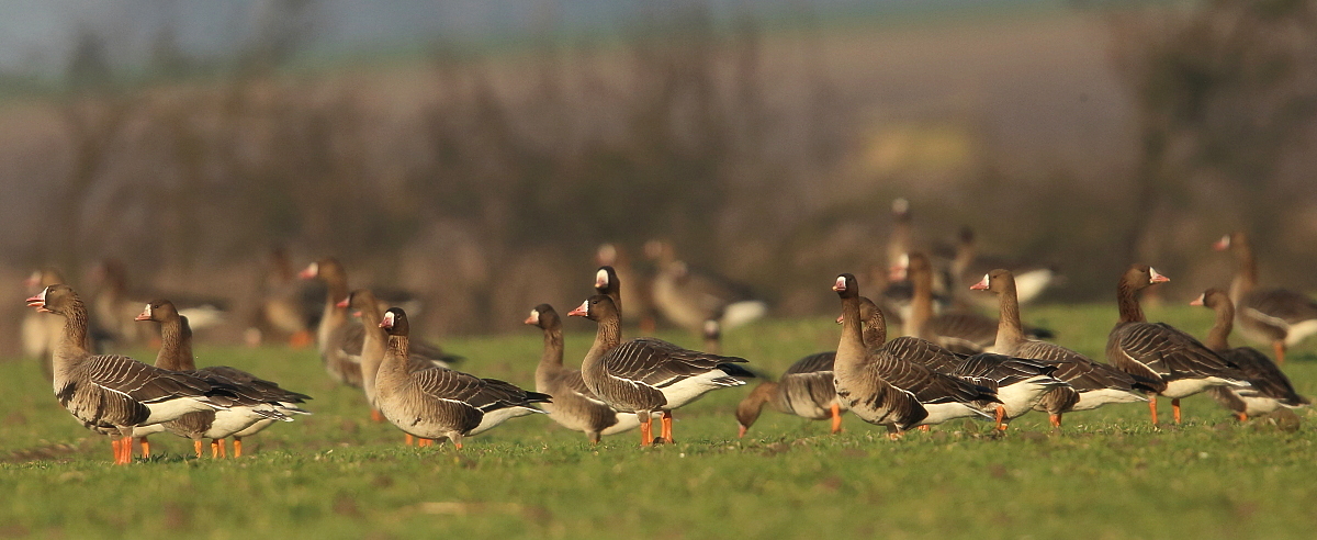 Nie są to jeszcze zdjęcia o bardzo dobrej jakości, ale wprowadzają znaczne urozmaicenie w dotychczasowej, skromnej galerii. I znów sprawił to przypadek. Widząc żerujace przy drodze duże stado gęsi zatrzymałem samochód i powoli zacząłem fotogragować. Wśród żerujących ptaków były gęsi białolice, bęsi białoczelna, zbożowe, gęgawy i szpaki. Odległość była nieco za duża, ale powstały besprzecznie najciekawsze moje, jak dotąd wykonane zdjęcia gęsi białoczelnej.