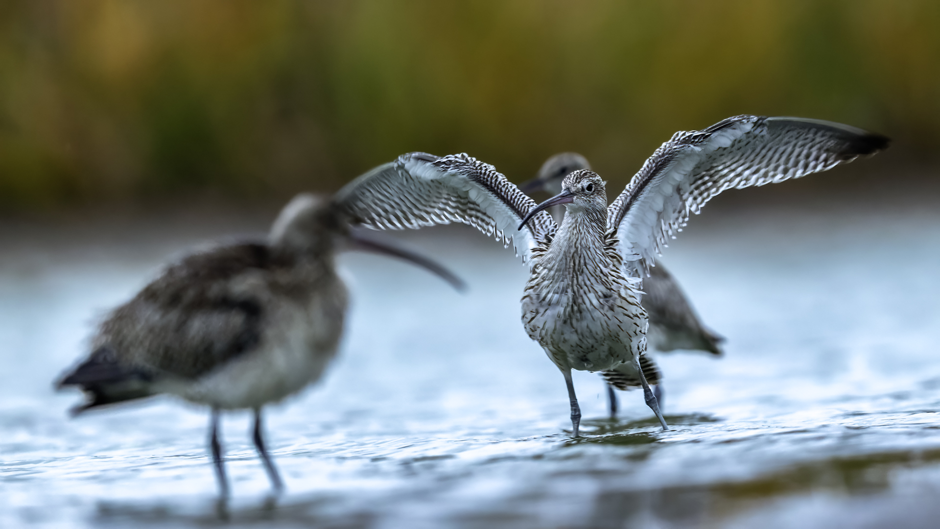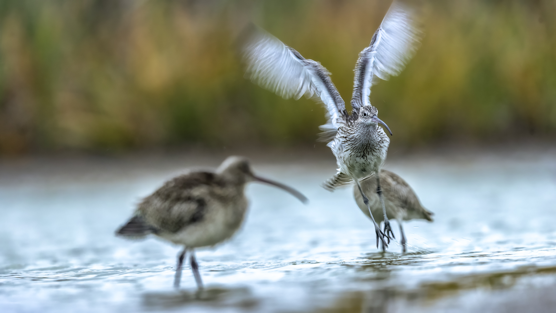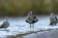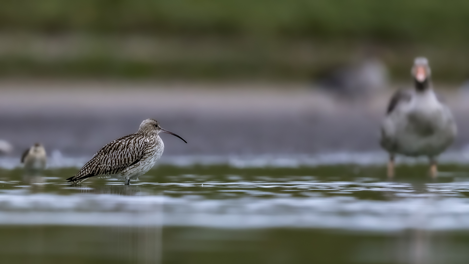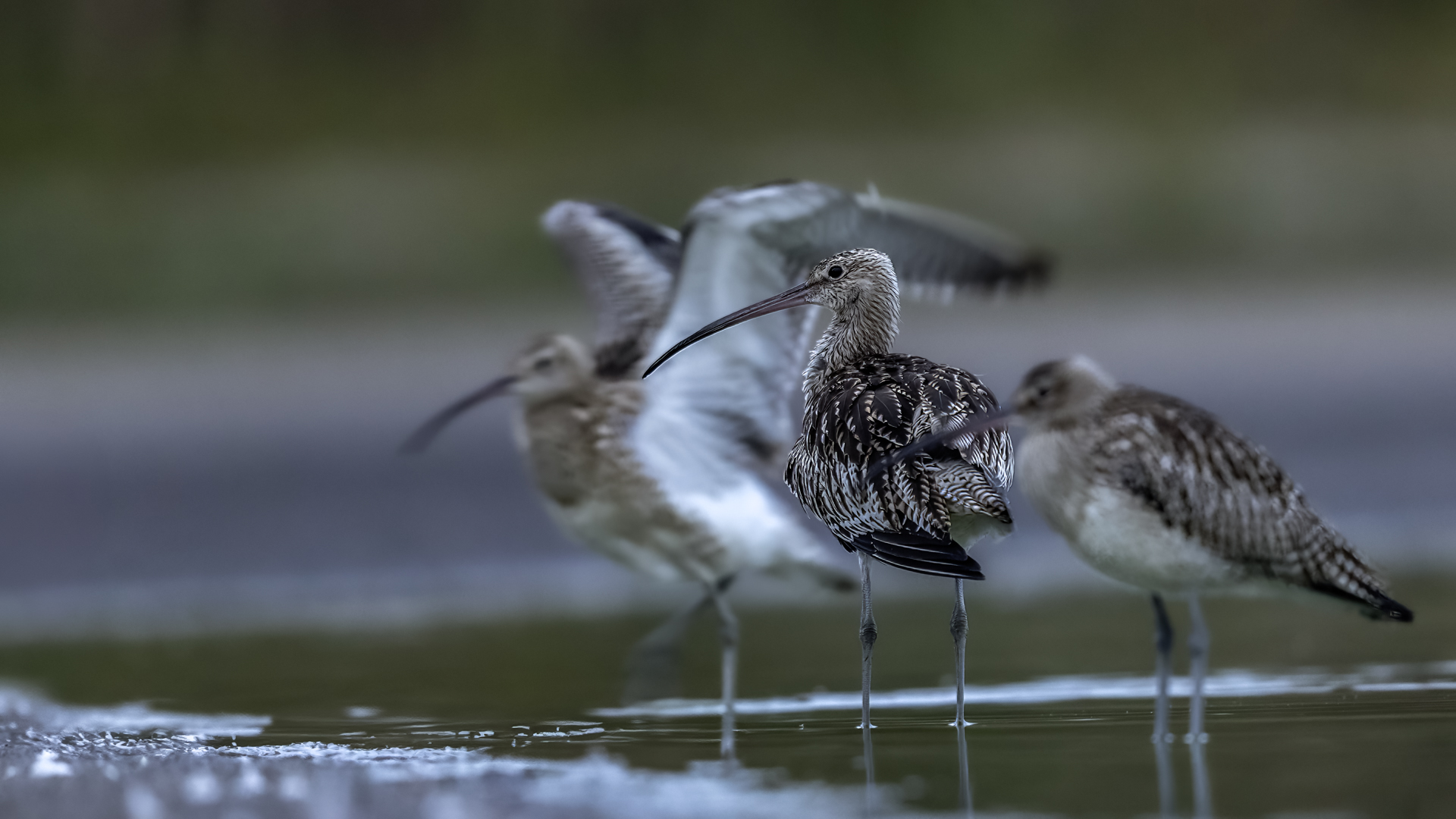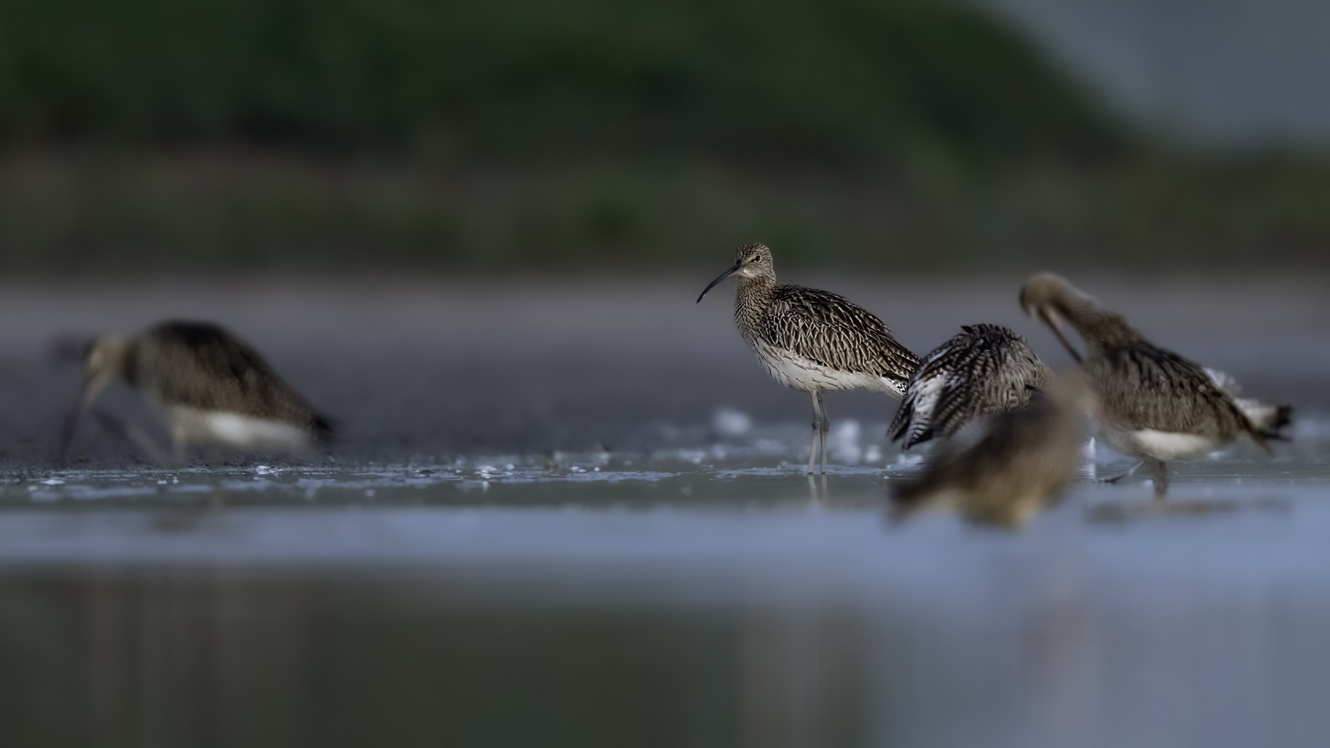 Kilka prób w tym roku sfotografowania kulika wielkiego nie przyniosły efektu. Wielogodzinne wyczekiwania zaowocowały sfotografowaniem innych gatunków, ale nie kulika. I jak to się często zdarza, nie ma co planować w wyprawach fotograficznych, bo jak powtarzam, to nie market i tym razem niespodziewanie udało się sfotografować właśnie nieplanowane kuliki. Siedzę na stawach hodowlanych fotografuję czaple, wąsatki, gdy nagle, niestety w dość znacznej odległości wylądowały 4 kuliki wielkie. Dla takich chwil warto próbować, bo emocji i radości z przylotu ptaków było wiele. Niestety ptaki, tak jak nagle się pojawiły, tak szybko odleciały. Ale ta chwila znacznie odmieniła dotychczasowy mój dorobek w uwiecznieniu tego gatunku. Mimo, że zdjęcia mają charakter dokumentacyjny, to zastępują dotychczasowe i wprowadzają znaczne urozmaicenie. Miejmy nadzieję, że to nie koniec w budowie galerii tego gatunku tego pięknego ptaka, największego naszego siewkowca...