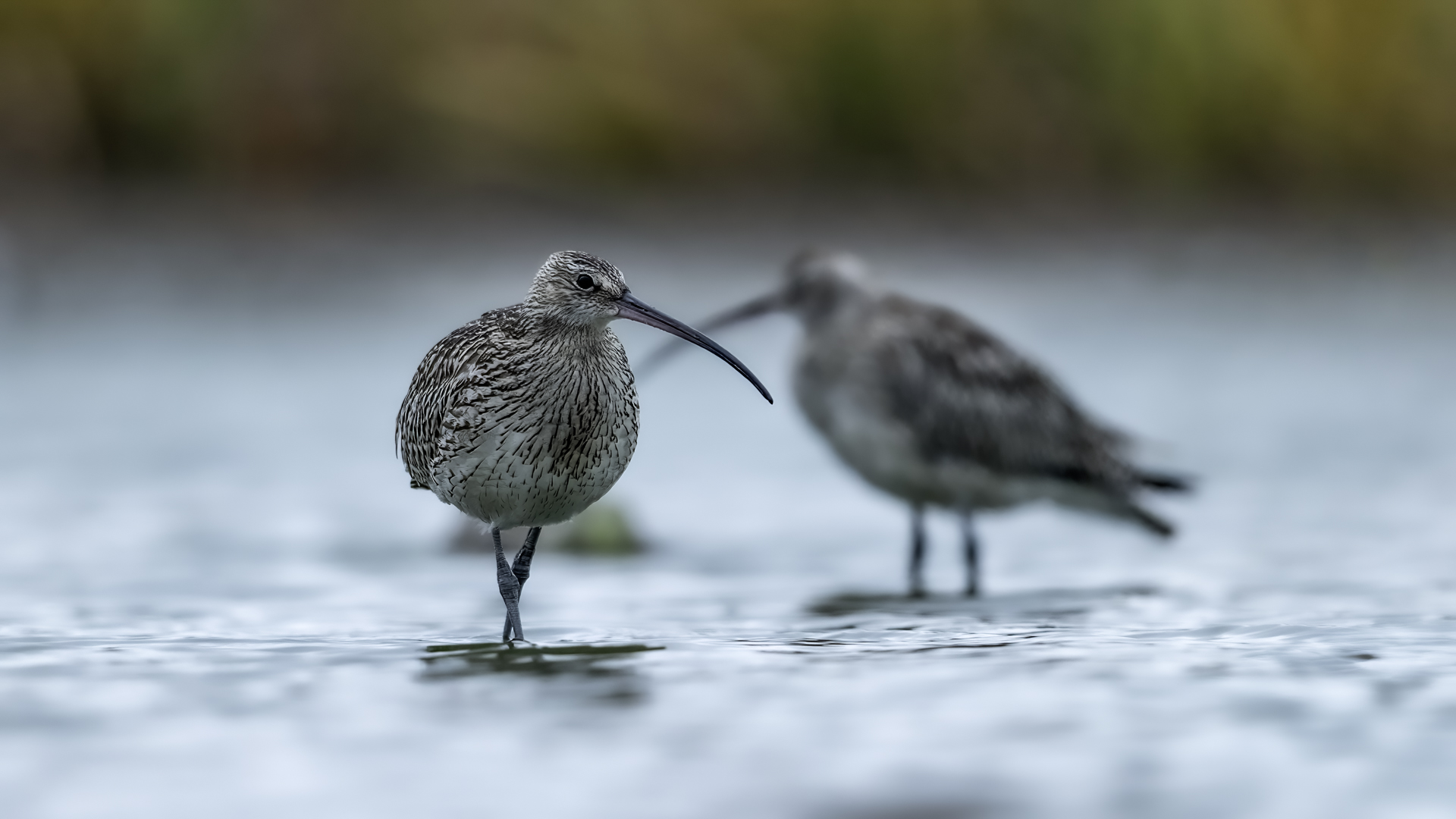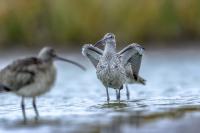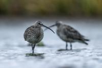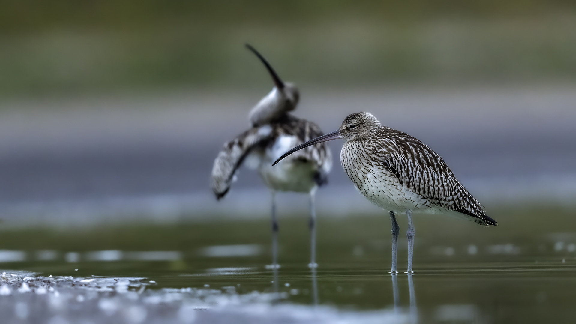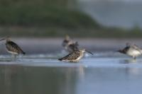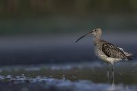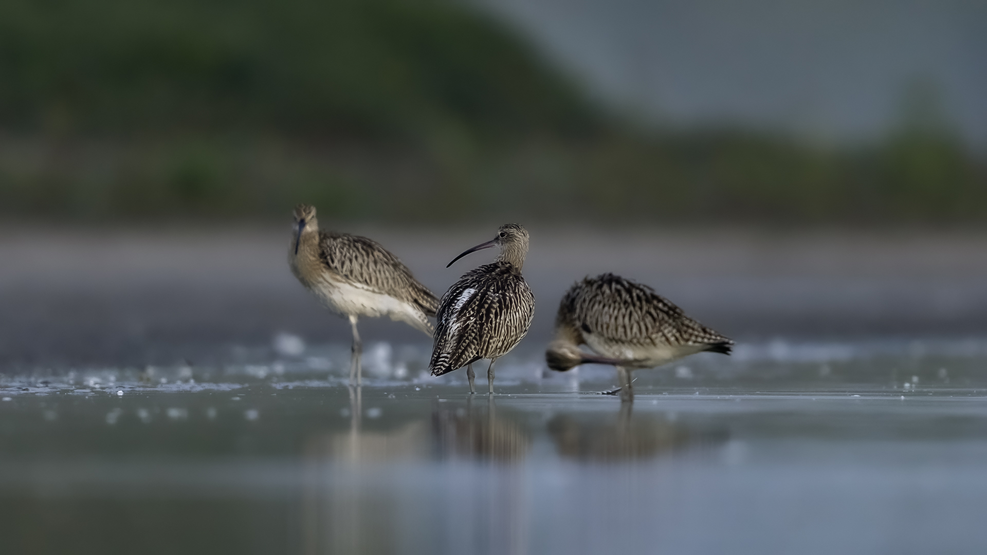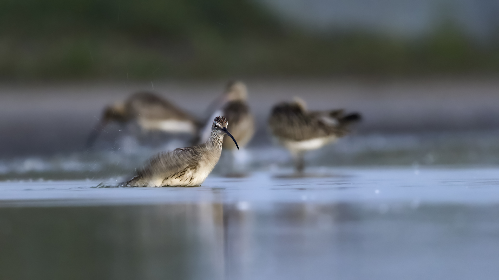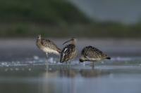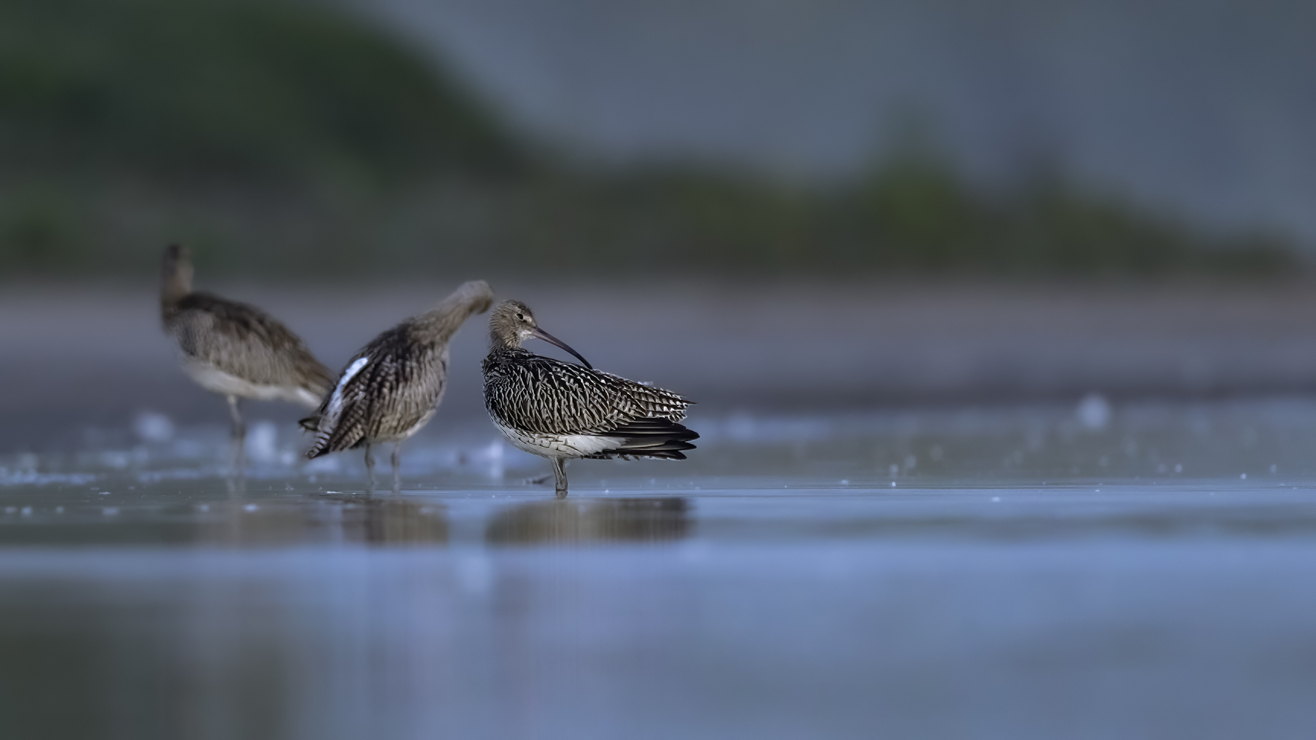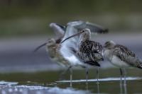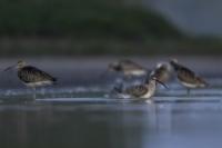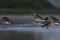 Nasze dotychczasowe próby fotografowania kulików wielkich zawsze były związane ze świtem, nad ranem. A, że scenariusz zachowania ptaków zawsze się powtarzał i trudno było o zdjęcia w dobrym świetle, to trzeba coś zmienić w naszym działaniu. Postanowiłem posiedzieć w czatowni od południa do zmroku. Ciekawe, czy kuliki bywają na zbiorniku w ciągu dnia i na nim żerują. Aby się przekonać trzeba poobserwować z czatowni i sprawdzić. Jak zaplanowałem tak zrobiłem. Już na samym dojściu do czatowni miła niespodzianka. Kilkadziesiąt biegusów poderwało się na mój widok do lotu. Jak się okazało bardzo krótkiego, bo zatoczyły małe kółko i usiadły pomiędzy mną a oddalona o kilkadziesiąt metrów czatownią. Powstają pierwsze zdjęcia tak jak nad naszym morzem podczas jesiennych przelotów ptaków. Trwało to minutę, dwie, bo trzeba wejść do czatowni, bo to dla kulików tutaj przyszedłem. Przez kilka godzin wyczekiwania w czatowni pojawiały się przed obiektywem niemal wyłącznie biegusy: zmienny, krzywodzioby i piaskowiec. Przez te kilka godzin wyczekiwania miałem cały wachlarz zmienności światła i pogody. Od stalowego, kontrastowego słońca, poprzez deszczową ulewę po, na zakończenie dnia, piękne miękkie, żółte światło. W tym świetle do grona fotografowanych ptaków dołączyła czapla siwa, jeden z moich ulubionych gatunków. Powstają ciekawe zdjęcia tych wszystkich wymienionych gatunków, dlatego też niniejszy tekst jest wspólny dla wszystkich wymienionych gatunków. No cóż w dość nietypowej porze powstało wiele ciekawych zdjęć wprowadzających na tyle zmian w galeriach, że trafiają wszystkie sfotografowane gatunki do nowości. Po raz pierwszy w życiu fotografowałem biegusy z czatowni. Były niemal cały czas ze mną. Około godziny 18:30 światło było na tyle słabe, że postanowiłem zakończyć na tym fotografowanie. Po chwili pakowania, wychodzę z czatowni idąc po mieliźnie w kierunku samochodu. Nagle słyszę znajomy głos, który od kilku dni zapowiadał zawsze przybycie kulików wielkich. Nigdy nie lądowały bez wydania swych charakterystycznych odgłosów. Obróciłem się i jest! Cała siódemka kulików wielkich, dotychczas obserwowanych ptaków od chyba już ponad miesiąca. Wylądowały na odległej ode mnie wyspie. Powstało pamiątkowe dokumentacyjne zdjęcie, które dodałem, póki co, na końcu galerii kulika wielkiego. Ptaki przebywają tam wyłącznie od zmierzchu do świtu.