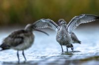 Wreszcie kilka przypadkowych zdjęć w galerii kulika zostaje uzupełnione znacznie ciekawszymi zdjęciami, ale nie tworzących jeszcze ostatecznie galerii o statusie bardzo dobrej. Tym razem zaangażowanie czasowe było znaczne, bo takiej okazji nie można było nie wykorzystać. A było nią, zaproszenie do nadwodnej czatowni, gdzie pojawiają się kuliki. Halina podziękowania i pozdrowienia ( link ). Kilka poranków, a właściwie nocy, trzeba było poświęcić na próby zrobienia zdjęć. Do czatowni trzeba przybyć przynajmniej na godzinę przed wschodem słońca i czekać. W niemal zupełnej ciemności powstaje bardzo dobrej jakości nagranie głosu kulika. Widać tylko niewyraźne, ciemne sylwetki ptaków w odległości około dziesięciu, piętnastu metrów. Ptaki prócz odgłosów zajmują się poranną toaletą. Kąpią się, trzepoczą skrzydłami. Raz dało się zaobserwować 7 osobników. Jak zrobią to samo za godzinę, dwie to powstaną niesamowite zdjęcia, pomyślałem sobie. No i na tym myśleniu się skończyło. Kuliki codziennie miały w zwyczaju odlatywać na kilka, kilkanaście minut przed oficjalnym wschodem słońca. Wschodem słońca, którego nie dało się zaobserwować. Zawsze albo mgła, albo chmury. Jak pogoda się wyklarowała to ptaków już nie było. Na trzeci dzień nie pojawiły się w ogóle przed obiektywem. Przez dwa pierwsze dni dało się w oddali obserwować duże stado czajek. Na trzeci dzień nie było już żadnej czajki. Pewnie zebrały się w stado i odleciały. Pomyślałem, że kuliki zrobiły to samo, ale około 9 godziny usłyszałem kilka kulikowych sekwencji głosów. Jednak nie, nadal tu są trzeba czekać. Niestety dało się je zaobserwować dopiero następnego dnia, też przed świtem, któremu towarzyszyła na moje nieszczęście mgła. Powstają zdjęcia wprawdzie wprowadzające jakieś urozmaicenie do galerii, ale nie dla takich zdjęć wstałem o 3 w nocy. Ostatecznie trzeba powiedzieć, że było warto przez te kilka dni przestawić sobie rytm dnia. Nie tylko kuliki dały się obserwować i fotografować. Kilka poranków z kulikami zaowocowało też wprowadzeniem zmian w galerii gęgawy, kwokacza, brodźca śniadego i żurawi. Galeria kulika zostaje przebudowana i trafia do nowości.