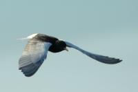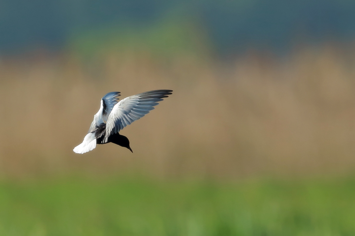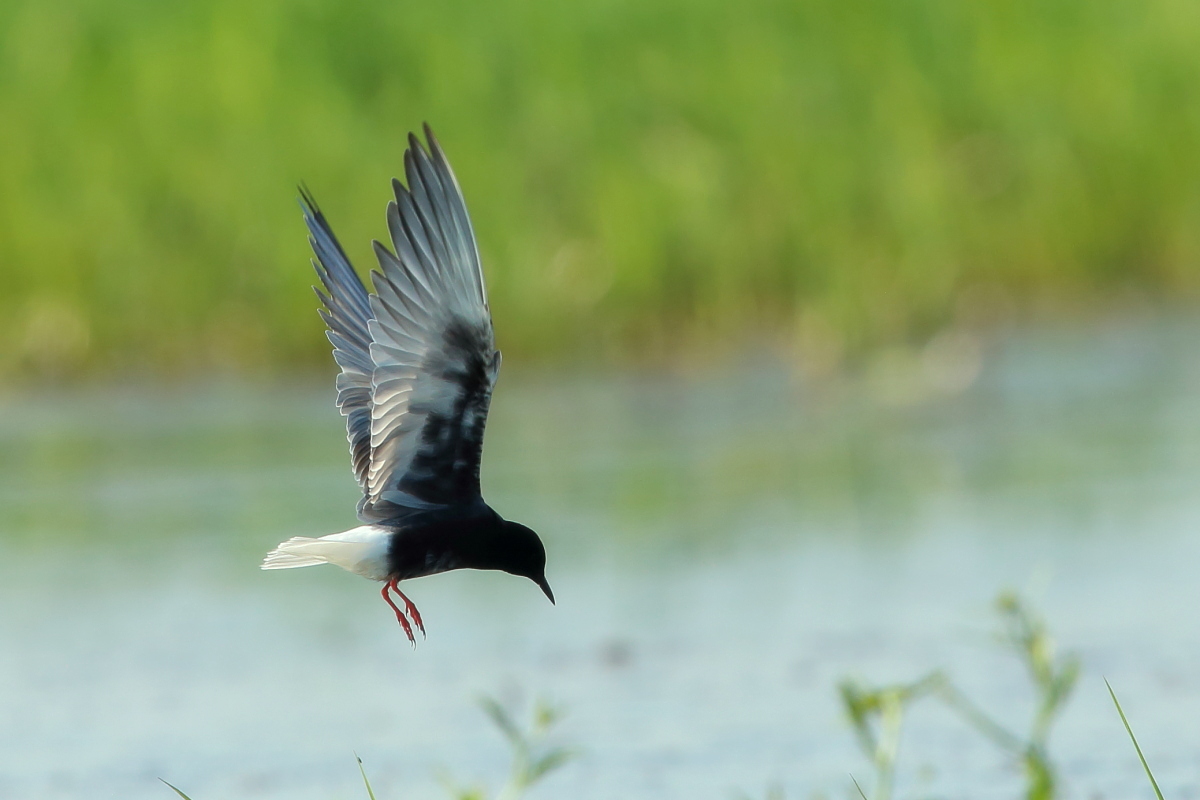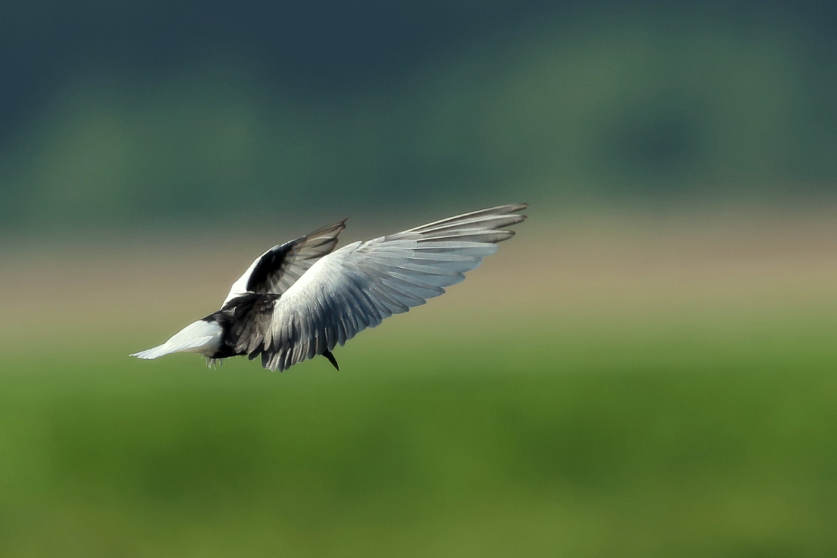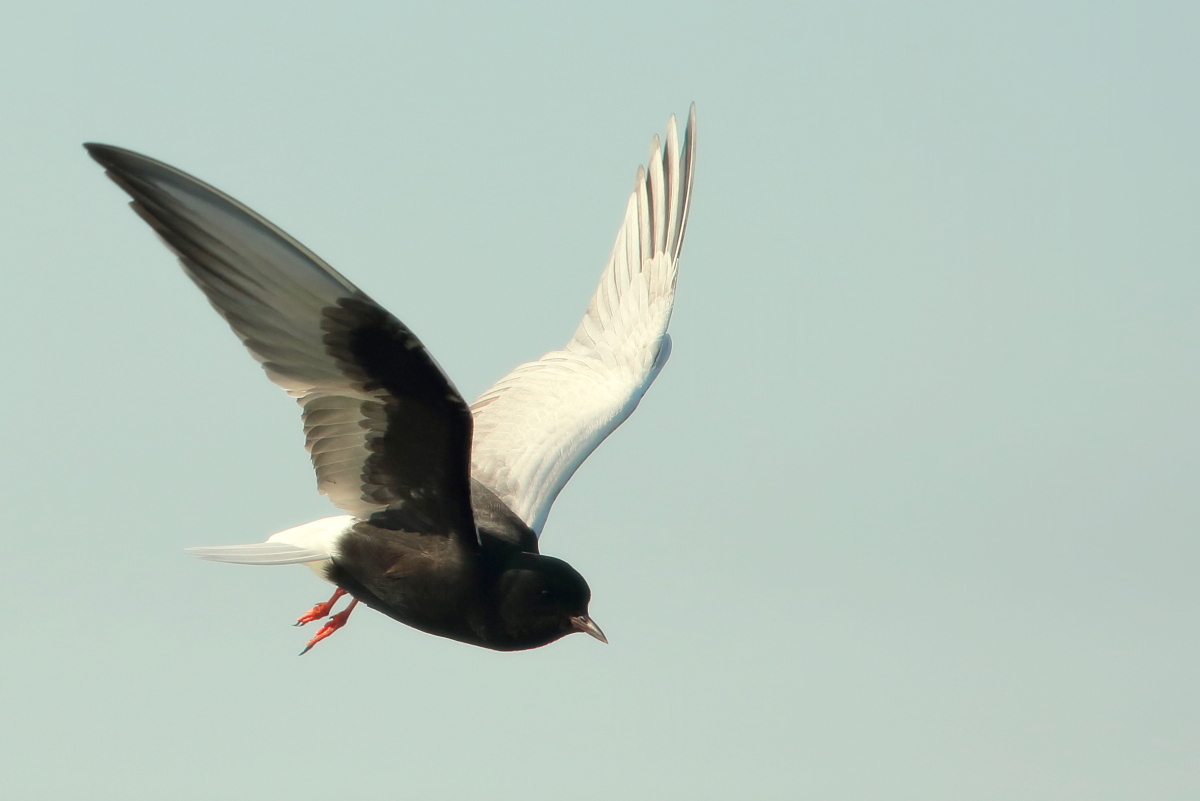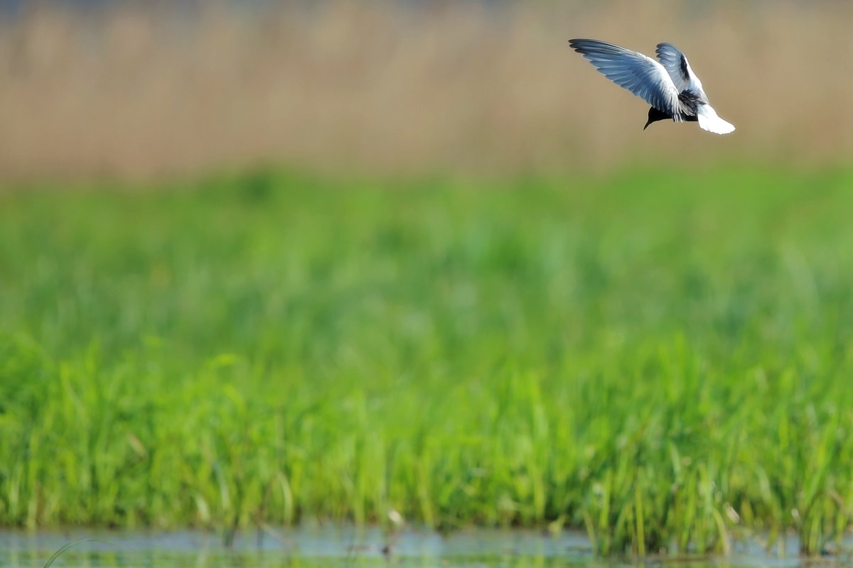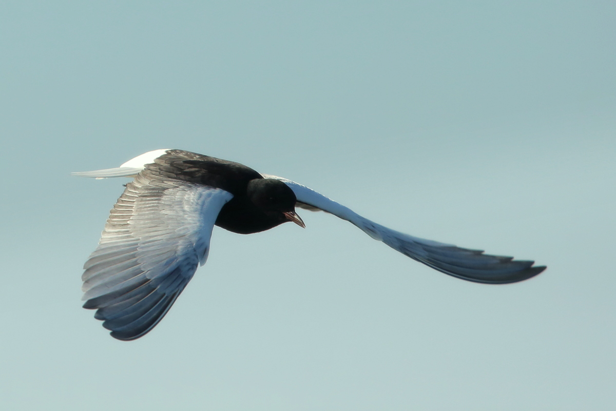 Trudny obiekt do fotografowanie ze względu na dużą mobilność zachowania. Z jednej strony długi teleobiektyw umożliwia zbliżenie i wykonanie satysfakcjonującego zdjęcia, nie mówiąc już o szybszym autofokusie, ale z drugiej strony co z tego, jeżeli często w kadrze znika fotografowany ptak. Krótszy teleobiektyw daje szansę łatwiejszego śledzenia latających rybitw, ale autofokus z racji dużo mniejszego obiektu wolniej działa, no i trzeba mocno kadrować zdjęcie, a więc pogorszyć jego jakość. Nie ma idealnych rozwiązań… Jak Widzicie udało się wykonać kilka zdjęć, na tyle, że powstała niniejsza galeria. Rybitwy żyją w koloniach i co ważne są nie bardzo płochliwe. Nie wymagają nocnych wejść do czatowni, tak jak to ma miejsce w przypadku innych gatunków. Jeżeli w odległości kilkunastu metrów usiądziemy i okryjemy się chociażby siatką maskującą to rybitwy zaakceptują i nadal będą się naturalnie zachowywały. Jedna z mew po 20 minutach usiadła tak blisko przed obiektywem, że nie można było ustawić ostrości i wykonać jej „anatomicznego” zdjęcia. Śledzenie dość szybko poruszających się rybitw to nie lada „ciuciubabka”. Na szczęście co chwila „zawisają” nad wodą i wypatrują zdobyczy. Niestety na tyle wysoko, że w tle mamy niebo, a więc najmniej atrakcyjną opcję. Rzadko schodziły tak nisko, że w tle była zieleń. Rybitwy są pięknym obiektem do fotografowania, szczególnie w szacie godowej. Trzeba mieć dostatecznie dużo czasu i cierpliwości, aby z tysięcy prób dynamicznie poruszających się rybitw, wybrać te godne do ich zaprezentowania. Rybitwa białoskrzydła waży około 60 gramów, przy rozpiętości skrzydeł około 60 cm
