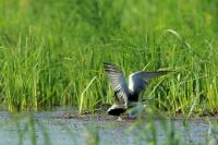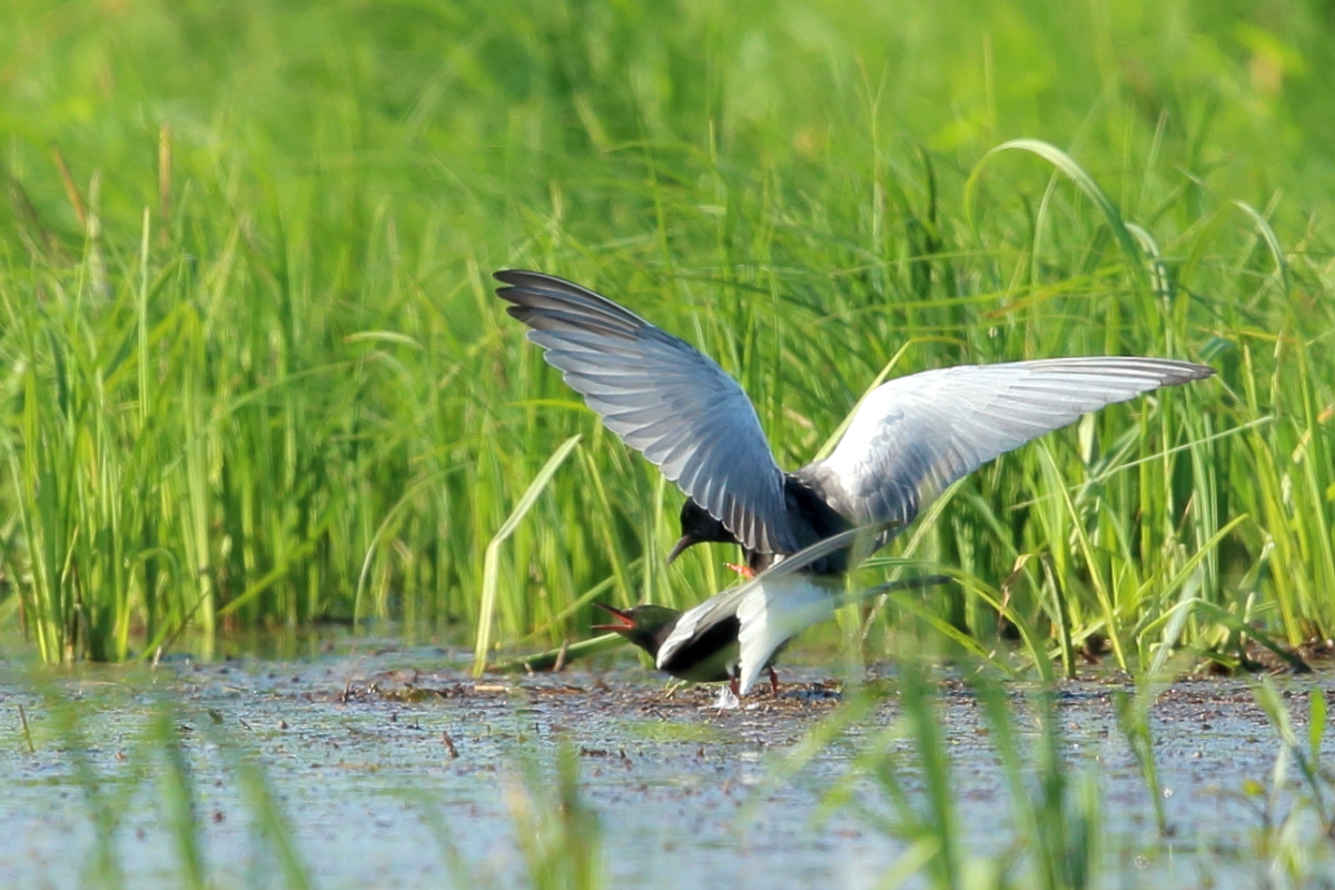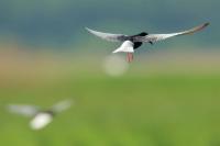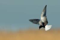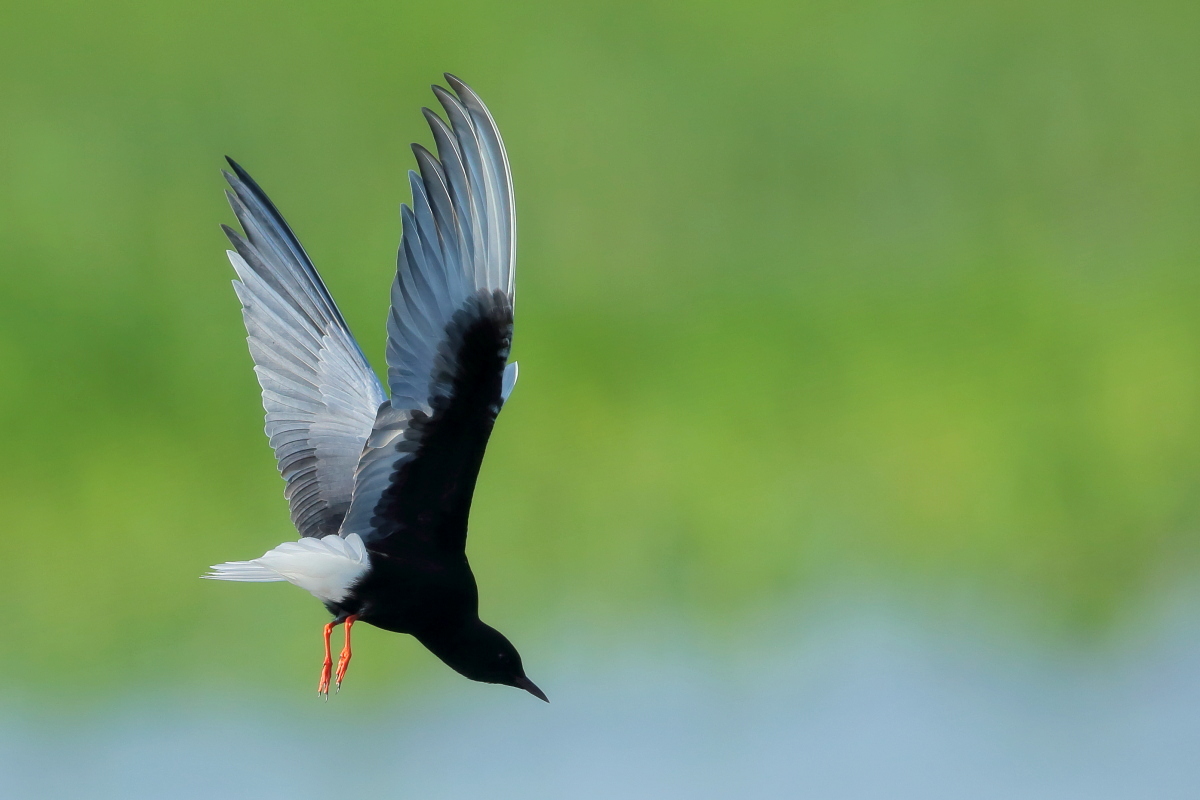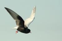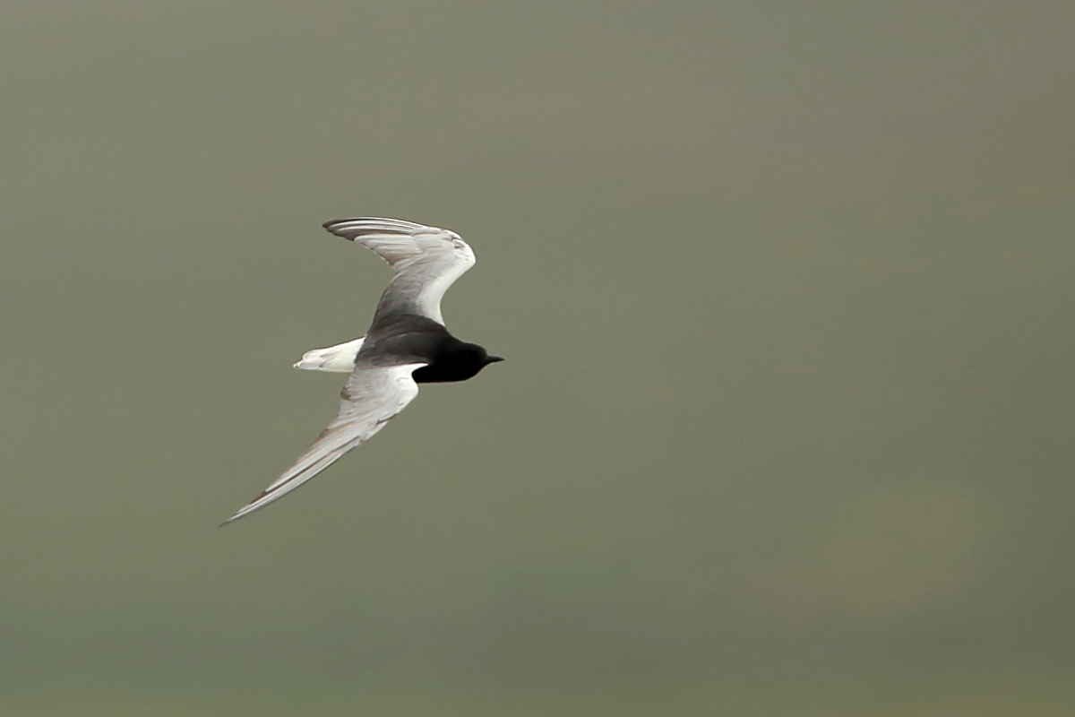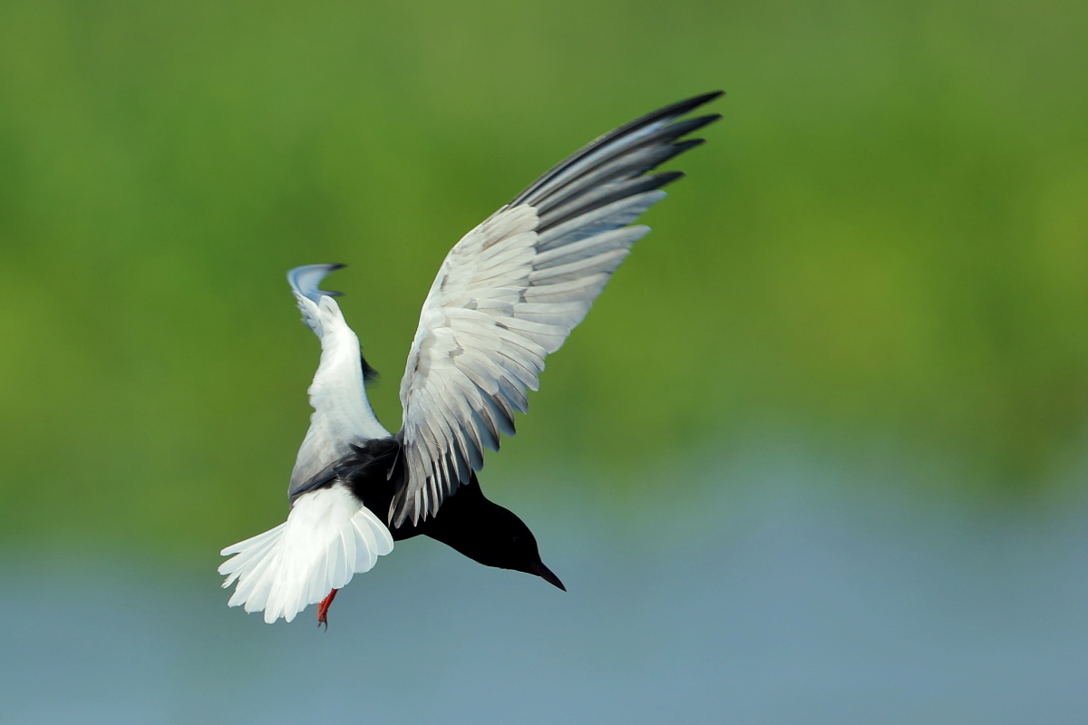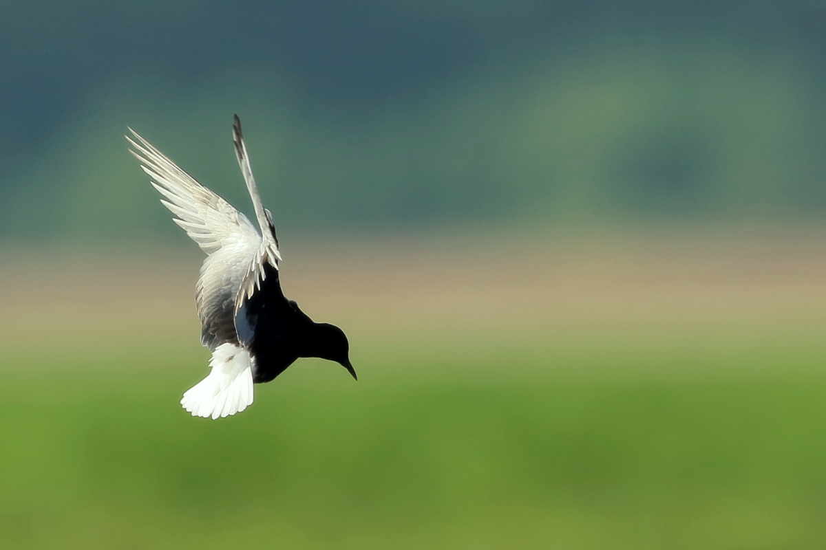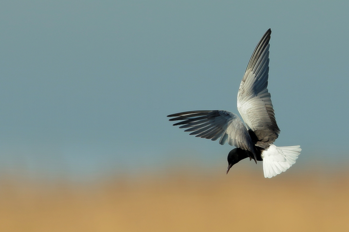 Trudny obiekt do fotografowanie ze względu na dużą mobilność zachowania. Z jednej strony długi teleobiektyw umożliwia zbliżenie i wykonanie satysfakcjonującego zdjęcia, nie mówiąc już o szybszym autofokusie, ale z drugiej strony co z tego, jeżeli często w kadrze znika fotografowany ptak. Krótszy teleobiektyw daje szansę łatwiejszego śledzenia latających rybitw, ale autofokus z racji dużo mniejszego obiektu wolniej działa, no i trzeba mocno kadrować zdjęcie, a więc pogorszyć jego jakość. Nie ma idealnych rozwiązań… Jak Widzicie udało się wykonać kilka zdjęć, na tyle, że powstała niniejsza galeria. Rybitwy żyją w koloniach i co ważne są nie bardzo płochliwe. Nie wymagają nocnych wejść do czatowni, tak jak to ma miejsce w przypadku innych gatunków. Jeżeli w odległości kilkunastu metrów usiądziemy i okryjemy się chociażby siatką maskującą to rybitwy zaakceptują i nadal będą się naturalnie zachowywały. Jedna z mew po 20 minutach usiadła tak blisko przed obiektywem, że nie można było ustawić ostrości i wykonać jej „anatomicznego” zdjęcia. Śledzenie dość szybko poruszających się rybitw to nie lada „ciuciubabka”. Na szczęście co chwila „zawisają” nad wodą i wypatrują zdobyczy. Niestety na tyle wysoko, że w tle mamy niebo, a więc najmniej atrakcyjną opcję. Rzadko schodziły tak nisko, że w tle była zieleń. Rybitwy są pięknym obiektem do fotografowania, szczególnie w szacie godowej. Trzeba mieć dostatecznie dużo czasu i cierpliwości, aby z tysięcy prób dynamicznie poruszających się rybitw, wybrać te godne do ich zaprezentowania. Rybitwa białoskrzydła waży około 60 gramów, przy rozpiętości skrzydeł około 60 cm