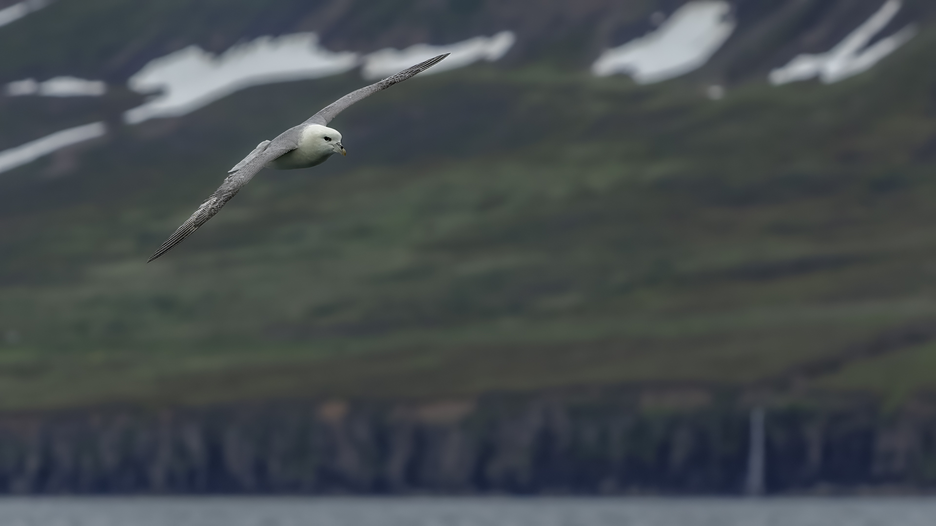 Na loty fulmarów można patrzeć bez końca. Przepięknie szybują. Widziałem na Islandii wiele kolonii fulmarów, a ich populacja jest szacowana na Islandii na milion par (2014). Nie są płochliwe i łatwość ich fotografowania nad brzegiem morza kojarzy mi się tylko z naszą mewą śmieszką, której fotografowanie jest w Polsce podobnie proste. Mowa oczywiście o zdjęciach statycznych. Zdjęcia ptaka w locie, to już inna sprawa. Szkła o średniej ogniskowej zdecydowanie lepiej się sprawdzają i pozwalają  osiągnąć lepsze efekty. Fulmar należy do rodziny burzykowatych, jego rozpiętość skrzydeł może przekraczać jeden metr a masa ciała może osiągać 700 gramów.