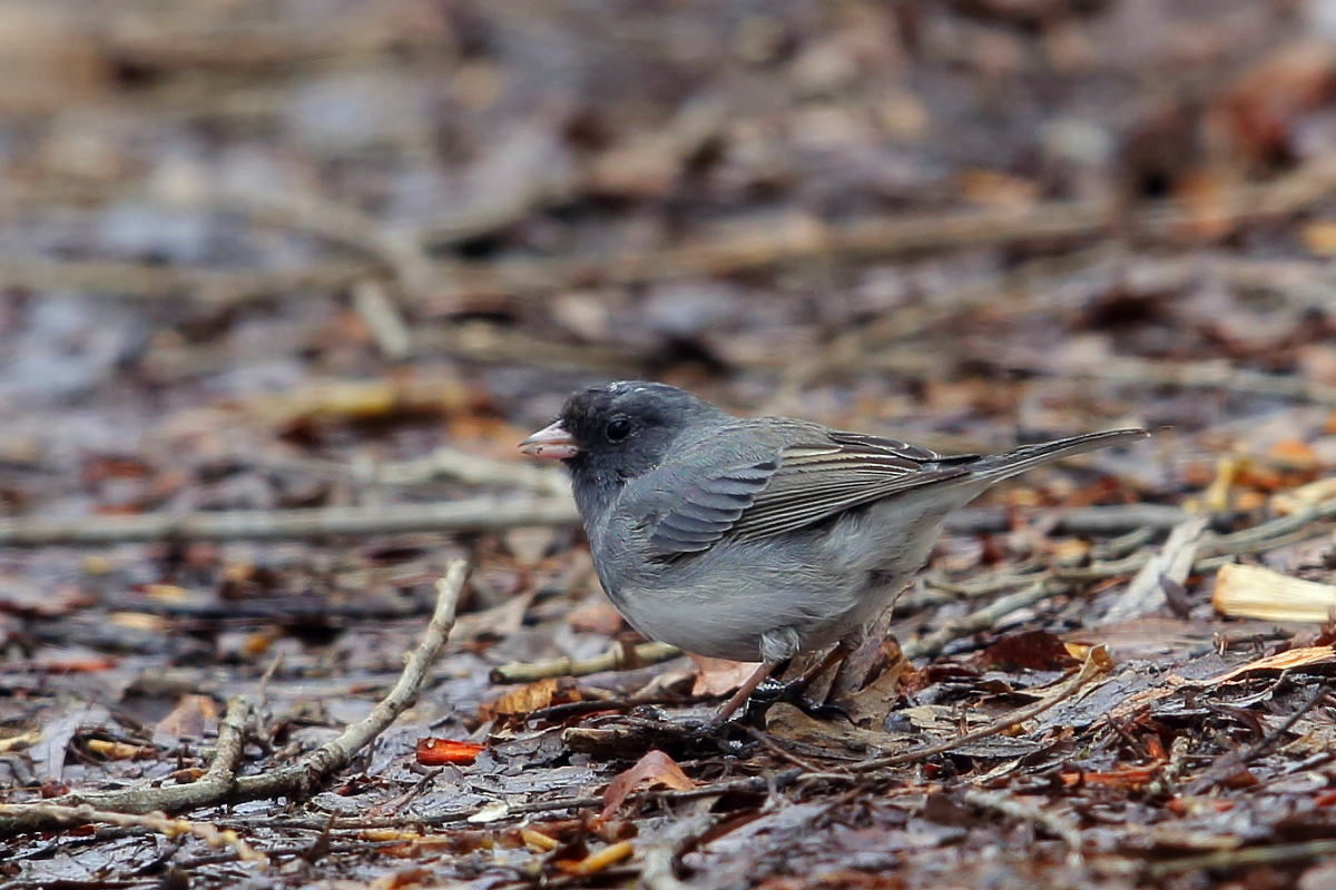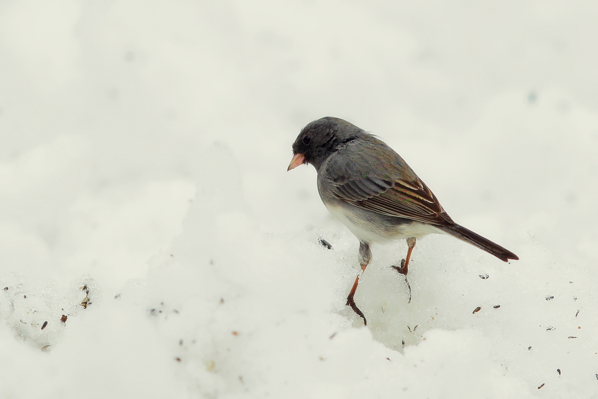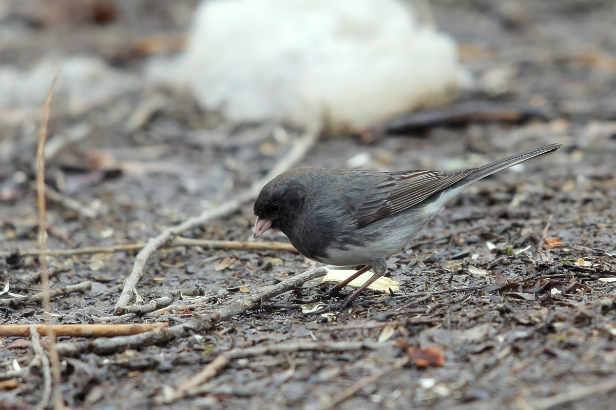Nieco mniejszy od wróbla junko dał się sfotografować w Kanadzie w tylko jednym miejscu. Południowe, „ostre” słońce nie było najlepszym sprzymierzeńcem do wykonania satysfakcjonujących zdjęć. Szukając w internecie informacji o tym ptaku przeczytałem, że bardzo rzadko zalatuje do Polski i jak większość ptaków w Polsce jest pod ścisłą ochroną. W zachowaniu i barwach porównałbym go do naszego kopciuszka, z tą różnicą że ubarwienie ogona u kopciuszka jest rdzawego koloru, u junko brzuszna strona tułowia jest koloru białego, wierzchnia szaro lub czarna. Ciekawym jest, jak się to zdarza, że czasami zalatuje do Polski. Przeprawa przez ocean jest nie lada wyzwaniem, nawet dla najlepszych szybowników. Najczęściej oni jednak, są przedstawicielami ptactwa wodnego i mogą pozwolić sobie na odpoczynek na wodzie. Junko należy do wróblowatych i taki odpoczynek na wodzie, były pewnie dla niego wiecznym odpoczynkiem. Trzeba będzie sprawdzić te informacje. Jak je uzyskam to uzupełnię niniejsze lub je sprostuję...