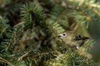 Siedząc na ambonie i wyczekując na jelenie za plecami w świerkach było słychać odgłosy mysikrólików. Nie odmówiłem sobie tej przyjemności, aby spróbować, po raz kolejny, uwiecznić tego najmniejszego ptaka Europy. A jest to nie lada sprawdzian zręczności dla fotografa. Dłuższy obiektyw zmniejsza kadr, z którego co chwila znika mysikrólik. Mniejsza ogniskowa to łatwiejsze podążanie za "celem", ale nie zawsze autofocus nadąży ustawić ostrość, a jak nadąży to istnieje potrzeba kadrowania i to nieraz znacznego. Do tego dodać należy, że mysikróliki występują w gęstych lasach, gdzie dociera niezbyt dużo światła nawet w słoneczne dni. Przy takich warunkach wykonywania zdjęć postawiłem na wykonanie kilku zdjęć, ale za to z niewielkim kadrowaniem. Zanim zlokalizowałem mysikrólika i skierowałem obiektyw, to przed ustawieniem ostrości, ptak znikał już z kadru. Kilka razy zwalniając spust  migawki aparatu, pojawiał się  czysty, "bez-ptasi" kadr. Ale po niecałej godzinie, nie ma co narzekać, udało się zrobić kilka godnych galerii zdjęć. Wschodzące słońce miało ciepłą żółtą barwę, aż za żółtą jak na moje upodobania. Niemniej jednak takich zbliżeń mysikrólika jeszcze nie udało mi się wykonać, jak te z rykowiska, dlatego zasiliły galerię. Zapraszam (zbliżenia na świerku o żółtawym zabarwieniu).