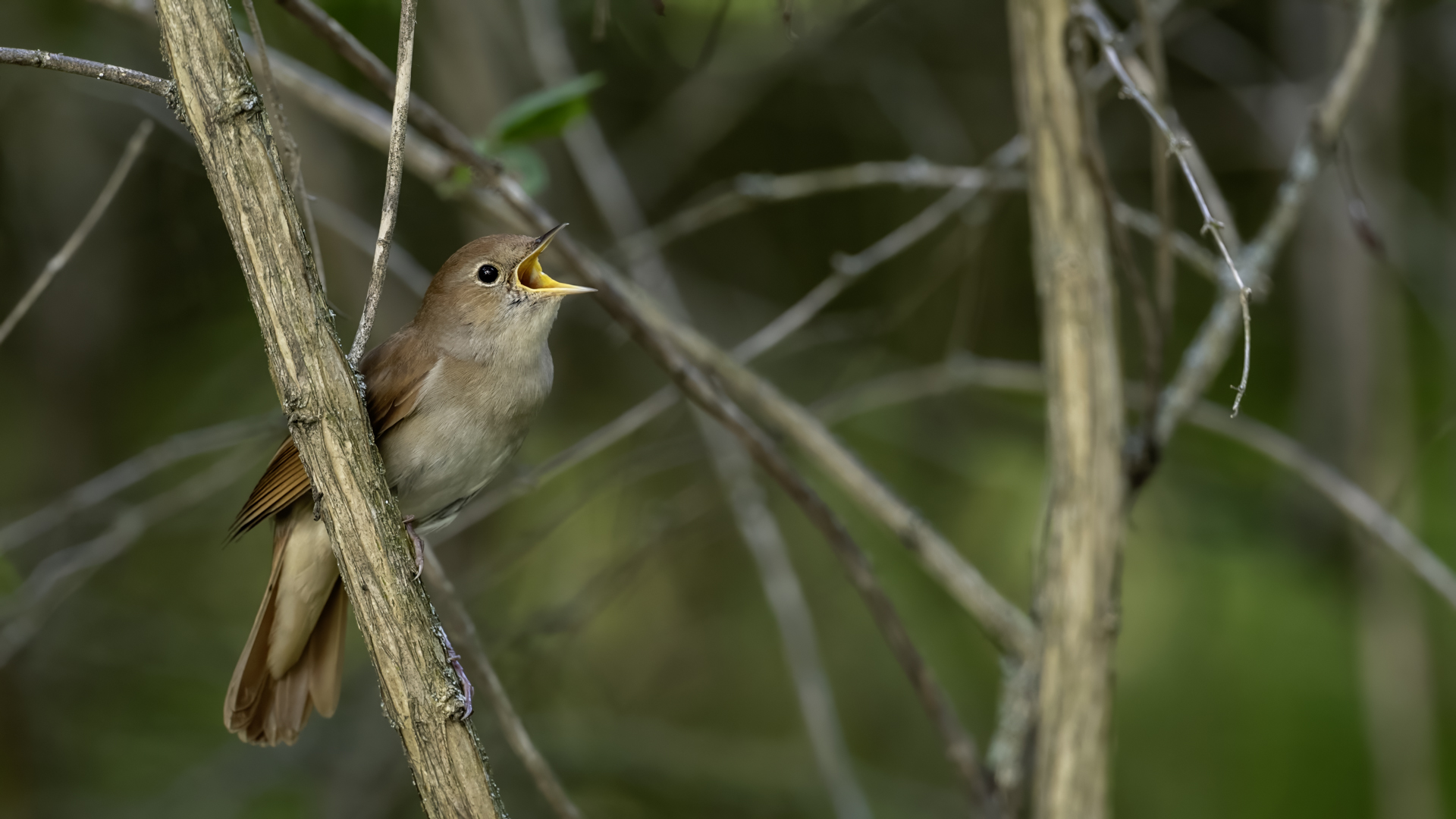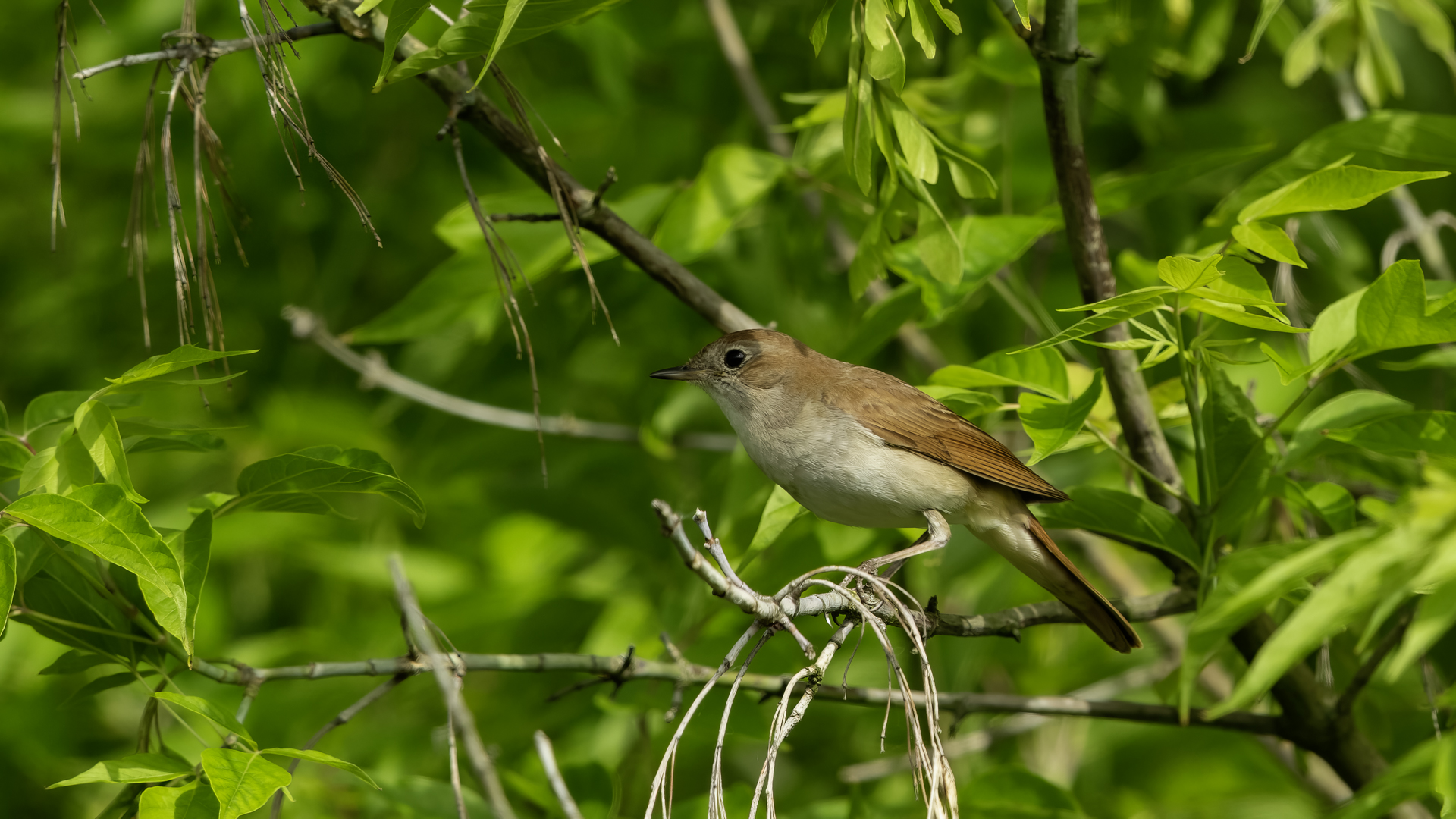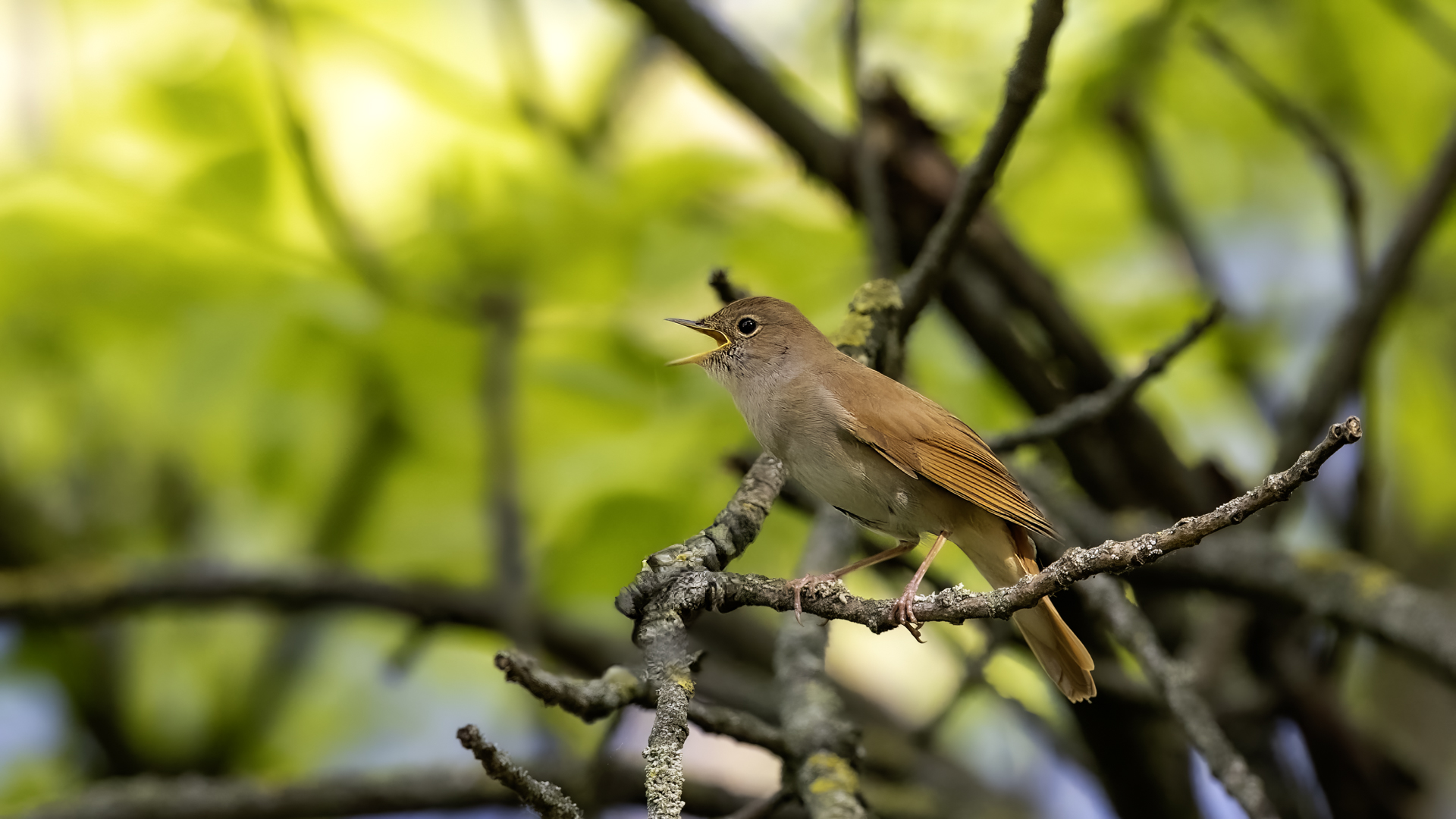 Między polami płynie rów, a miedzy jednym i drugim polem niewielki lasek, a właściwie kępa drzew i krzewów. Zatrzymałem się, bardzo powoli się poruszam, obserwuję licząc, że nagle zauważę zimorodka, bo podobno bywa w tych okolicach. Zadrzewienia, gałązki nad dość czystym rowem wydawać się potwierdzają tę wskazówkę. Trochę czasu, trochę szczęścia, a może pecha i udało się sfotografować … słowika rdzawego. Rzeczywiście jego śpiew jest nietuzinkowy i odmienny. Siedzi dostojnie na gałęzi i śpiewa pełną piersią pokazując wewnętrzną, żółtą barwę swego dzioba. Słowik rdzawy to niewielki ptak, wagą mniejszy od wróbla o rozpiętości skrzydeł około 25 cm, ale za to jak śpiewa!