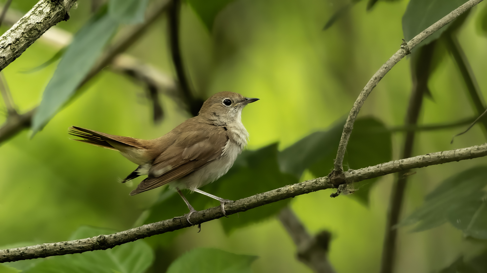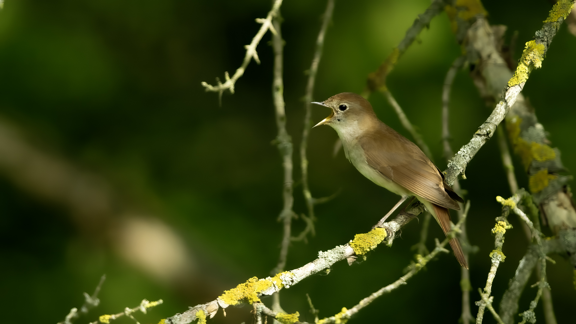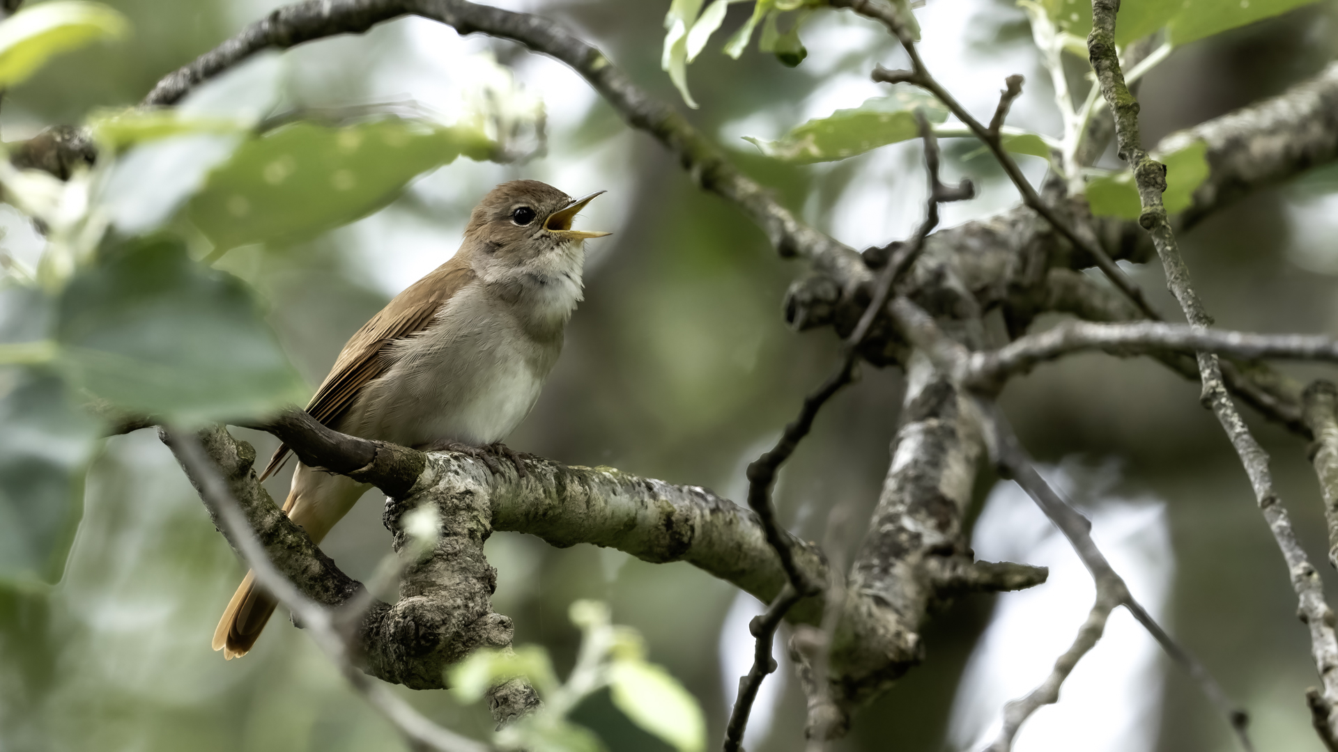 Między polami płynie rów, a miedzy jednym i drugim polem niewielki lasek, a właściwie kępa drzew i krzewów. Zatrzymałem się, bardzo powoli się poruszam, obserwuję licząc, że nagle zauważę zimorodka, bo podobno bywa w tych okolicach. Zadrzewienia, gałązki nad dość czystym rowem wydawać się potwierdzają tę wskazówkę. Trochę czasu, trochę szczęścia, a może pecha i udało się sfotografować … słowika rdzawego. Rzeczywiście jego śpiew jest nietuzinkowy i odmienny. Siedzi dostojnie na gałęzi i śpiewa pełną piersią pokazując wewnętrzną, żółtą barwę swego dzioba. Słowik rdzawy to niewielki ptak, wagą mniejszy od wróbla o rozpiętości skrzydeł około 25 cm, ale za to jak śpiewa!