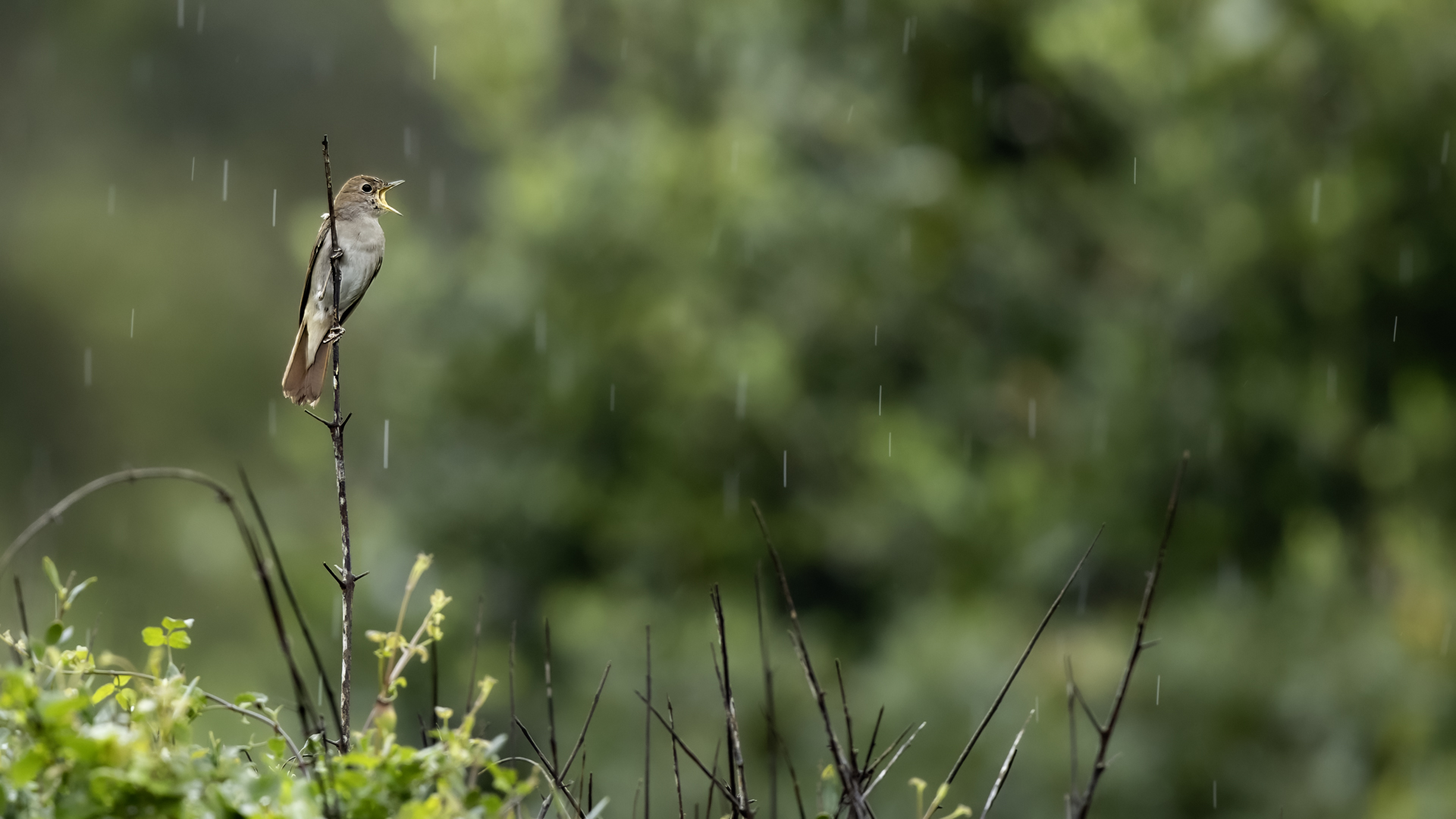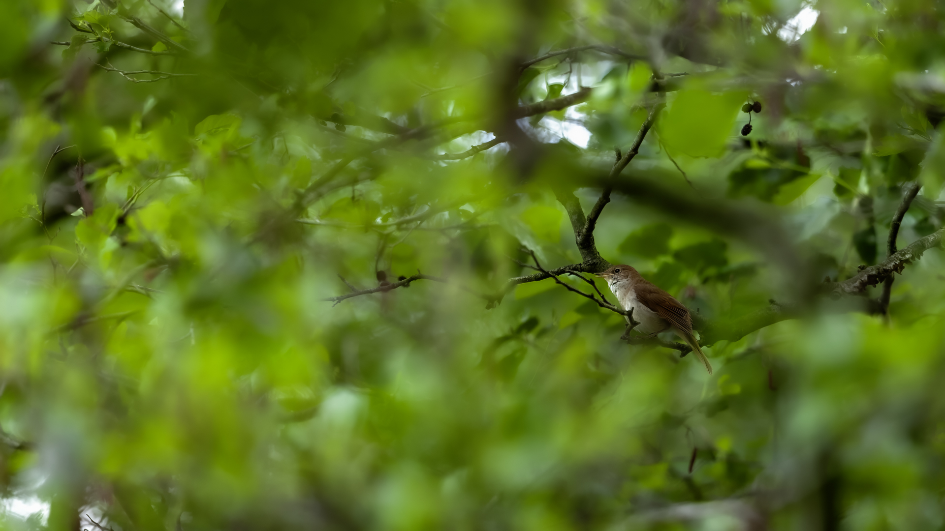 Moje drugie spotkanie ze słowikiem rdzawym przyniosło radykalne zmiany galerii. Słowik miał swoje ulubione miejsca z których rozbrzmiewała jego pieść na całą okolicę. Z nagraniem dźwięku nie było problemu. Niestety nieopodal usytuowana była ruchliwa droga i trudno było nagrać czysty dźwięk, pozbawiony zurbanizowanego akustycznie tła. Swoją drogą zachowanie słowika jest dość dziwne jak na konieczność posiadania skutecznej strategii przetrwania. Fotografowałem słowika blisko dwie godziny. Słowik śpiewał cały czas, dając gęsiorkowi wskazówki o swoim położeniu. Tylko podczas moich obserwacji zaatakował słowika dwa razy. Słowik wprawdzie jest wytrawnym śpiewakiem, ale nie zamyka oczu podczas śpiewu i tak naprawdę jest cały czas czujny. Nie tak dawno fotografowałem brzęczkę, której monotonny śpiew w dłuższym kontakcie jest nie do wytrzymania. Ze słowikiem odwrotnie. Śpiewa urozmaicając swoją pieśń, którą można słuchać i słuchać... Może jeszcze będzie okazja do poprawienia ścieżki dźwiękowej, która dla tego gatunku jest ważniejsza niż zwykle.