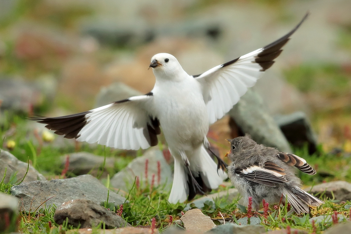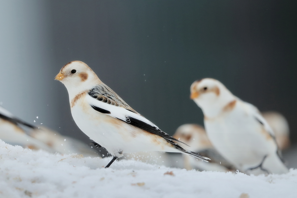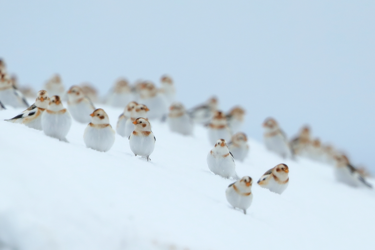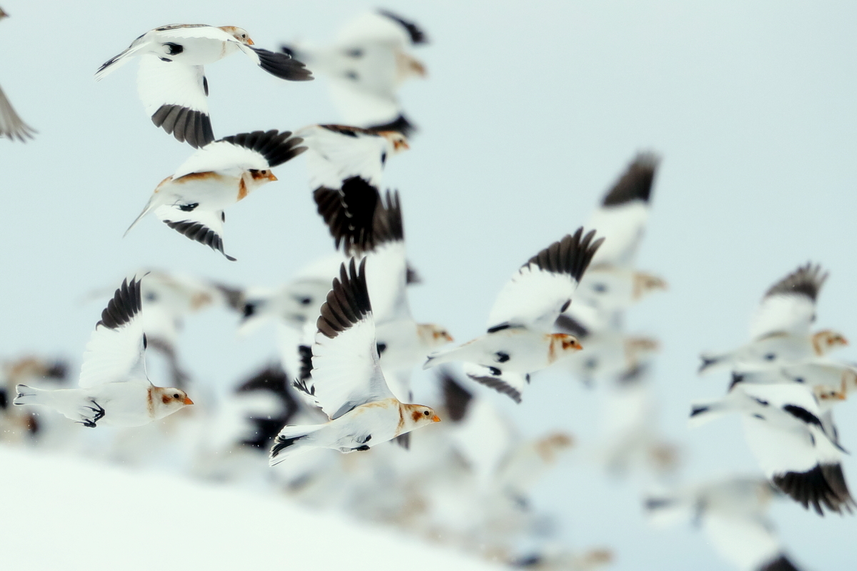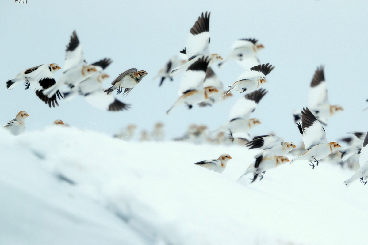 Nie było problemu ze znalezieniem śnieguły na Spitsbergenie. W samej miejscowości Longyearbyen niczym wróble poszukiwały pożywienia na chodnikach wśród przechodniów. Jest jedynym przedstawicielem wróblowatych, żyjącym na dalekiej północy. Jedynym śpiewającym ptakiem, który ożywia ten surowy, mroźny klimat. Dlaczego upodobał sobie tak nieprzyjazne, trudne środowisko, wiedząc, bo przecież na zimowiska migruje w strefy umiarkowane, że są miejsca, gdzie byłoby łatwiej przeżyć? Trudno powiedzieć. Obserwując go podczas karmienia podlotów, udało się wykonać kilka ciekawych ujęć samca śnieguły, i to w szacie godowej, o którą byłoby trudno podczas przelotów w Polsce. Tak jak ze zdjęciami nie było problemów, także z nagraniem głosu nie było kłopotu. Śnieguły lubiły się odzywać i co jakiś czas dało się usłyszeć ich pieśń, której można w tej galerii posłuchać.
